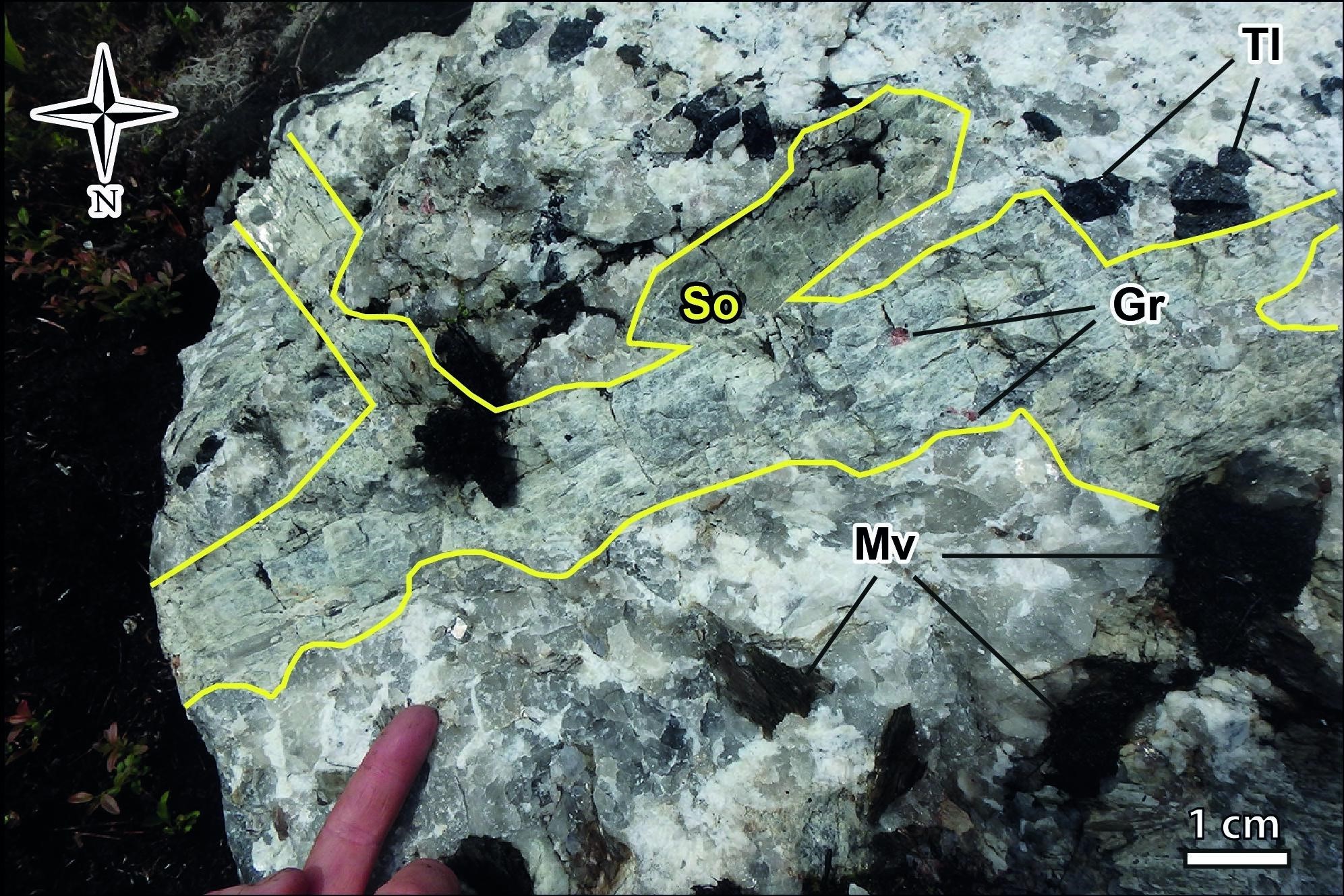 Un bloc de pegmatite à spodumène (cristaux centimétriques à décimétriques), tourmaline, muscovite et grenat (2016-AB-1220) a été échantillonné dans la CRVHE. Un échantillon choisi (2016054398) a donné des valeurs indicielles de 1,21 % Li (2,6 % LiO2) et des valeurs anomales en Be (247 ppm), Ta (101 ppm), Nb (92,4 ppm), Cs (261 ppm) et Sn (54 ppm). La source probable de ces blocs serait la Suite de Wahemen localisée au nord de la séquence volcanique. Cette unité de plus de 100 km de long est composée de granite et pegmatite hyperalumineux de type S à muscovite, biotite, grenat, tourmaline, magnétite et apatite. Elle constitue une cible de premier choix pour la recherche des métaux rares (Li, Be, Ta) en raison notamment de sa proximité avec une ceinture de roches volcano-sédimentaires d’âge archéen. La CRVHE contient déjà l’indice Pegmatite Ruby Hill West (2,19 % Li; Frappier-Rivard, 2017). Elle correspond possiblement au prolongement de la ceinture de roches vertes de la Moyenne et de la Basse-Eastmain (CRVMBE), aux abords de laquelle se trouve le gîte Cyr-Lithium, ou encore du Groupe du Lac des Montagnes qui contient le gîte de Whabouchi.