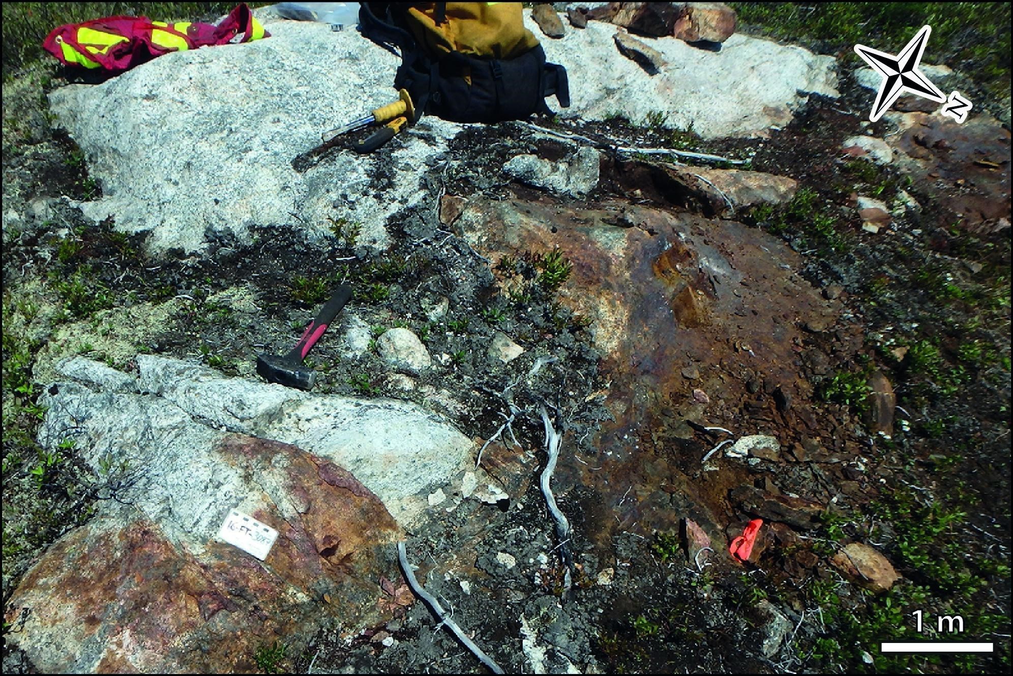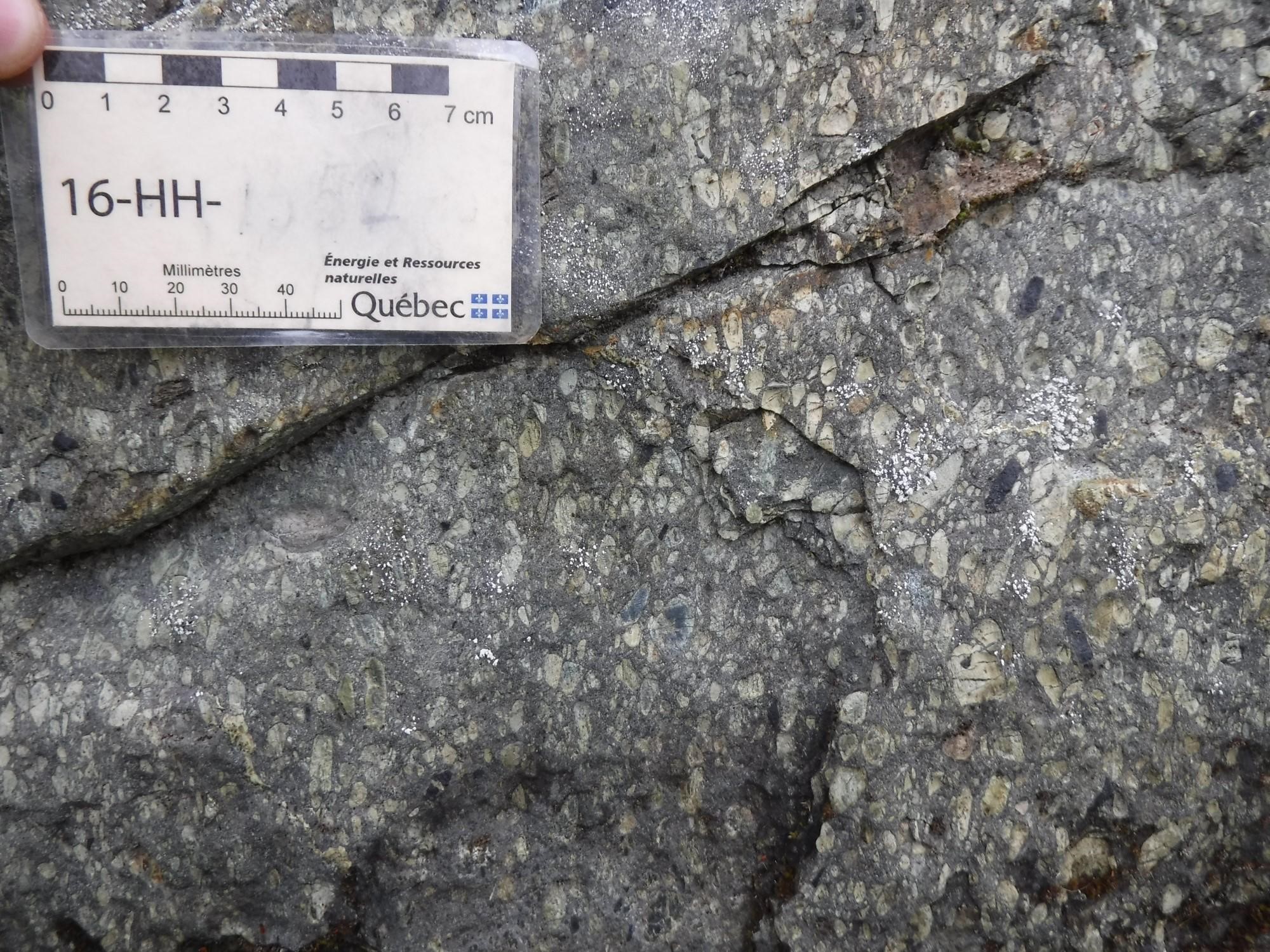 En dehors de la CRVHE, le contact entre les sous-provinces d’Opinaca et de La Grande correspond à un métallotecte important bien connu pour les minéralisations aurifères. C’est notamment le cas de la mine Éléonore, située à la limite SW de l’Opinaca. Ce contact est difficile à identifier dans la région à l’étude, mais des minéralisations aurifères ont été observées le long du contact présumé, dont l’indice Éch. S716716 avec 1,39 ppm Au dans le Complexe de Laguiche. Dans la Formation de la Rivière Salomon, au nord du contact, l’échantillon 2016-FT-3056E correspond à une veine de quartz contenant des porphyroblastes de grenat localisée au contact d’une injection granitique et d’un paragneiss coupé par une intrusion ultramafique. Cet échantillon a rapporté une valeur anomale en or (182 ppb). Toujours le long de ce même contact, l’échantillon 2016-FT-3087B, prélevé dans une zone (5 m x 1 m) à sulfures oxydés en périphérie d’un paragneiss migmatitisé coupé par une injection granitique, titre 4 ppm Ag, 45 ppb Au et 18,7 % S.