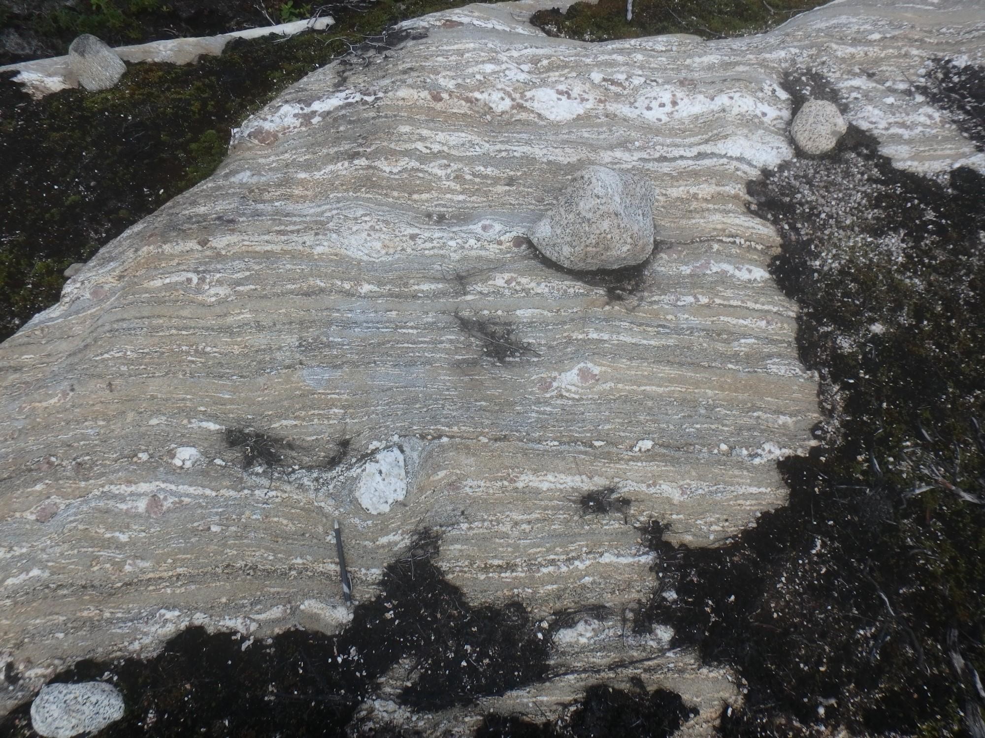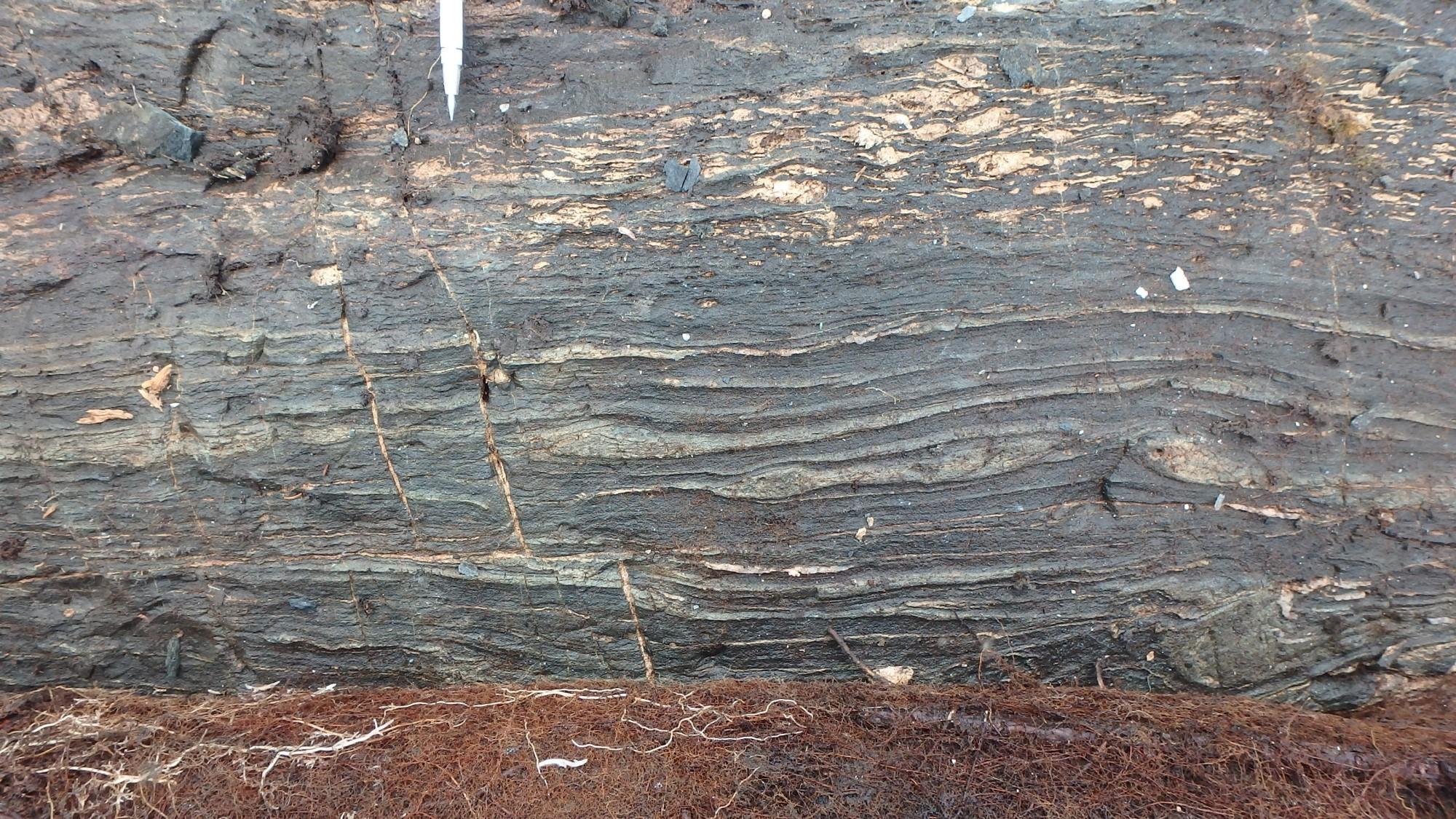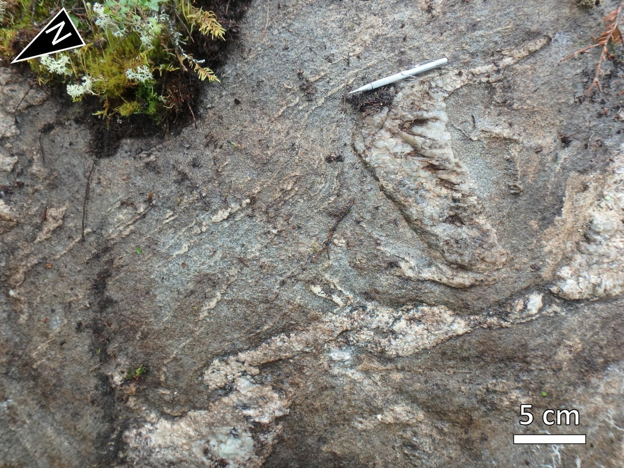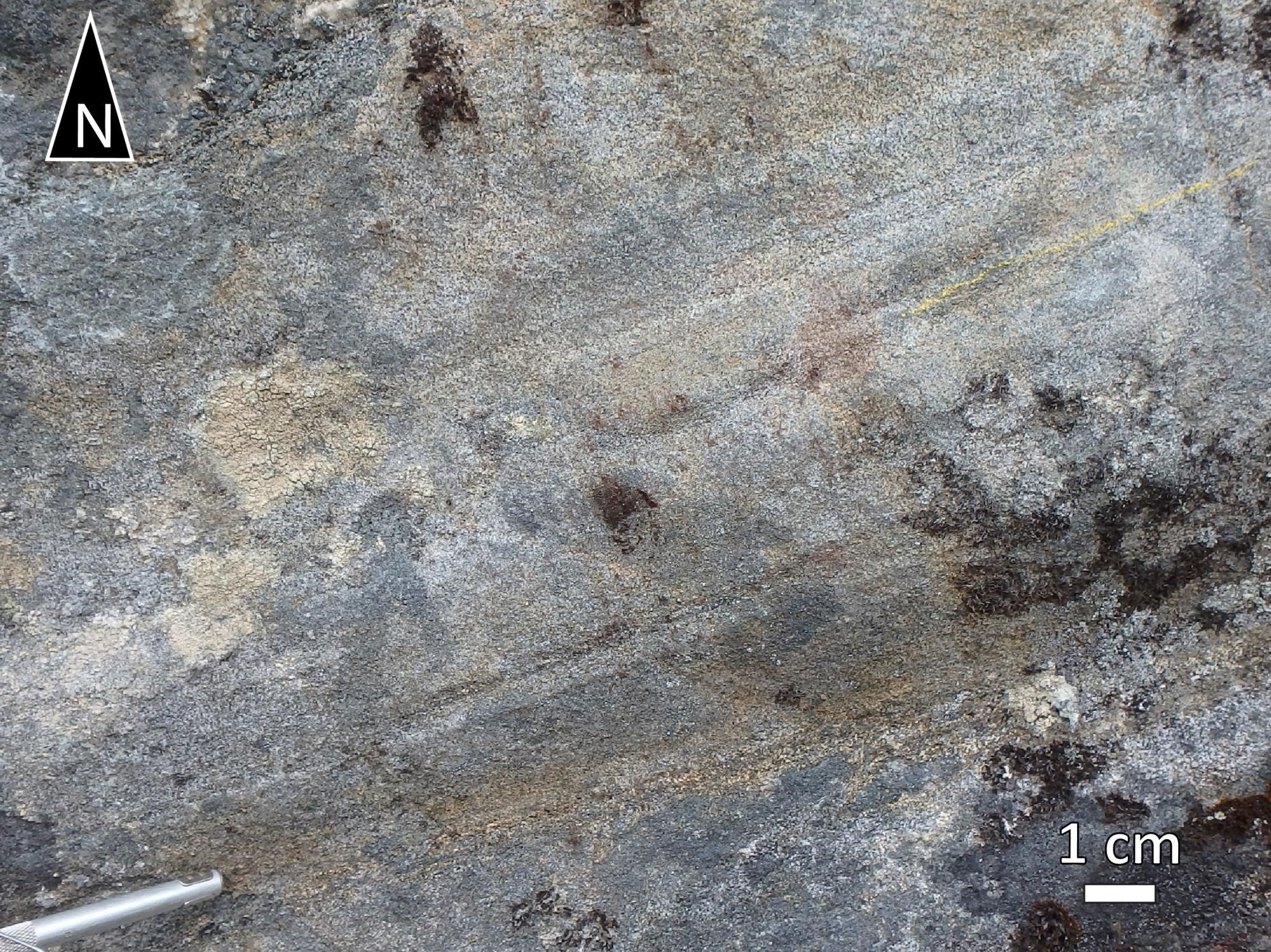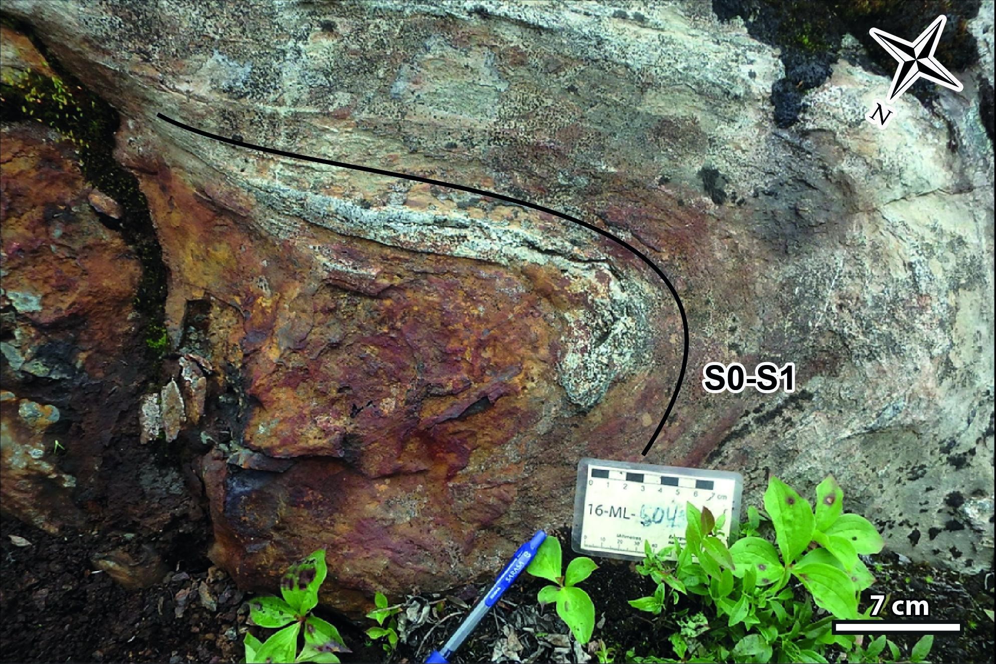 Le litage primaire (S0) a été rarement observé dans la région cartographiée, contrairement aux autres branches de la CRVHE où de nombreuses évidences de polarité sont répertoriées dans les basaltes (Beauchamp et al., 2018; Beauchamp, 2020). La stratification dans la CRVHE a été principalement identifiée grâce à l’alternance des faciès volcaniques (p. ex. passage d’un basalte coussiné à une coulée massive). Une polarité inverse vers le nord a été interprétée grâce à l’orientation des pédoncules dans une séquence de basalte coussiné de la Formation de Roman. Les fortes signatures magnétiques des unités de formation de fer marquent bien la stratification. Dans les roches métasédimentaires des sous-provinces d’Opinaca et de La Grande, les structures primaires ont généralement été complètement oblitérées par la déformation et la recristallisation associée au métamorphisme. Très localement, on y observe un pseudo-rubanement de composition marqué par une alternance de lits plus fins (argileux) et de bancs plus grenus (gréseux) dans les roches sédimentaires les moins affectées par les processus de recristallisation et de fusion partielle. Les contacts lithologiques sont généralement transposés dans le sens de la foliation régionale principale.