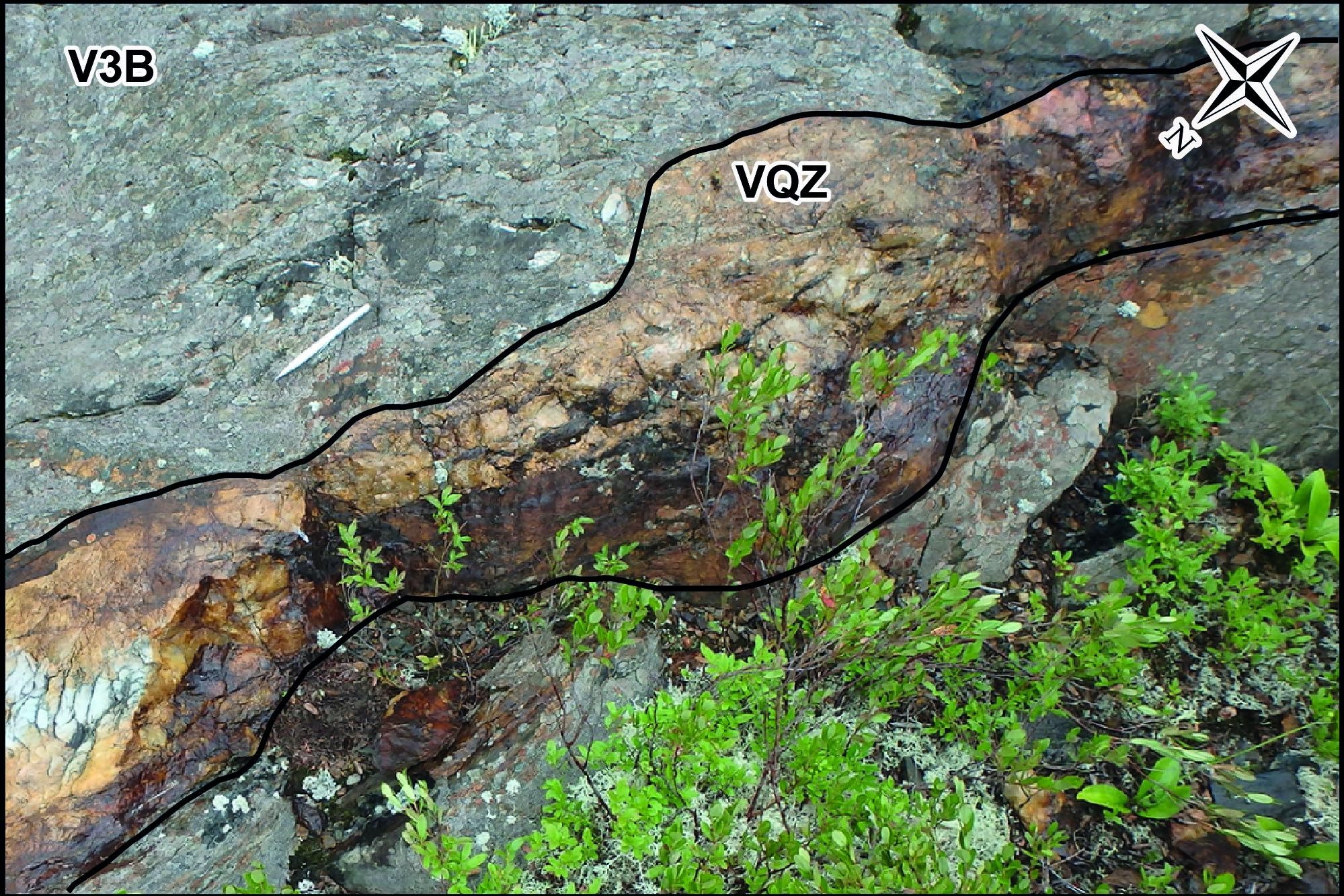 Des zones rouillées schisteuses, cisaillées et fortement oxydées se trouvent à proximité de zones de cisaillement et sont possiblement associées à la circulation de fluides dans ces structures. Par exemple, l’échantillon 2016-AB-1162B, associé à une zone de cisaillement NE-SW dans la partie nord de la CRVHE, est composé de 1 à 5 % de pyrite-pyrrhotite disséminées ou en amas dans un mudrock encaissé dans des basaltes. Il titre 77 ppb Au et 5,35 % S. L’échantillon 2016-SB-4164D (257 ppb Au et 4,01 % S) provient d’une zone rouillée diffuse et discontinue (10 sur 40 cm d’épaisseur) dans un basalte cisaillé. Elle est caractérisée par une minéralisation de pyrite-pyrrhotite disséminées et en amas. Des valeurs cuprifères significatives à anomales, incluant l’indice Lac Léran-Sud (0,54 % Cu), ont été identifiées dans des basaltes fracturés et altérés le long d’une zone de cisaillement E-W dans la partie est de la CRVHE (Zone 4).