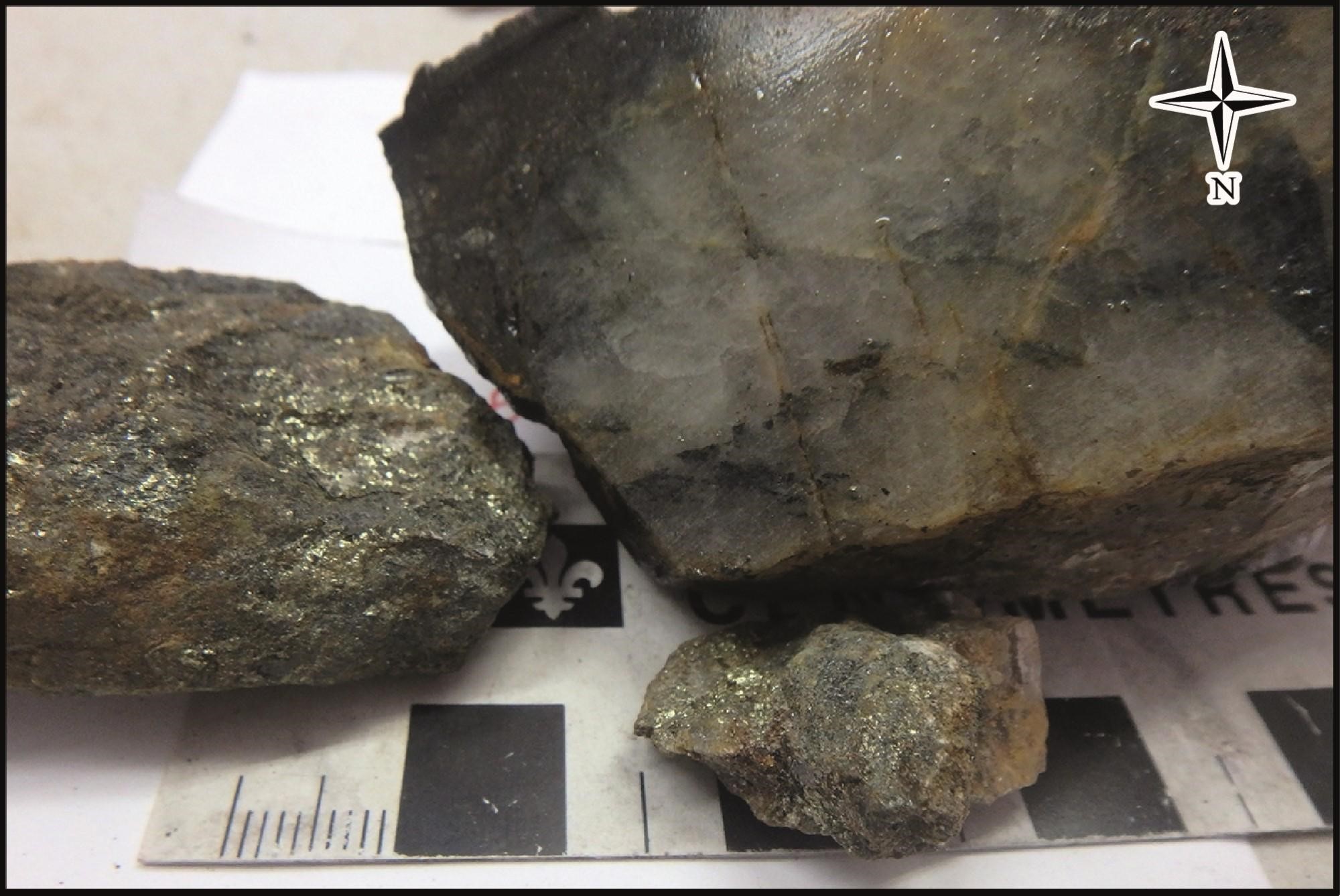 | Éch. 7286 | 1031 ppb Au (G); 1202 ppm Cu (G); 2130 ppm Zn (G) |