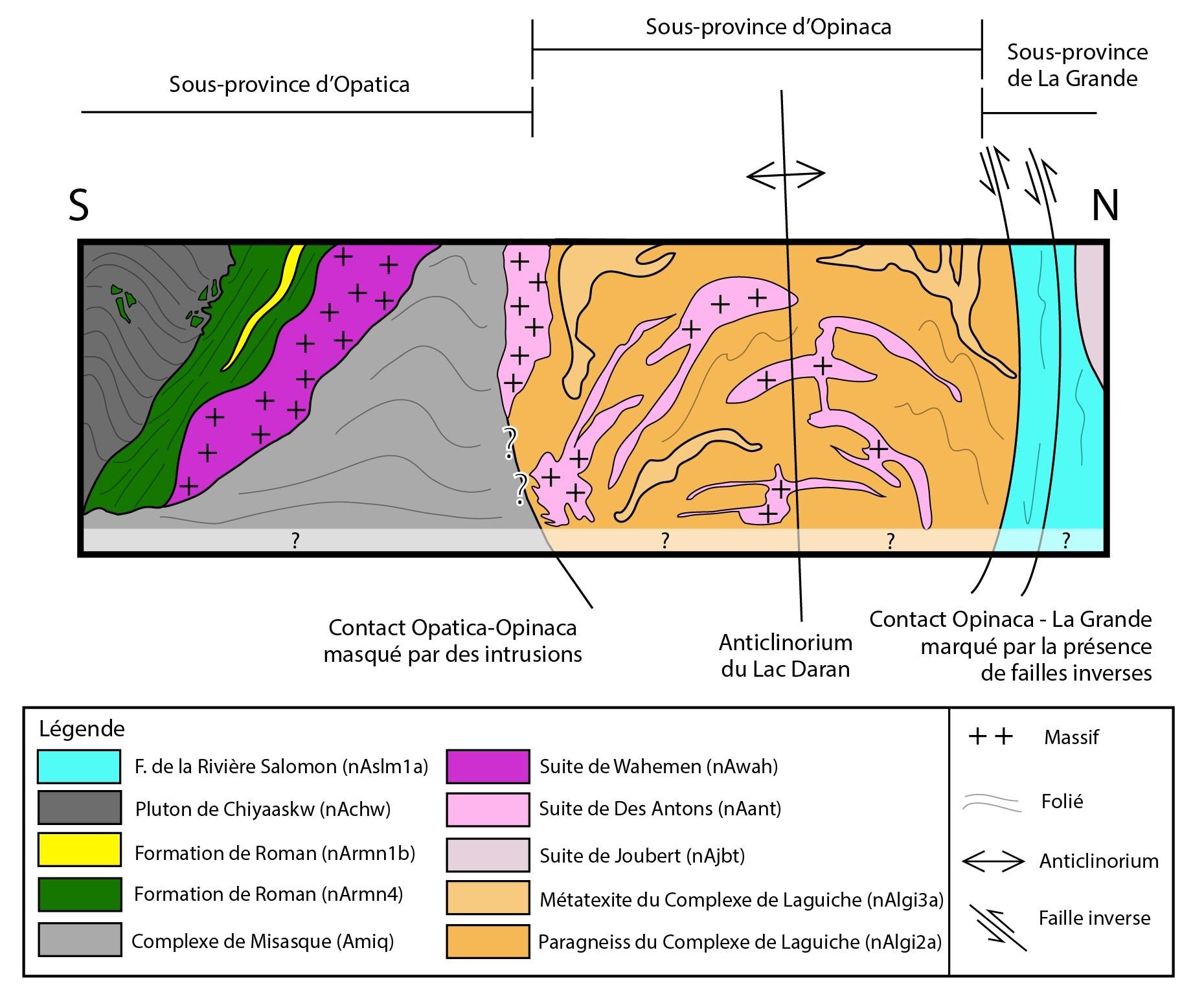 La position du contact entre les sous-provinces de La Grande et d’Opinaca est encore l’objet de discussions dans la région à l’étude. Cette limite est placée actuellement à l’interface entre la Formation de la Rivière Salomon et le Complexe de Laguiche. Toutefois, les roches métasédimentaires de ces deux unités sont plus ou moins similaires et cette limite est également sujette à interprétation. Selon Hammouche et Burniaux (2018), quelques caractères distinctifs permettent de les distinguer : les paragneiss de l’Opinaca sont variablement migmatitisés, contiennent presque systématiquement de l’orthopyroxène, sont fortement recristallisés et présentent un protolite toujours arkosique, alors que les paragneiss de la Sous-province de La Grande sont peu migmatitisés, contiennent rarement de l’orthopyroxène, possèdent une texture granoblastique moins bien définie et peuvent aussi avoir un protolite quartzitique.