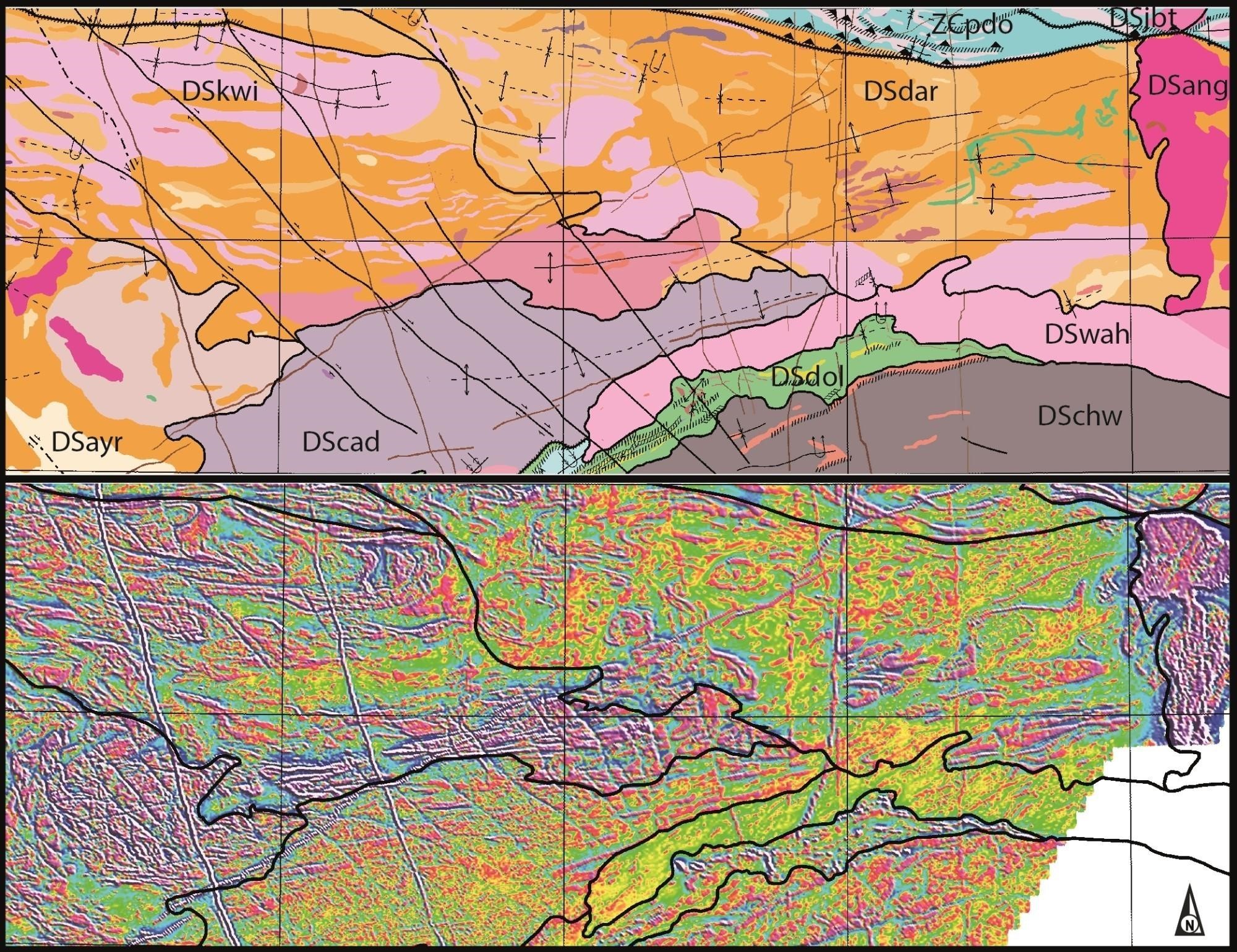 La région cartographiée est divisée en une dizaine de domaines structuraux à partir de leurs signatures magnétiques uniques et de l’orientation générale des foliations et des linéations.