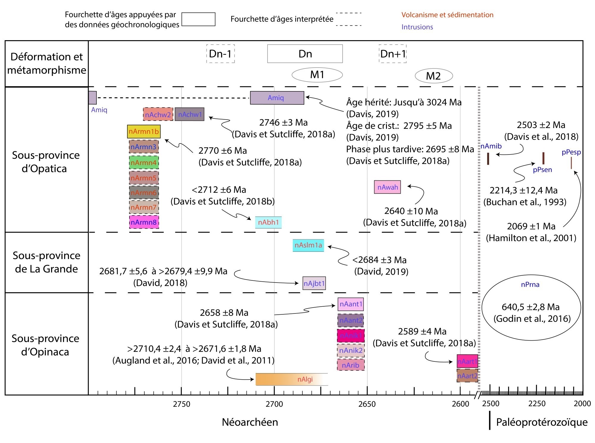 La Sous-province d’Opinaca est largement dominée par les roches du Complexe de Laguiche. Ce bassin sédimentaire de grande dimension présente une grande variété d’âges de déposition, allant de >2712,3 ±2,4 Ma à >2671,6 ±1,8 Ma (David, 2019; David et al., 2011). Dans la région à l’étude, un âge maximal de déposition de 2698 ±18 Ma (2016-HH-1654; Davis et Sutcliffe, 2018a) a été obtenu pour un échantillon de paragneiss prélevé à proximité du Complexe de Misasque, soit au sud de la partie orientale du Complexe de Laguiche. Au nord, cet âge devrait se rapprocher de celui de la Formation de la Rivière Salomon (<2684 ±3 Ma). Toujours dans la région à l’étude, l’âge de cristallisation d’un granite issu de la fusion partielle de roches métasédimentaires permet d’estimer l’âge minimal de déposition du Laguiche à 2674 ±5 Ma (2016-AS-6666; Davis et Sutcliffe, 2018a).