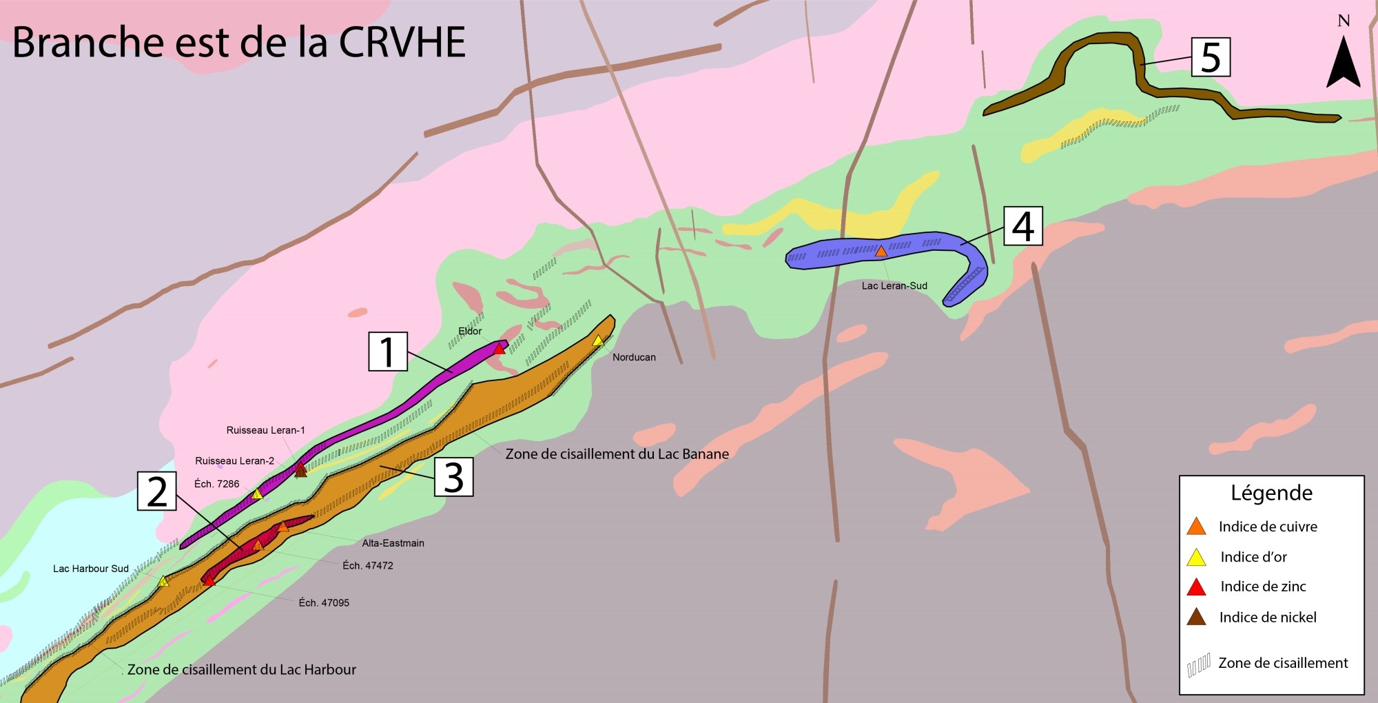 La branche est de la CRVHE se caractérise par une forte déformation; on y trouve des zones plissées ainsi que de nombreuses zones de cisaillement qui constituent d’importants métallotectes pour de nombreuses substances. Deux de ces zones présentent une importance majeure, soit les zones de cisaillement du Lac Harbour et du Lac Banane. Le nombre important d’indices spatialement rattachés à ces zones de cisaillement majeures NE-SW indique un contexte métallogénique favorable qui rappelle celui des structures de même direction du camp minier de Chibougamau, plus particulièrement la Zone de cisaillement NE-SW de Henderson-Portage (Lacroix, 1998). Dans cette structure parallèle à la zone de cisaillement NE-SW dextre du Lac Doré-McKenzie, des veines massives à pyrite-chalcopyrite-pyrrhotite-magnétite ont été exploitées pour le cuivre et l’or dans les mines Henderson I, Henderson II et Portage (Pilote et al., 1996).