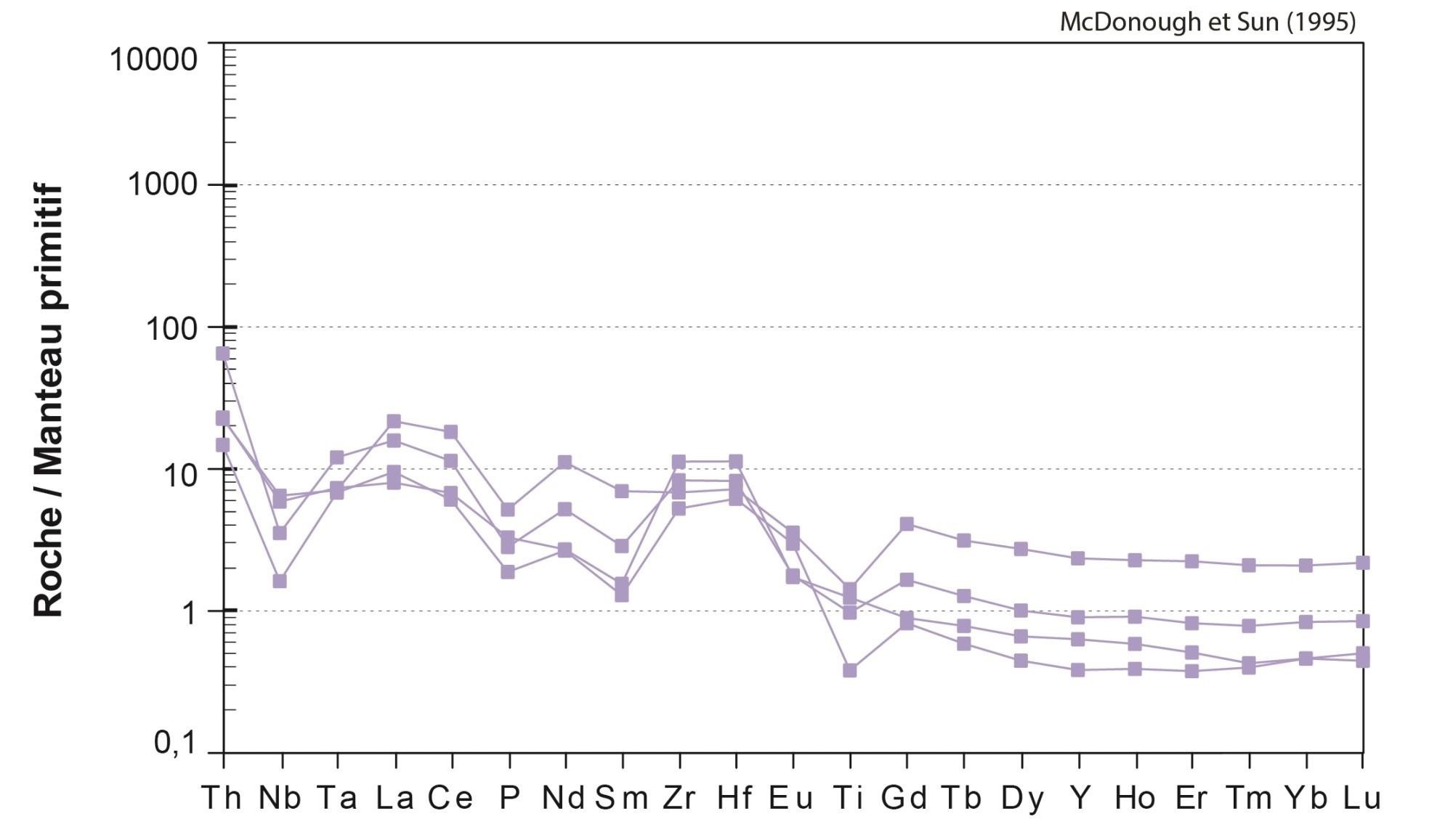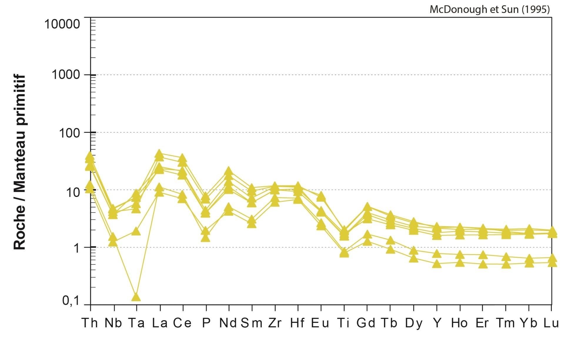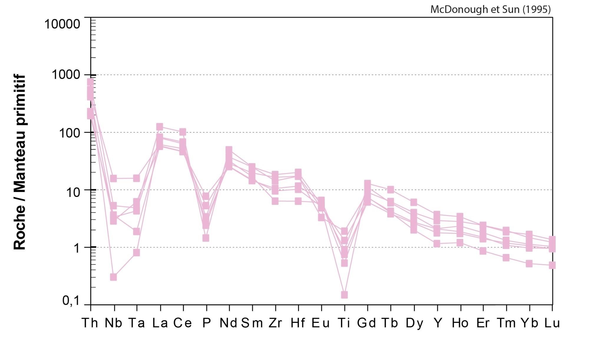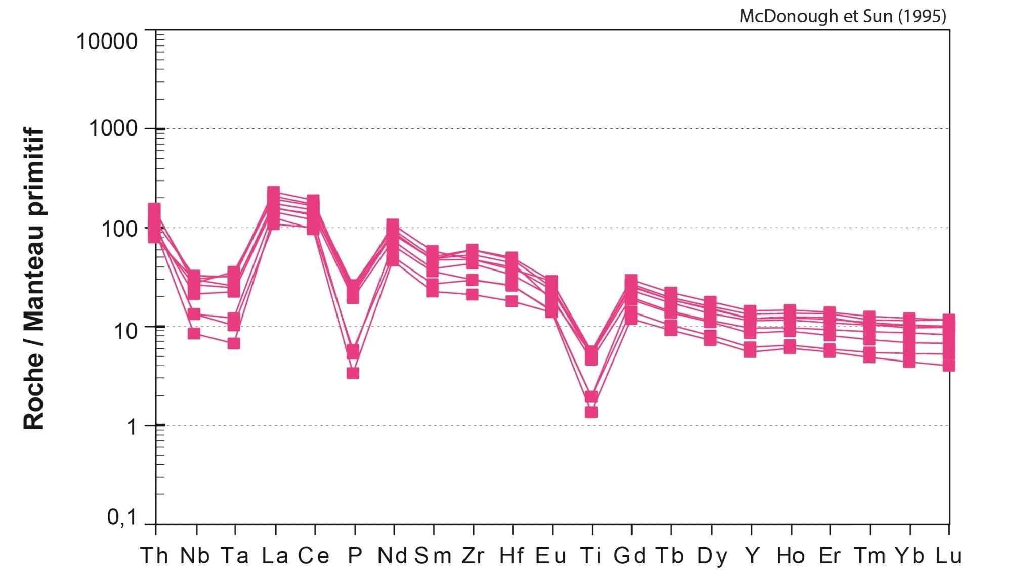 Fortes anomalies négatives en Nb, Ta, P et Ti |