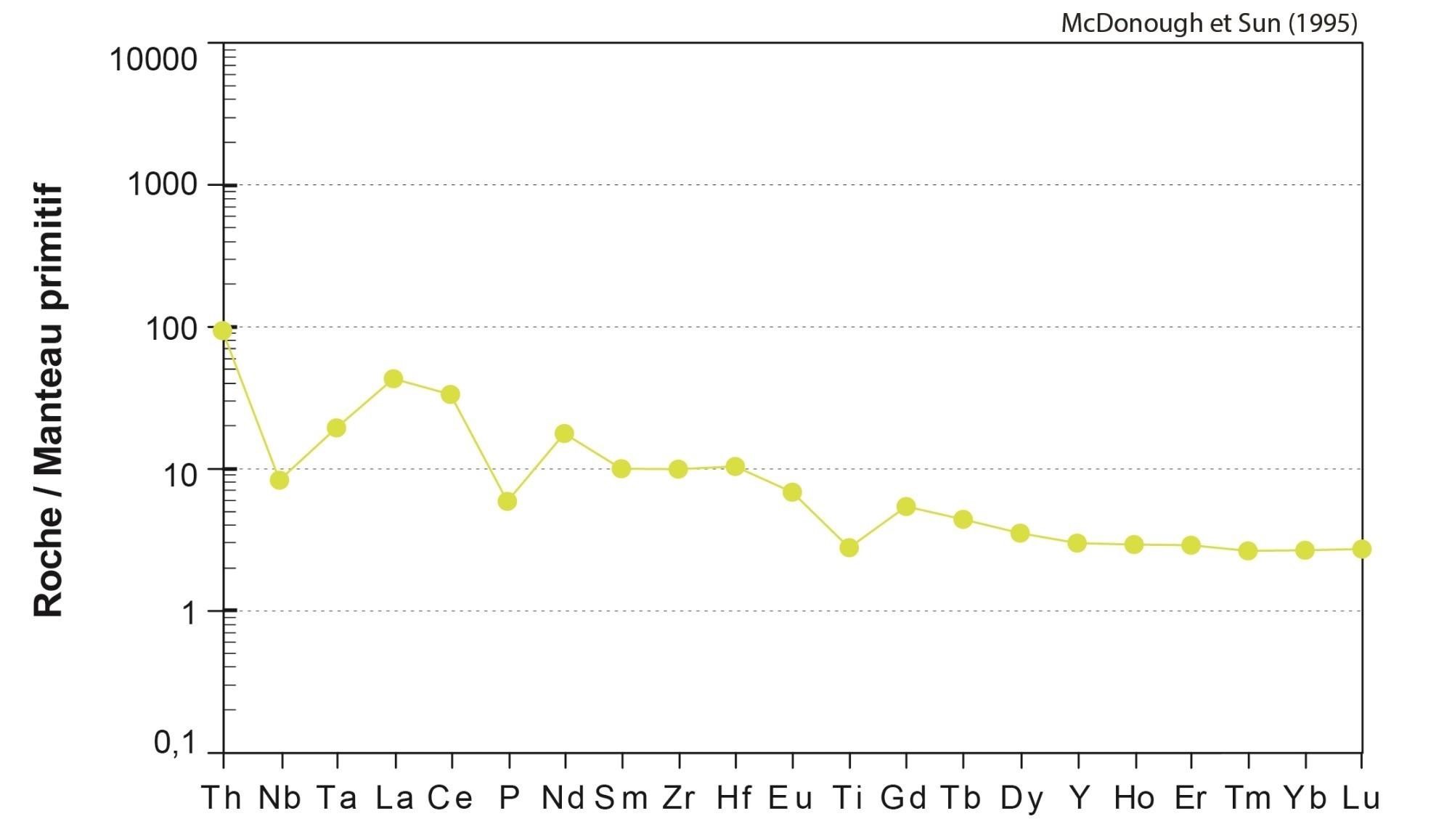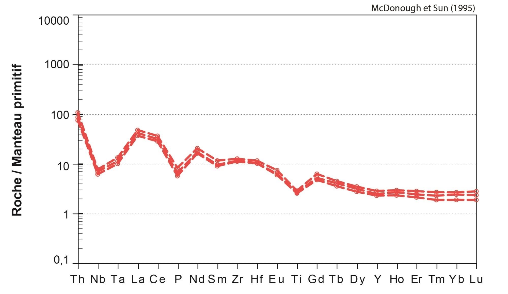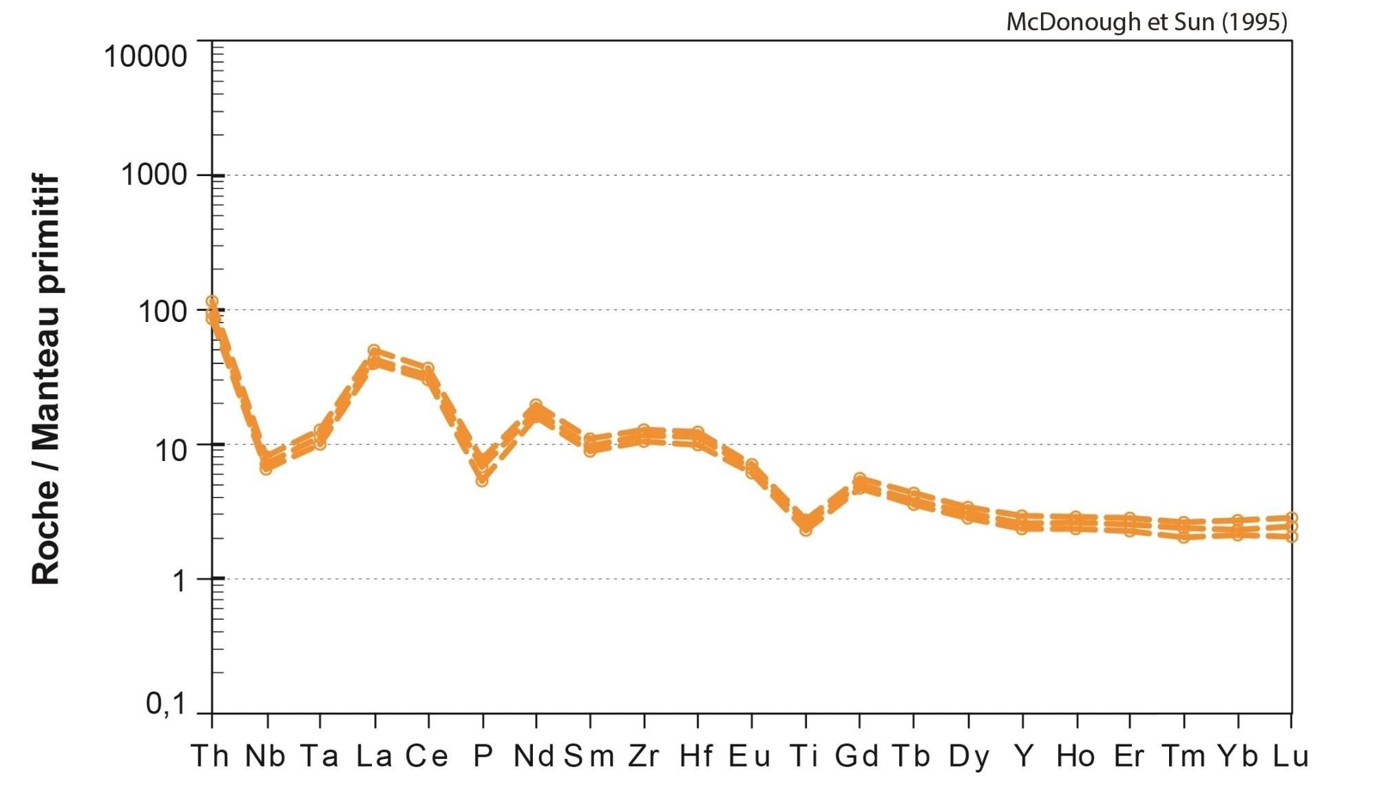 Fortes anomalies négatives en Nb, Ta, P et Ti |