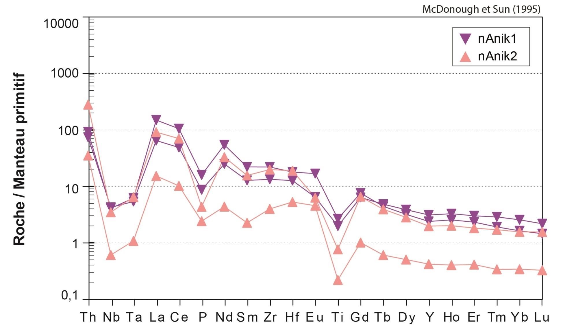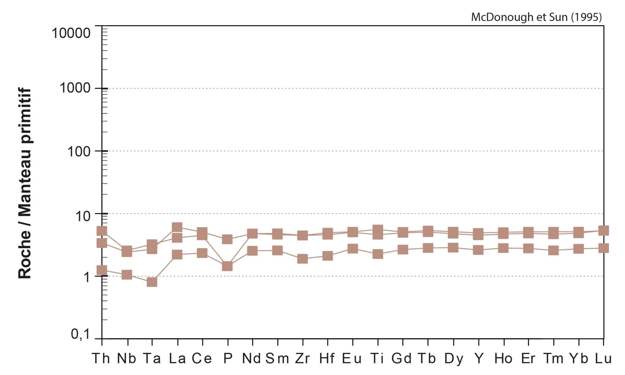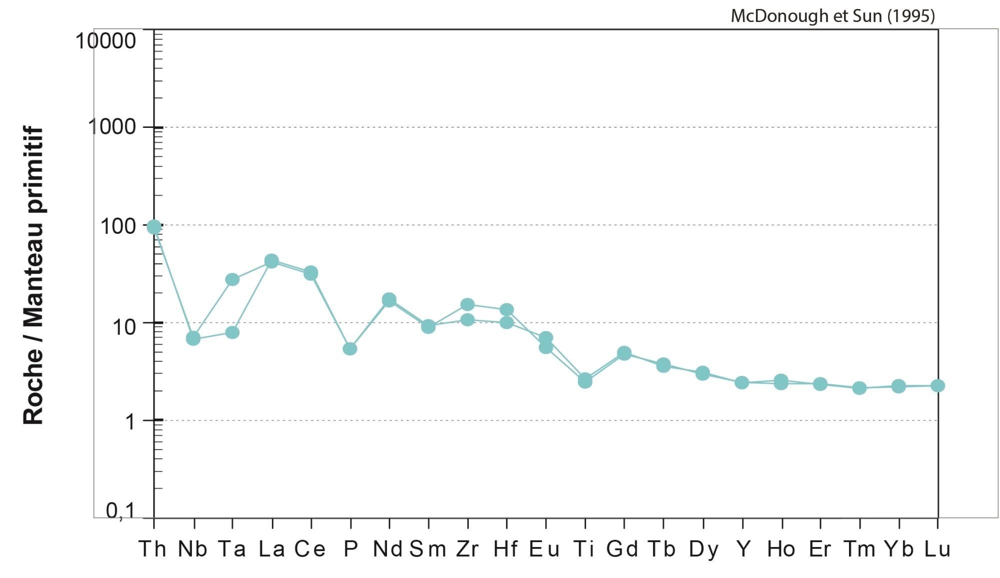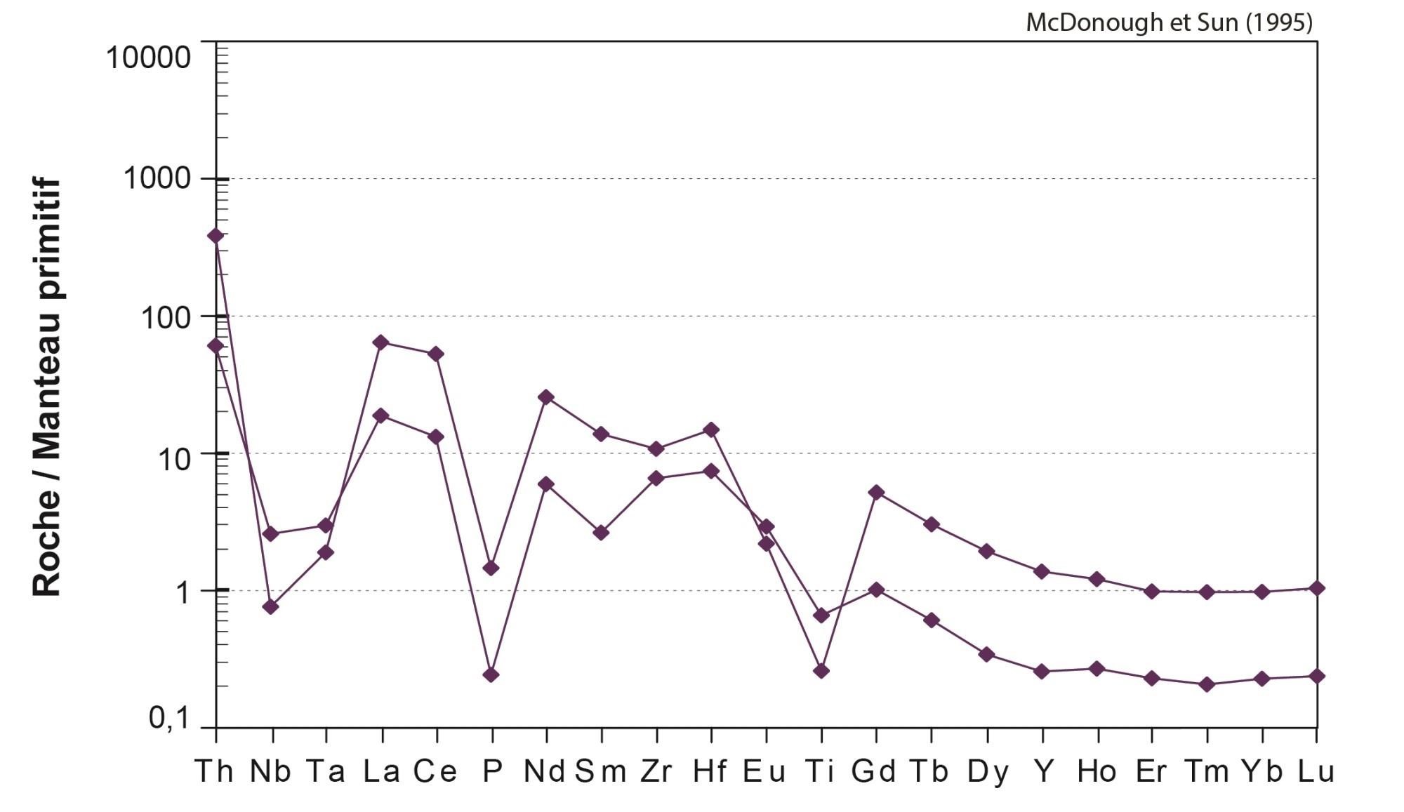 Fortes anomalies négatives en Nb, Ta, P et Ti |