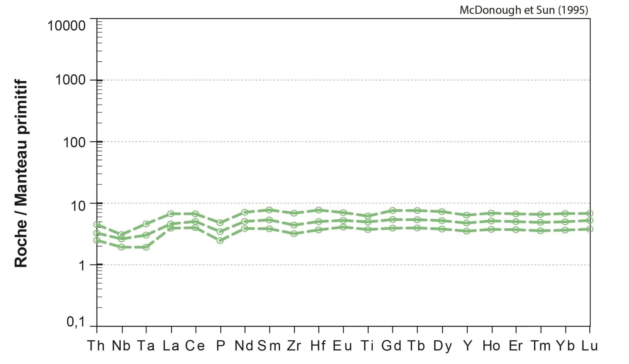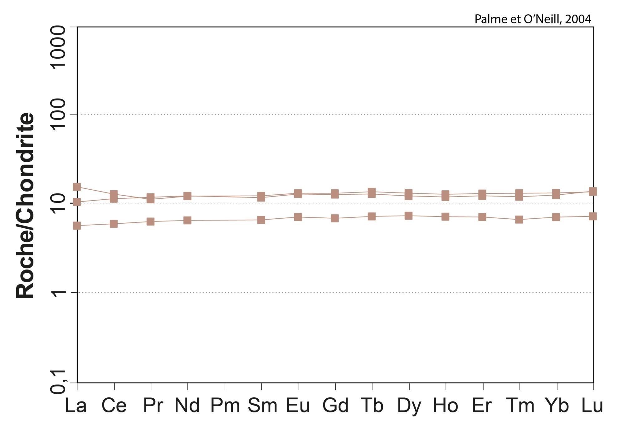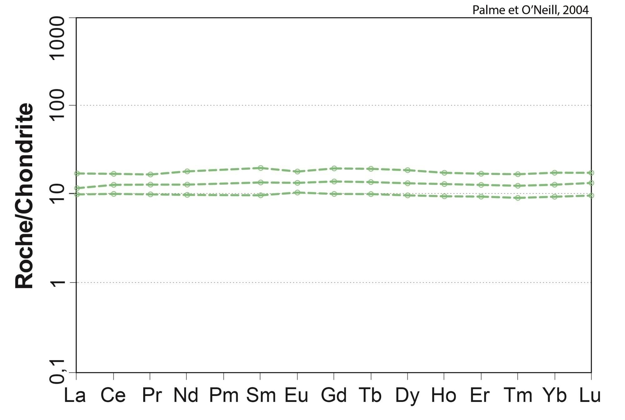 Profil plat 0,81 < (La/Yb)N < 1,18 0,86 < (La/Sm)N < 1,25 0,97 < (Gd/Yb)N < 1,01 1,03 < Eu/Eu* < 1,05 |