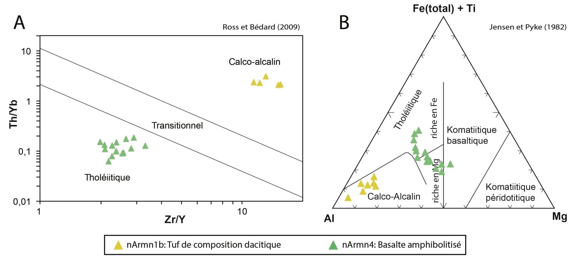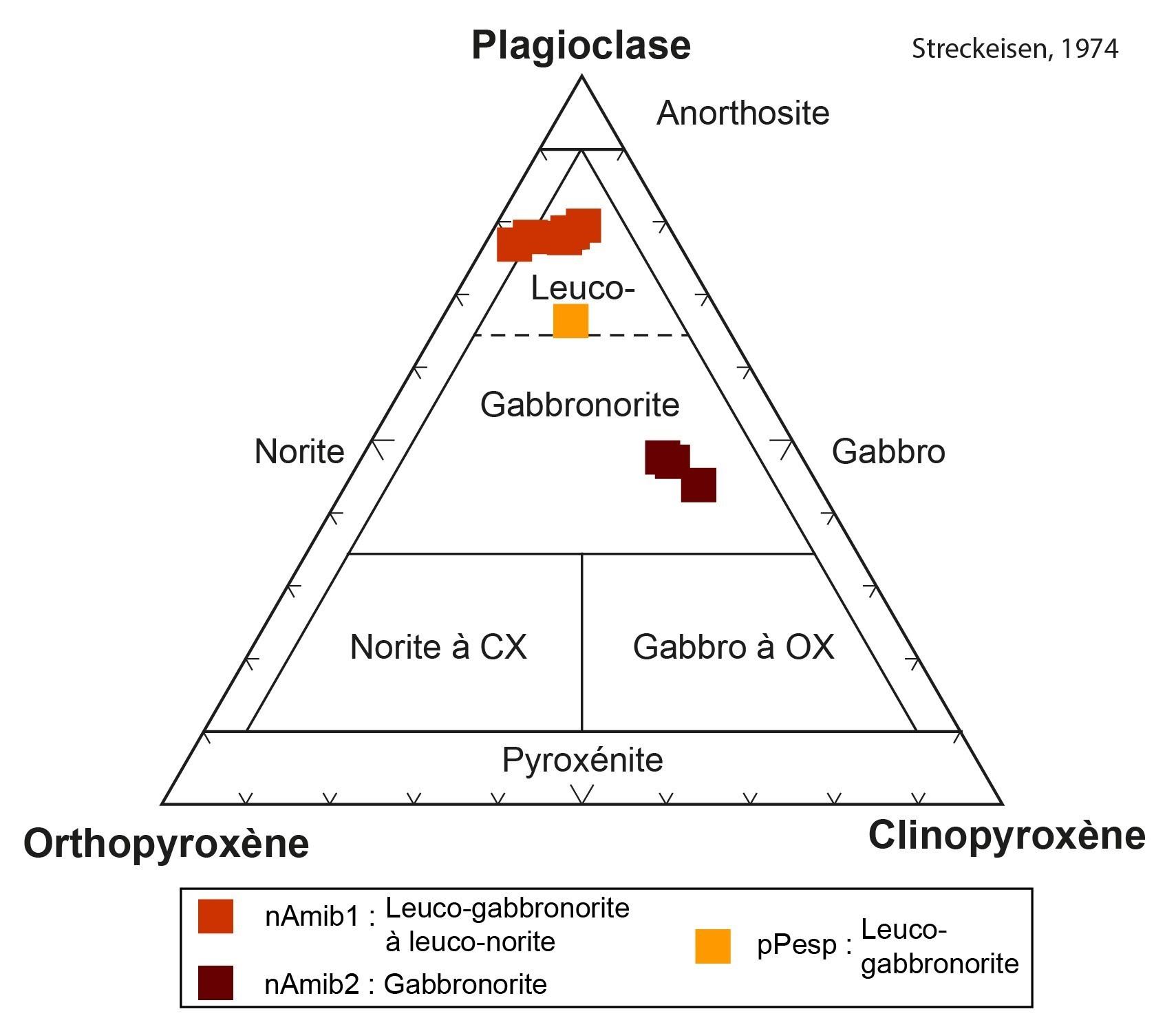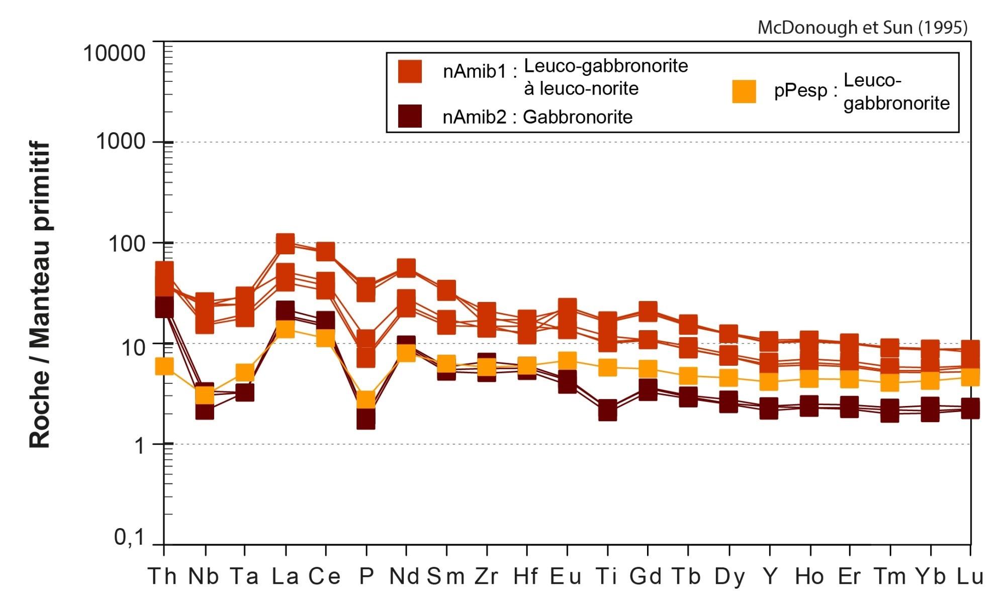 Les unités de gabbronorite (nArmn3) et de volcanites mafiques (nArmn4) ont une chimie très semblable, et sont possiblement cogénétiques