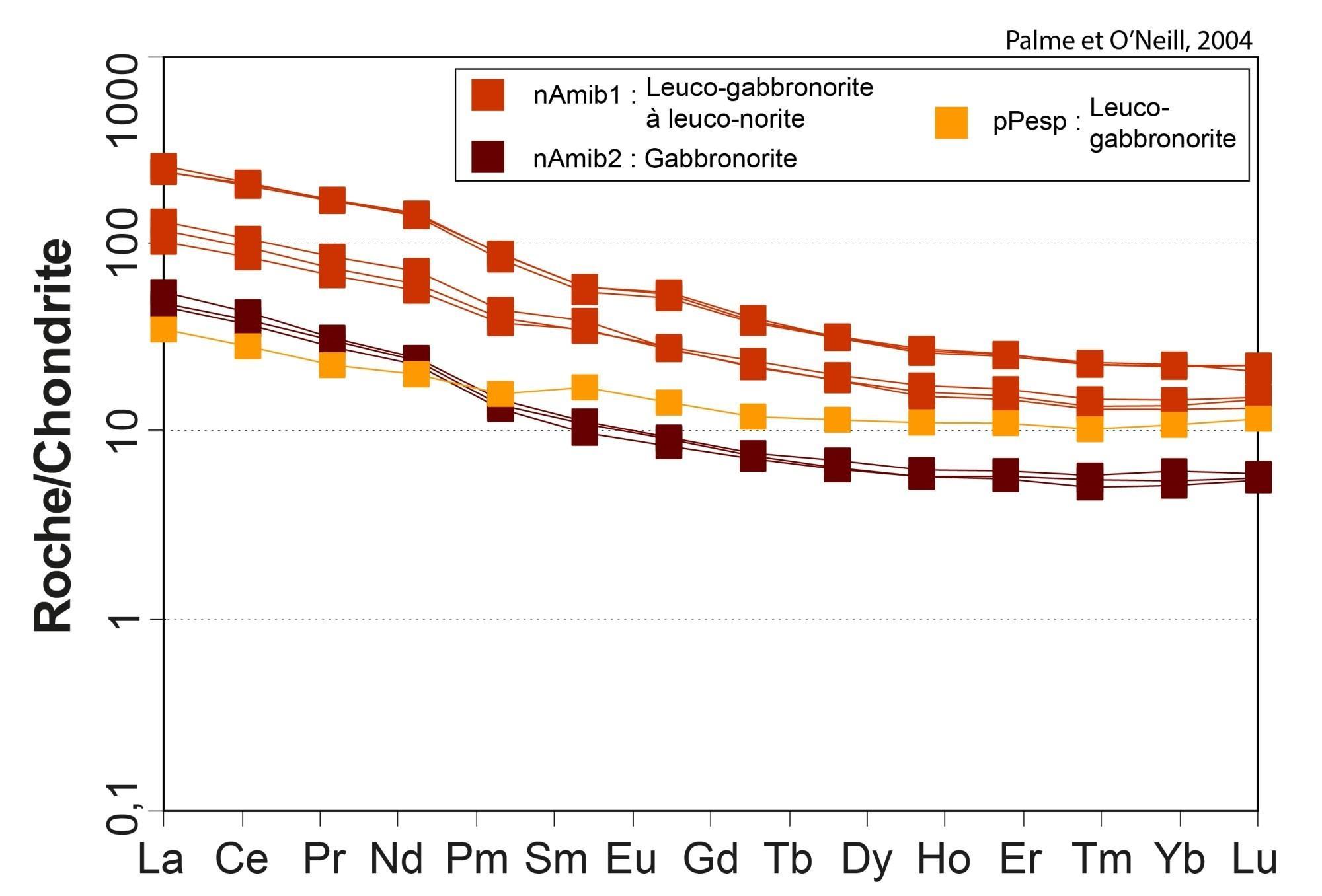 Les spectres d’ETR présentant un appauvrissement en ETR lourds correspondent probablement à des injections tardives de leucotonalite à biotite et magnétite. Les roches de l’unité nAmiq sont plus appauvries |