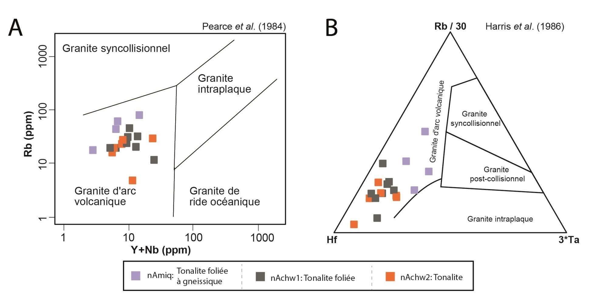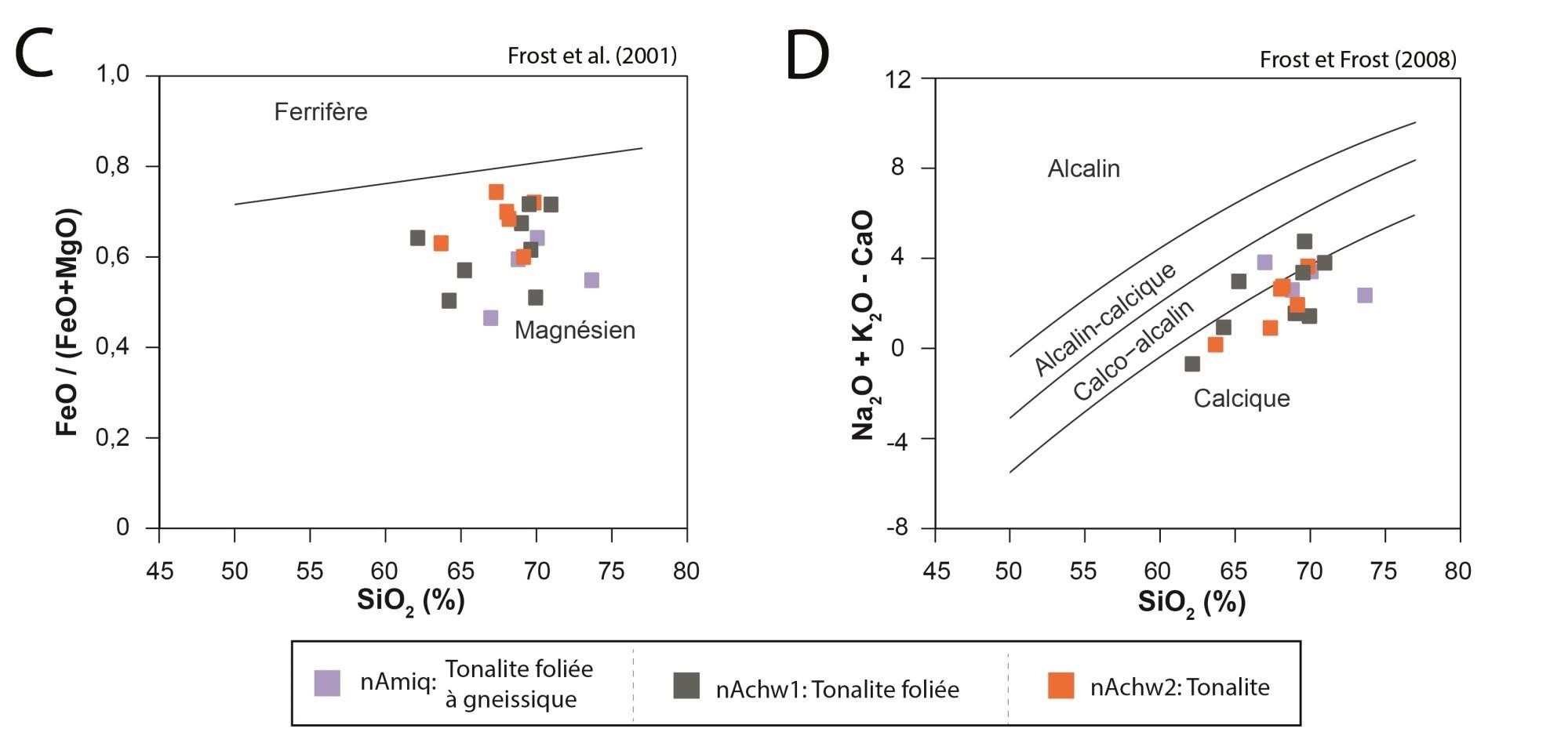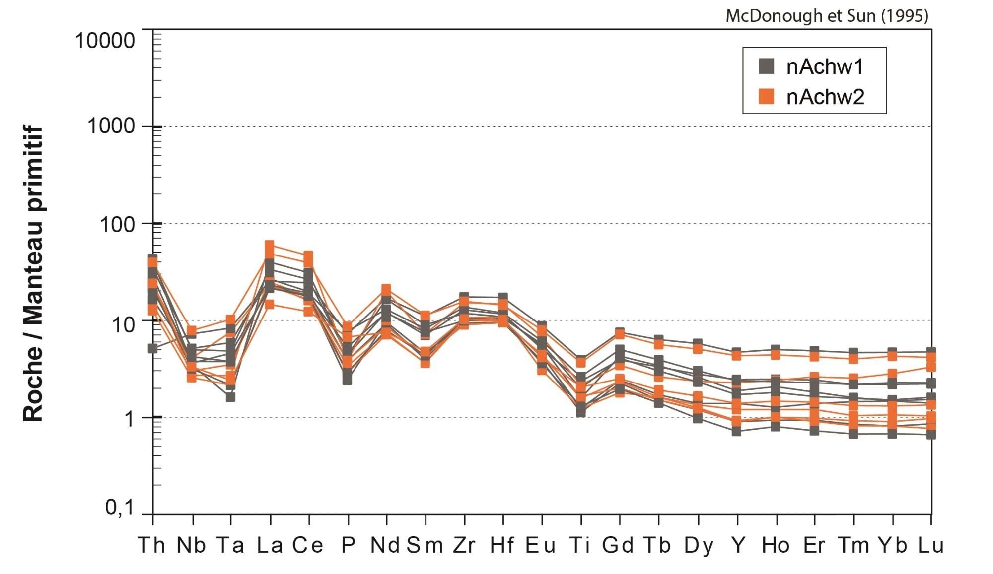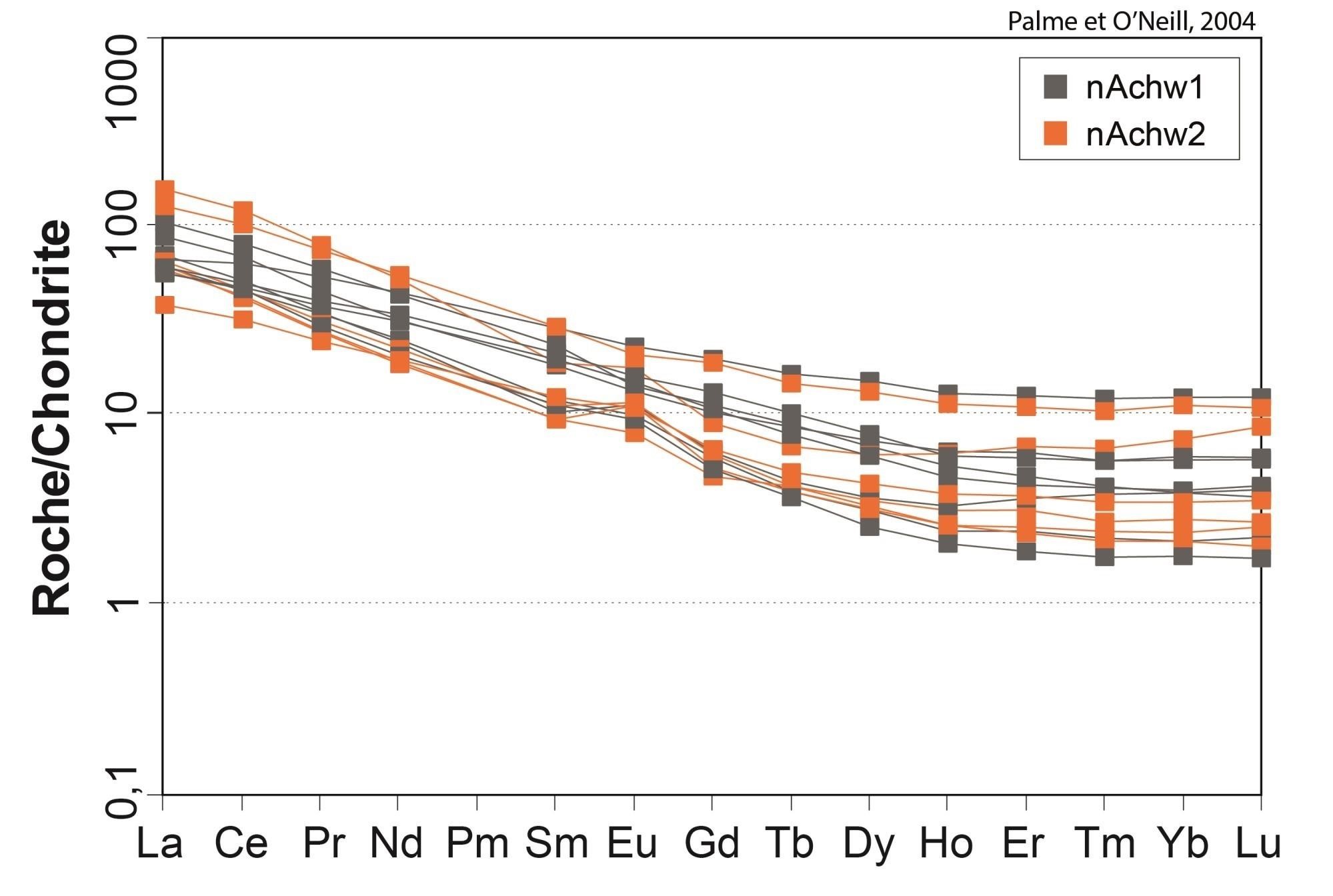 Bien que les relations de terrain indiquent que les roches de l’unité nAchw2 sont bel et bien distinctes de celles de nAchw1, elles sont indissociables au niveau géochimique |