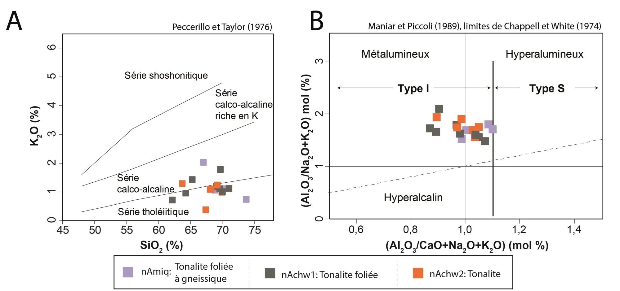 Métalumineux à peralumineux (type I); K2O faible à moyen Magnésien; calcique à calco-alcalin