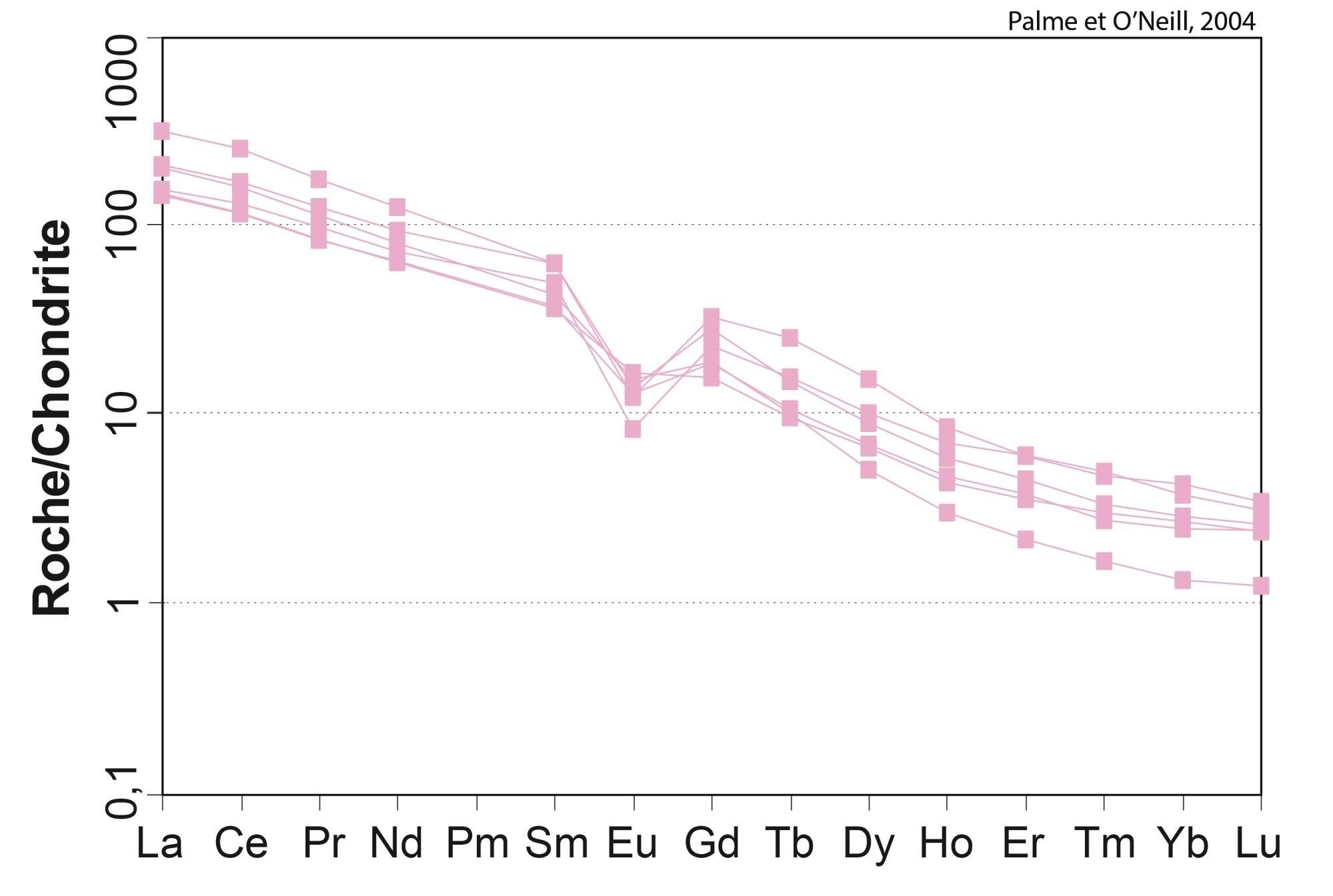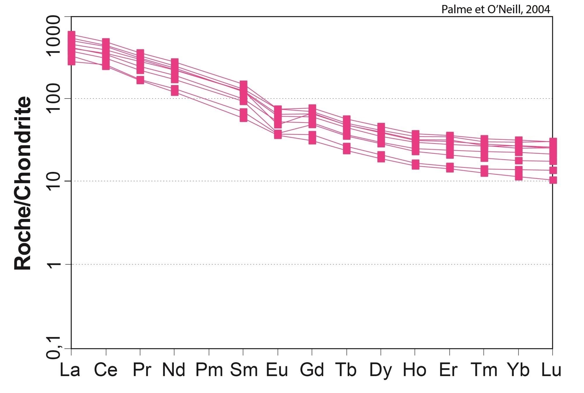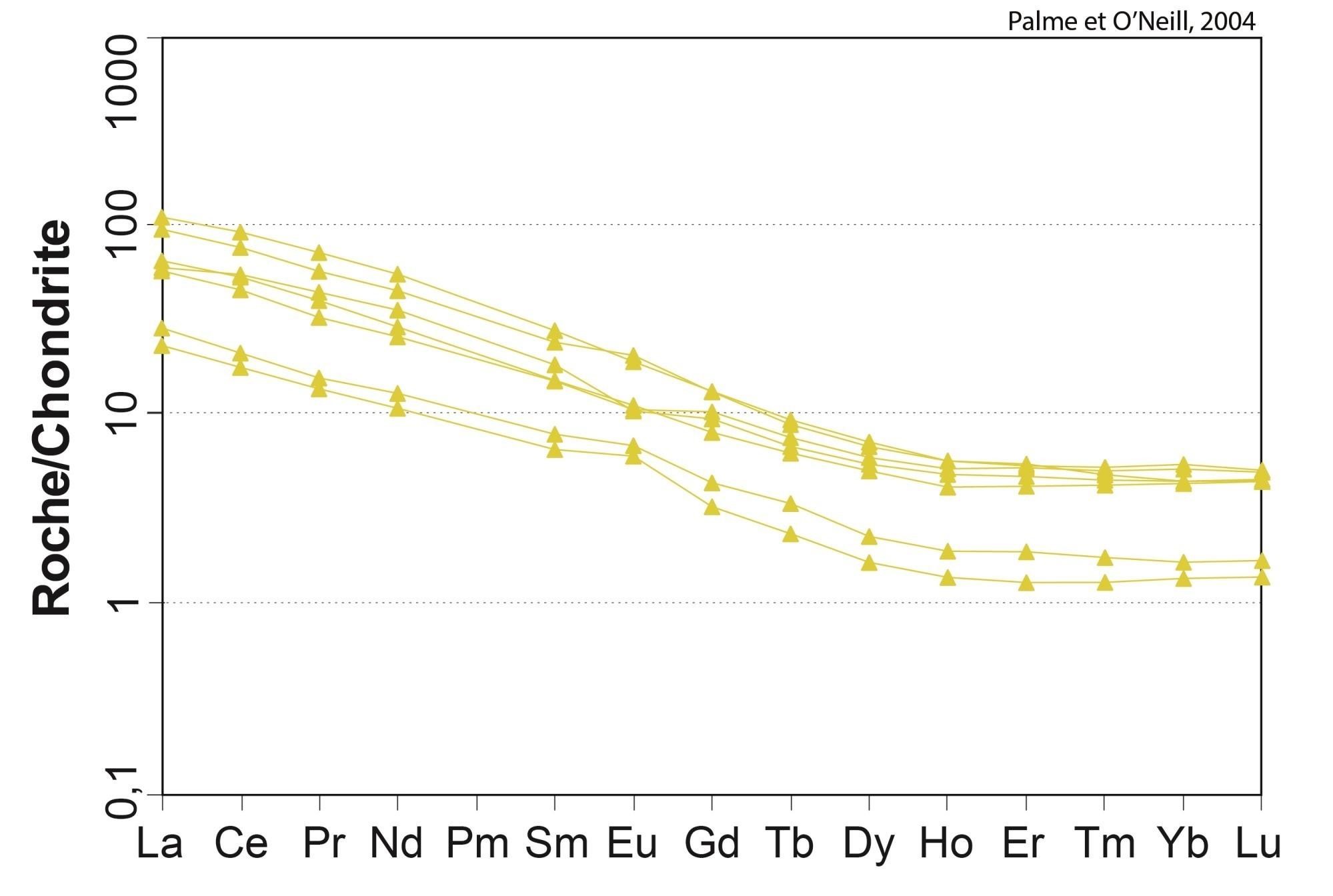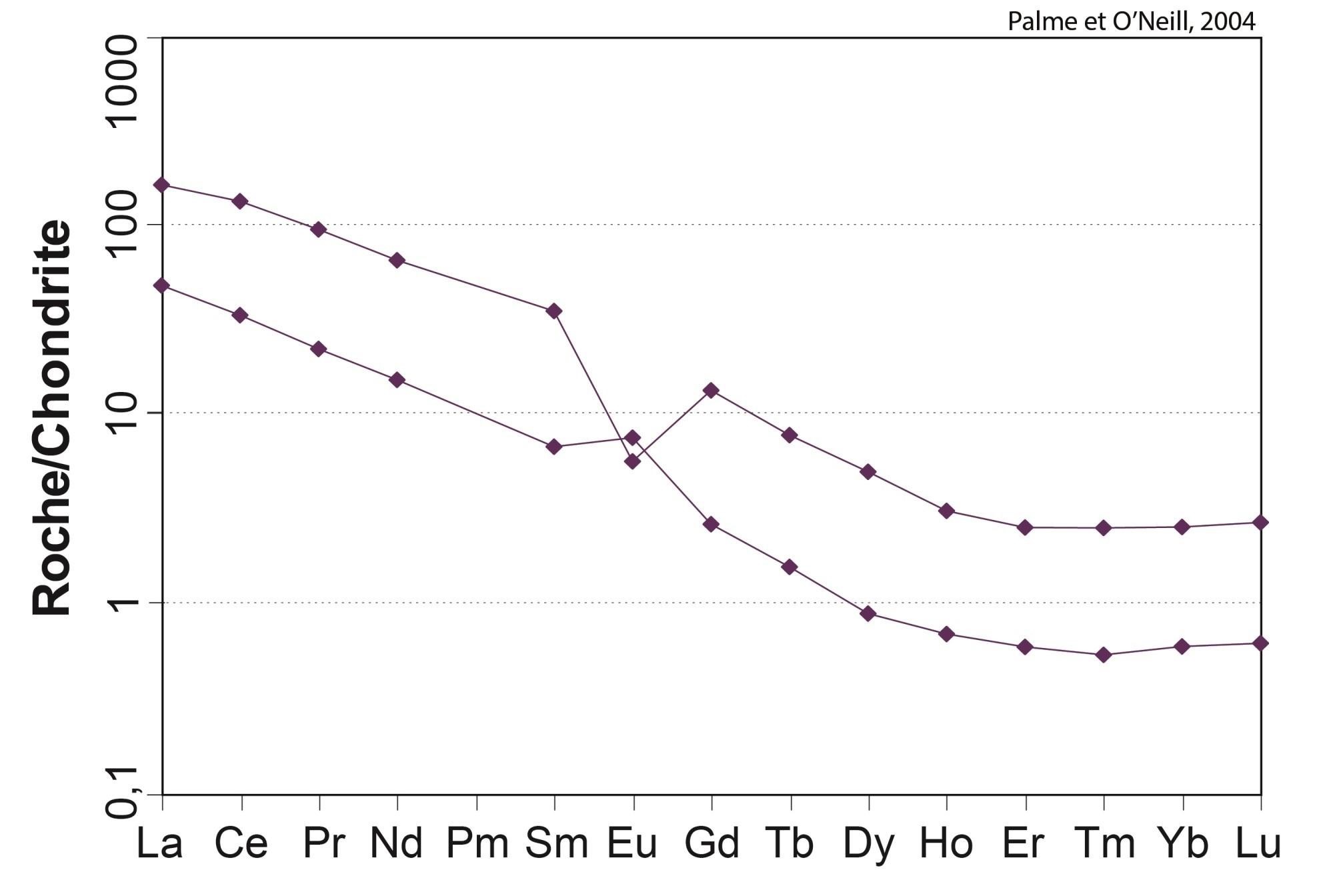 Profil à pente négative pour les ETR légers, et plat pour les ETR lourds 18,89 < (La/Yb)N < 19,15 4,64 < (La/Sm)N < 4,66 2,16 < (Gd/Yb)N < 2,18 0,85 < Eu/Eu* < 1,03 |