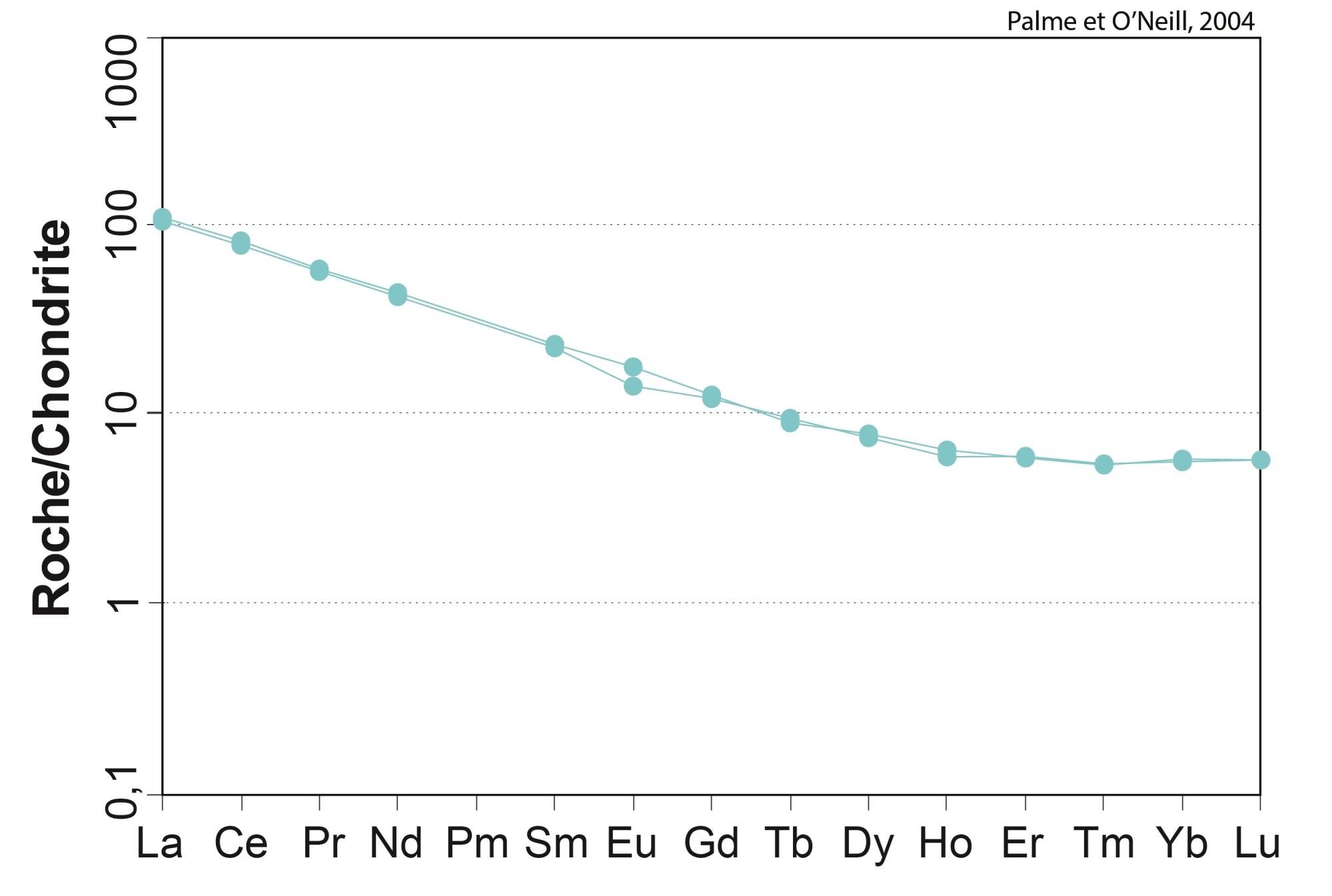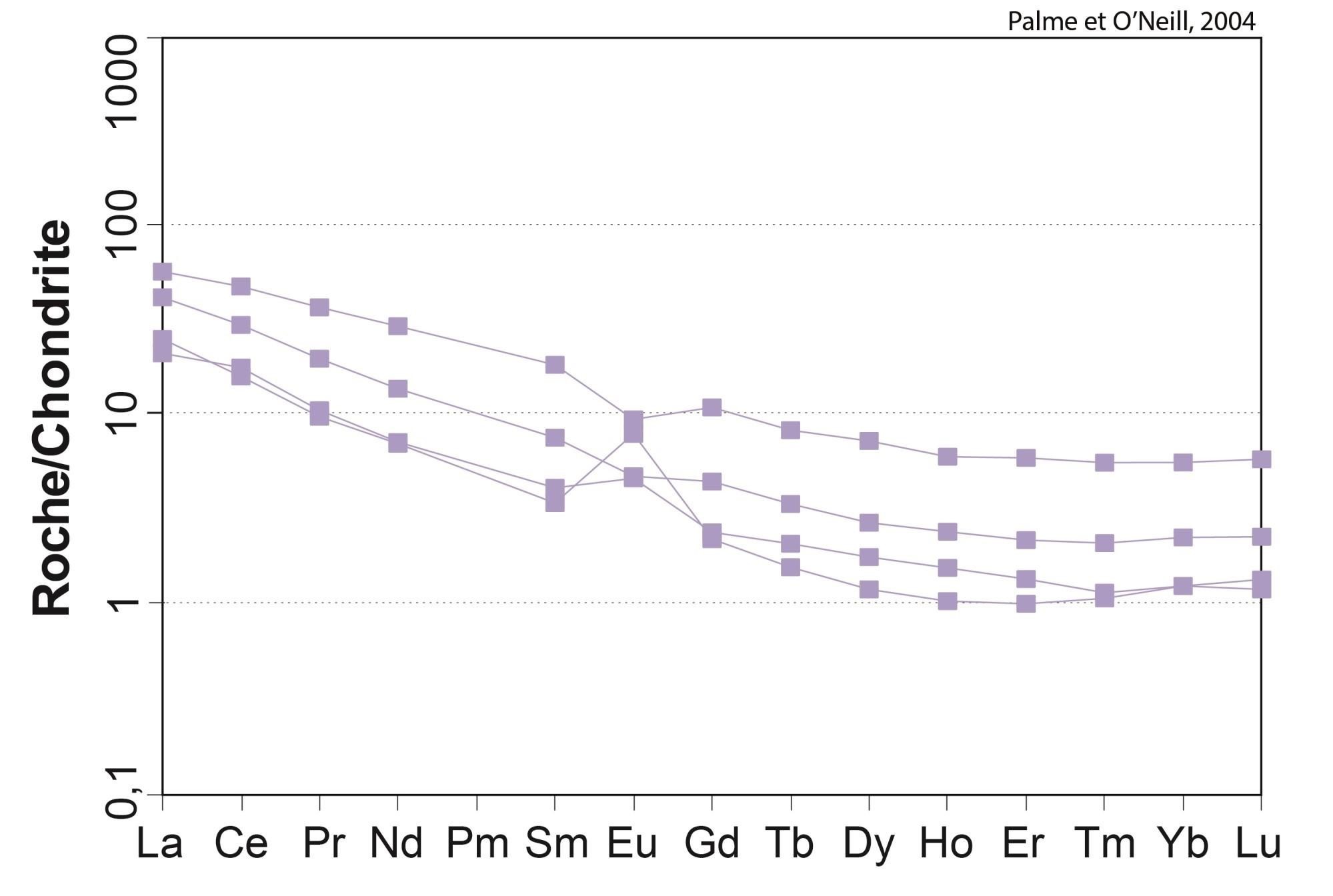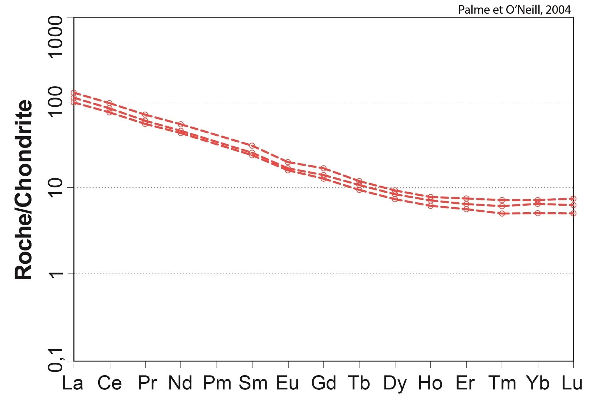 Profil à pente négative pour les ETR légers, et plat pour les ETR lourds 18,89 < (La/Yb)N < 19,15 4,64 < (La/Sm)N < 4,66 2,16 < (Gd/Yb)N < 2,18 0,85 < Eu/Eu* < 1,03 |
