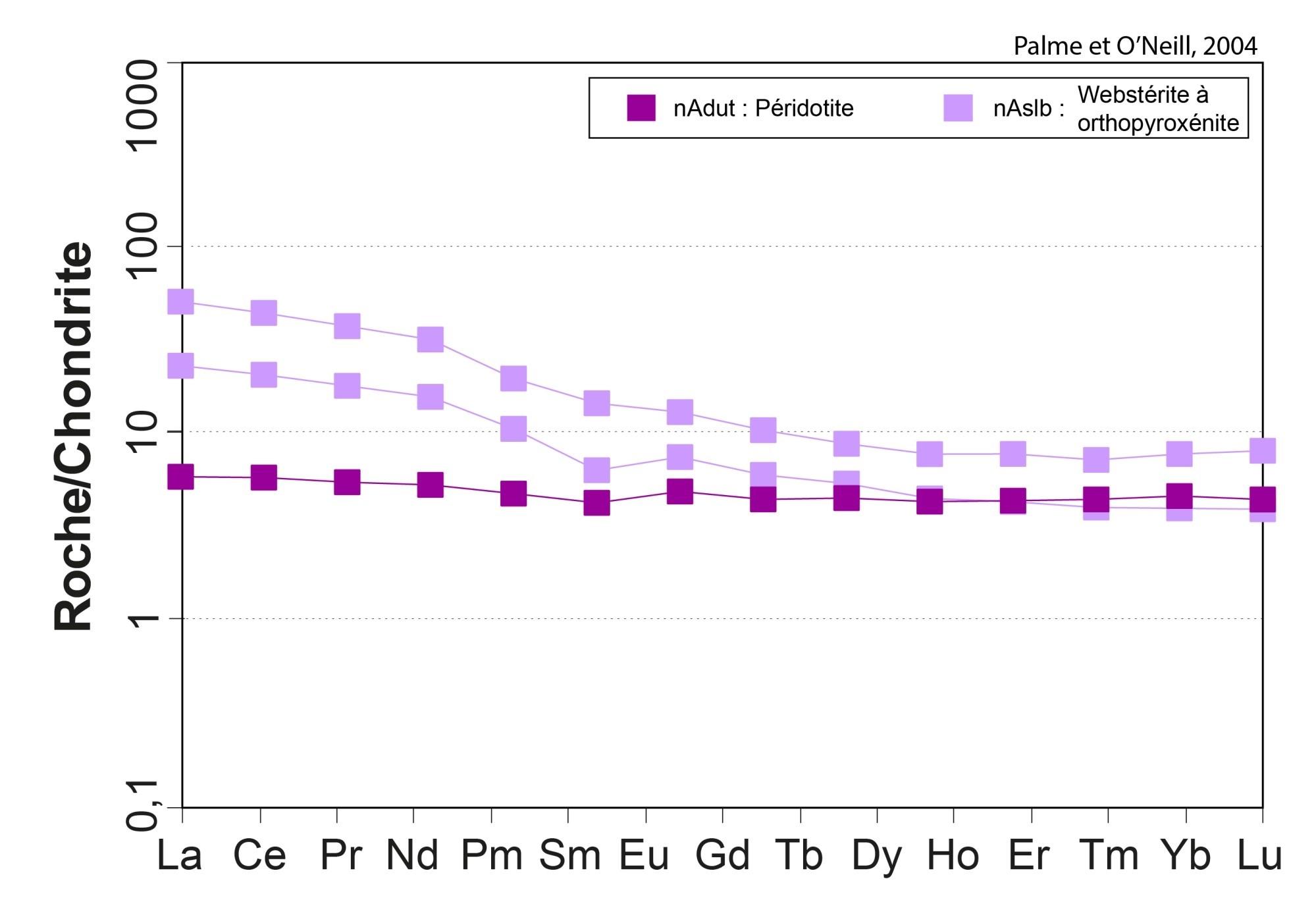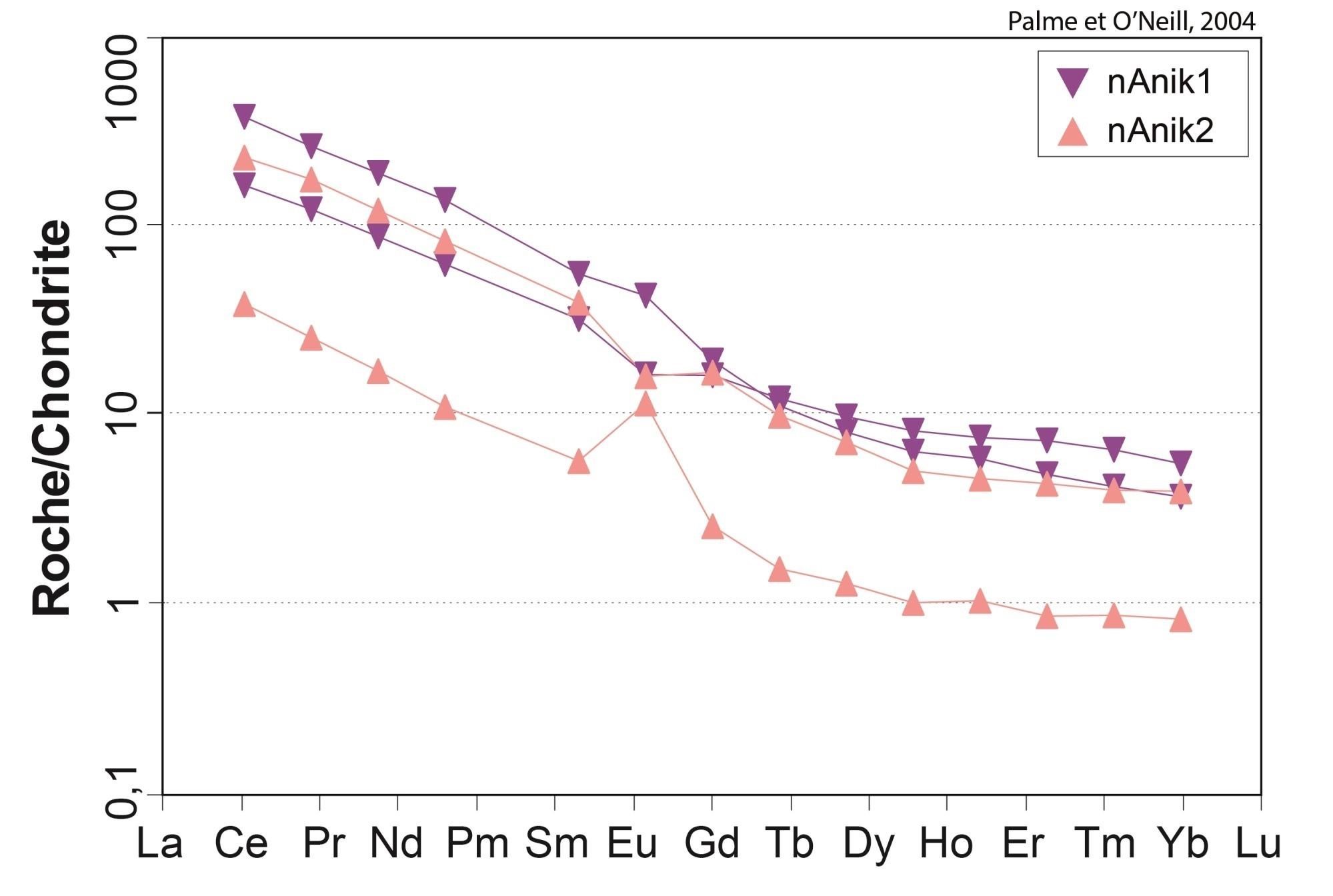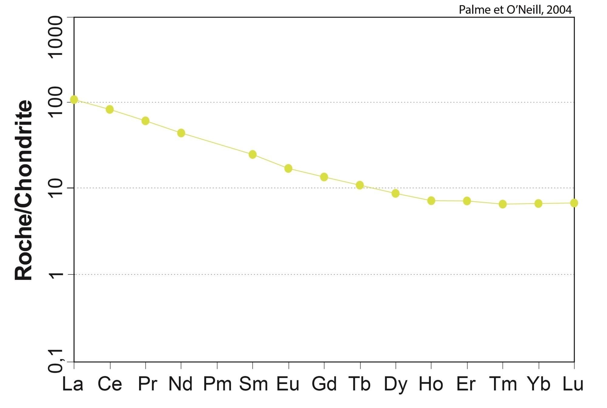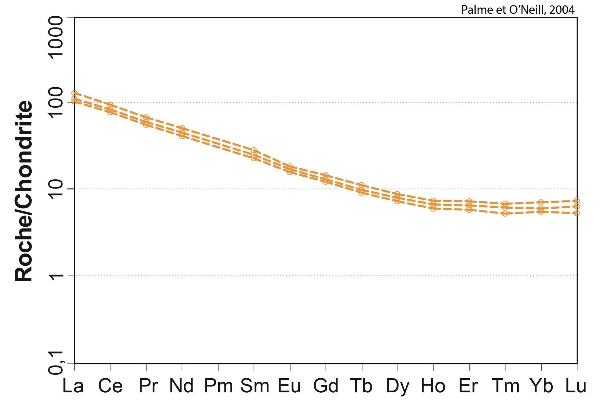 Profil à pente négative pour les ETR légers, et plat pour les ETR lourds 18,89 < (La/Yb)N < 19,15 4,64 < (La/Sm)N < 4,66 2,16 < (Gd/Yb)N < 2,18 0,85 < Eu/Eu* < 1,03 |