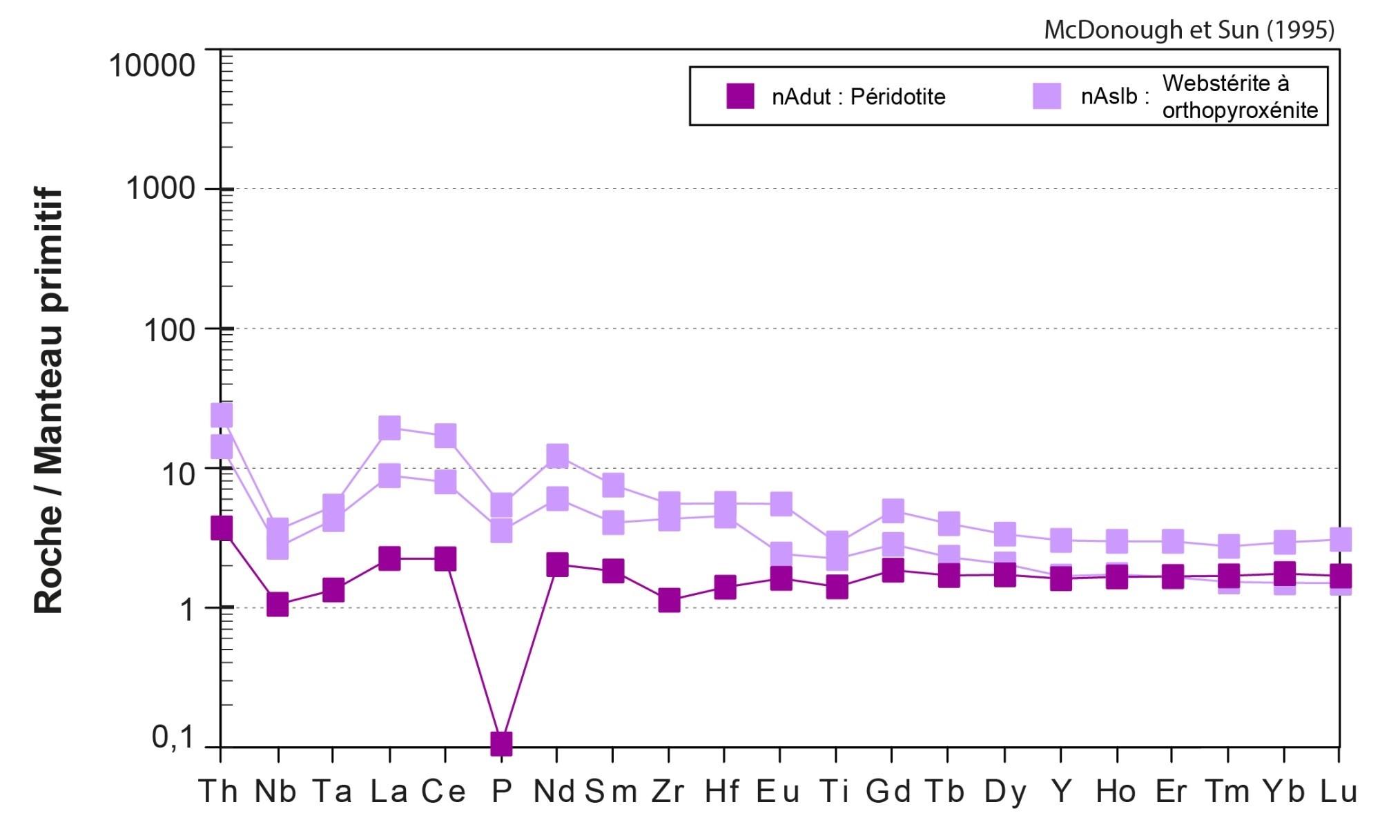 Anomalies négatives en Nb, Ta et P |