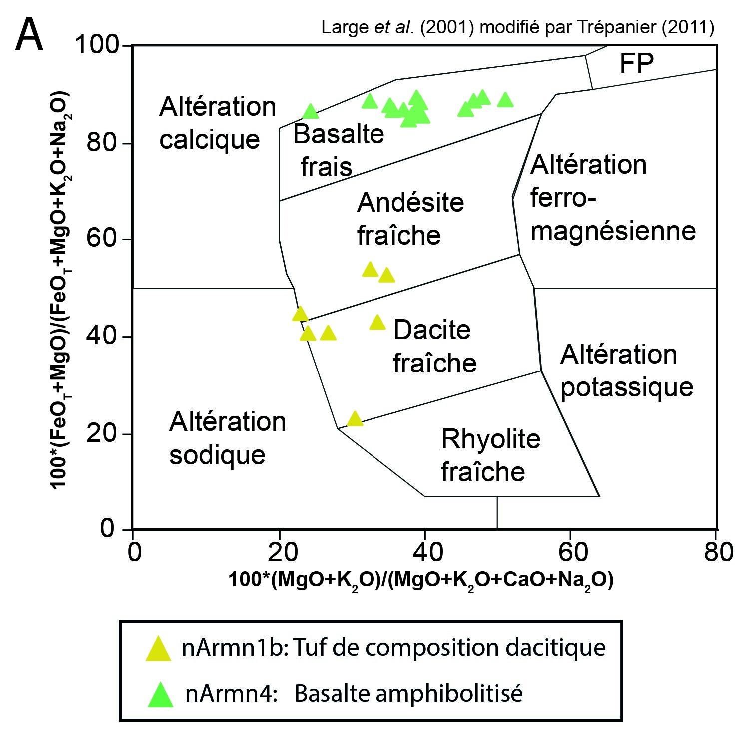 LARGE, R.R., GEMMELL, J.B., PAULICK, H., HUSTON D.L., 2001. The alteration box plot: a simple approach to understanding the relationship between alteration mineralogy and lithogeochemistry associated with volcanic-hosted massive sulfide deposits. Economic Geology; volume 96, pages 957-971. https://doi.org/10.2113/gsecongeo.96.5.957