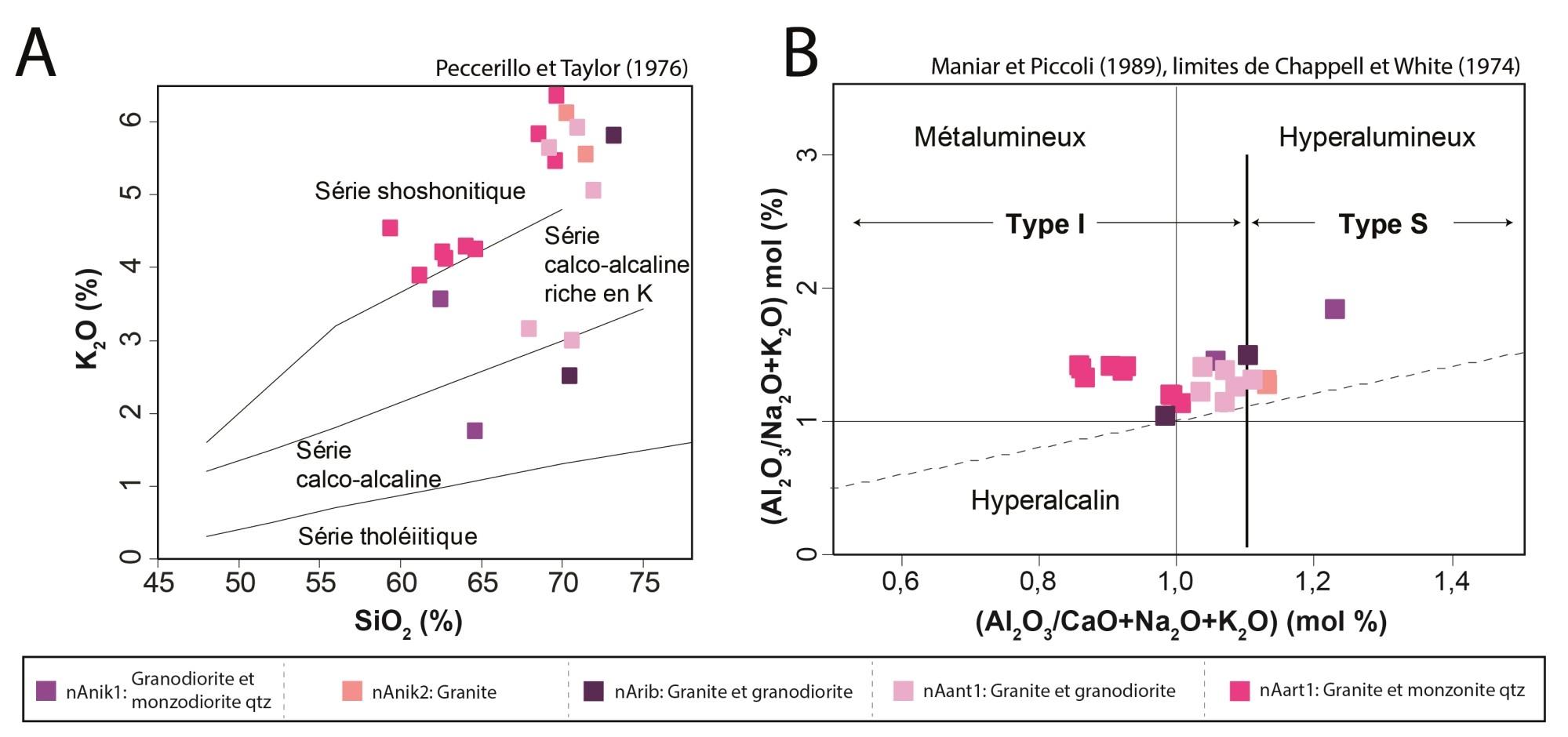 Peralumineux (type I); K2O moyen à élevé Magnésien; calco-alcalin à alcalin |