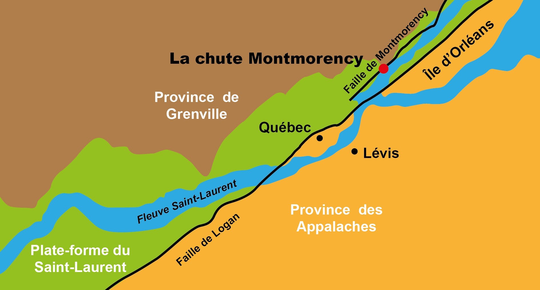 Le Québec est divisé en neuf provinces géologiques. Chacune d’entre elles correspond à un groupe de roches formé à un moment donné de l’histoire géologique. Le site de la chute Montmorency est situé à la jonction entre trois de ces provinces géologiques, soit le Grenville, la Plate-forme du Saint-Laurent et les Appalaches.