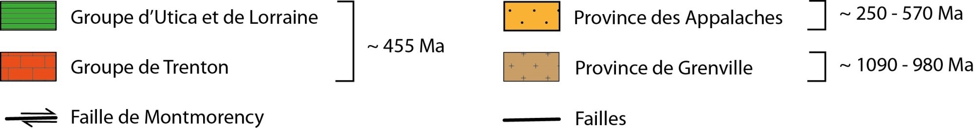Le bloc nord-ouest consiste en des gneiss précambriens (Province de Grenville), surmontés des calcaires du Groupe de Trenton en lits plus ou moins horizontaux (Plate-forme du Saint-Laurent). Ces calcaires couvrent de grandes étendues dans le nord-est de l’Amérique du Nord, particulièrement dans les Basses-Terres du Saint-Laurent, la région d’Ottawa, le sud de l’Ontario et l’ouest de l’État de New-York. Ils sont exploités depuis longtemps dans plusieurs carrières dans les environs de la rivière Montmorency et dans les Basses-Terres. Le bloc sud-est, affaissé par rapport au bloc nord-ouest, est constitué en grande partie de shales et de grès qui, autrefois, recouvraient les roches du Groupe de Trenton du bloc nord-ouest.
