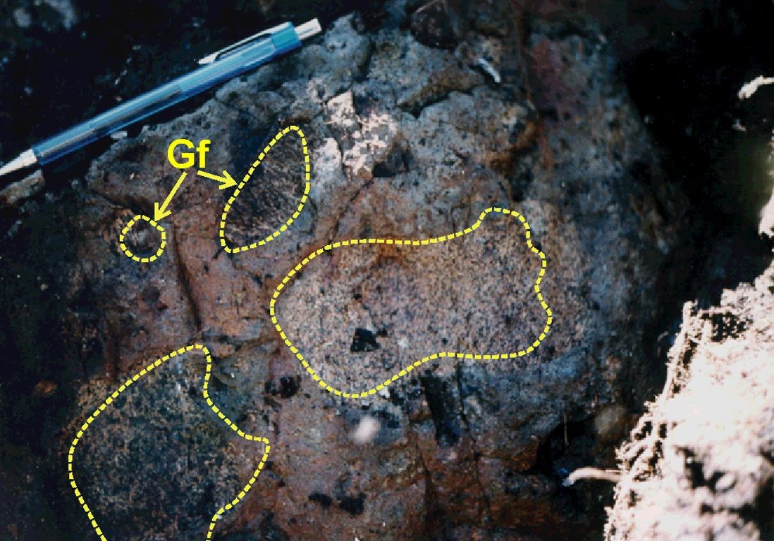 Quelques particularités ont également été observées par Chevé et al. (2001). Parmi les fragments felsiques les plus grossiers, certains se caractérisent par un assemblage quartzo-feldspathique granophyrique d’où se dégagent des lattes très allongées de plagioclase qui suggèrent des textures squelettiques de trempe. Une telle texture « fraiche » suggère la présence d’un protolite felsique postgrenvillien dans le secteur du lac Marsal qui aurait soit accompagné le magmatisme de la brèche, soit été coupé en surface par le diatrème. L’autre particularité réside dans la présence d’amygdales centimétriques, arrondies et aux contours réguliers, remplies de quartz et bordées de fins bâtonnets de clinozoïsite. La plus importante amygdale observée atteint près de 5 cm de diamètre; son intérieur est tapissé de gerbes de quartz et est rempli de sphérolites millimétriques de préhnite.