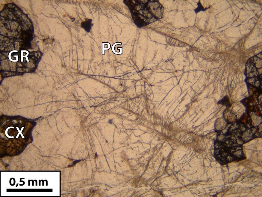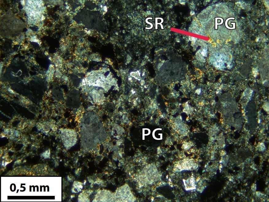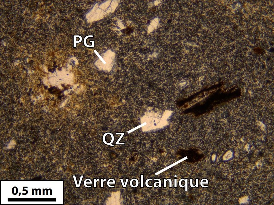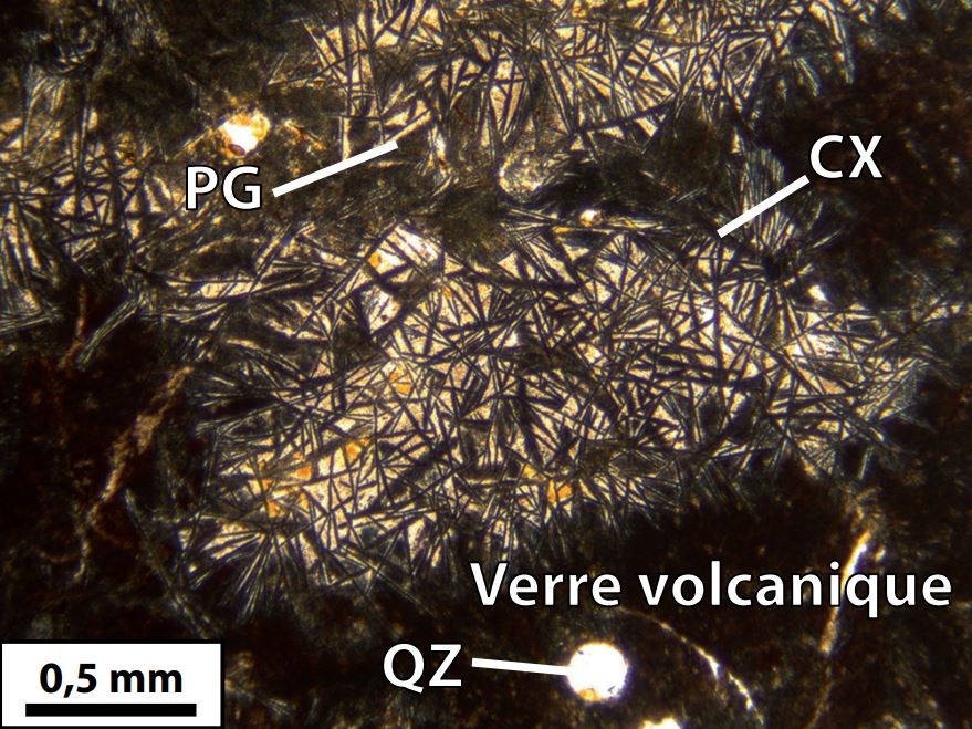 La latite (Tcim4) forme l’unité majeure à la base de l’épaisse séquence de roches de fusion (Gobeil, 1997). La roche est typiquement brun-rouge, mais peut être brune, rouge ou grise; elle est caractérisée par une texture microgrenue (Gobeil, 1997; Groulier et al., 2017). Elle est composée d’une proportion importante de clinopyroxène (augite, pigeonite), de plagioclase, de feldspath potassique (orthose, sanidine, microcline), de quartz (<5 %) et de minéraux accessoires (apatite, biotite, amphibole brune, magnétite, hématite et ilménite). La présence d’amas de granulométrie plus grossière (Tcim4a?) témoigne d’une circulation de fluides tardive associée, par endroits, à des cavités remplies de zéolites fibreuses (Groulier et al., 2017). Cette circulation hydrothermale s’accompagne d’un lessivage de la roche encaissante (teinte blanchâtre) au contact immédiat des veinules, matérialisant une déstabilisation des minéraux ferromagnésiens qui sont remplacés par une paragenèse à quartz-feldspath. Des clastes de verre plus ou moins altérés ou dévitrifiés en microlithes sont observés dans certaines lames minces. Le verre s’altère en hématite et en clinopyroxène, l’hématite formant une couronne d’altération au pourtour des clastes. La biotite et les amphiboles présentent une altération de type opacitisation, avec déstabilisation du minéral primaire en magnétite-hématite.