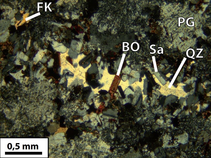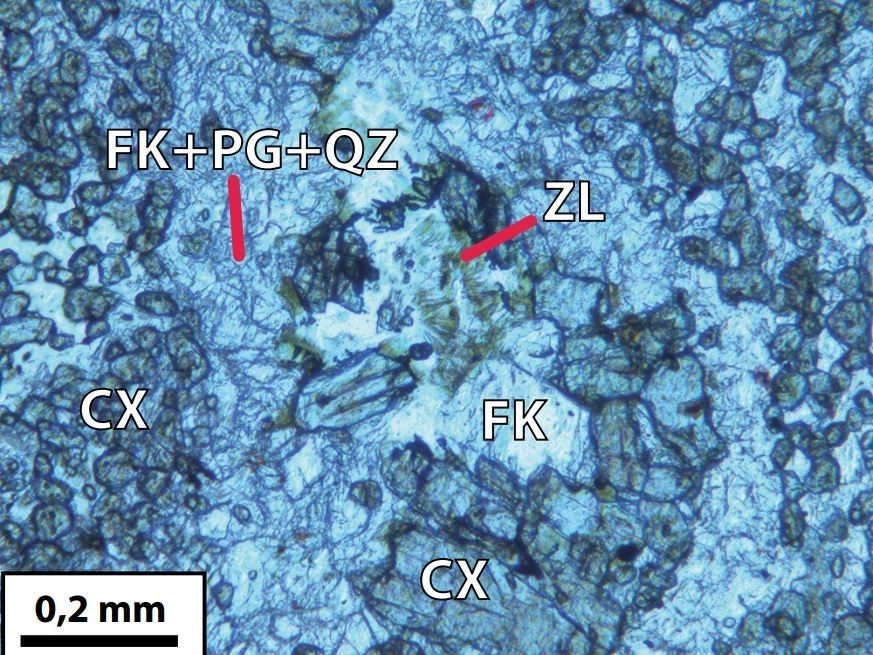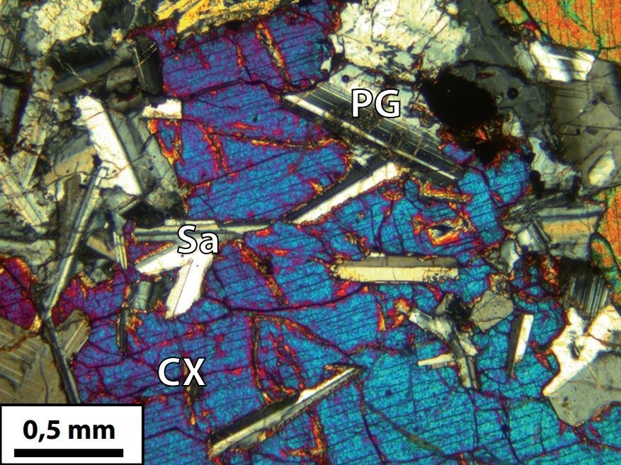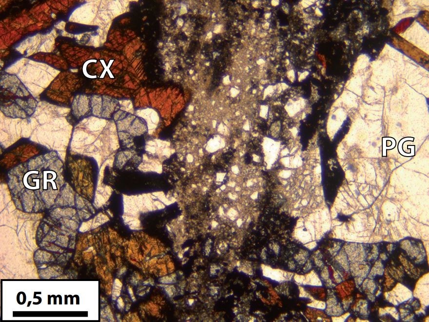 La monzonite (Tcim5) constitue l’unité supérieure de la séquence de roches de fusion (Gobeil, 1997). La roche est typiquement brune ou localement grise ou rouge. Elle est holocristalline, à texture subophitique à ophitique dominante et caractérisée par une granulométrie grossière caractéristique (≤5 mm) qui témoigne d’un refroidissement lent (Gobeil, 1997; Groulier et al., 2017). Les principaux minéraux de la monzonite sont le plagioclase (automorphe à subautomorphe), le feldspath potassique (orthose xénomorphe et sanidine automorphe à subautomorphe), le clinopyroxène (augite maclée xénomorphe et pigeonite), l’orthopyroxène (hypersthène xénomorphe) et le quartz interstitiel tardif (<5 %). La proportion de plagioclase varie d’une lame mince à l’autre, ce qui correspond aux observations faites au niveau des analyses géochimiques, qui indiquent une évolution d’un pôle monzodioritique vers un pôle monzonitique (Groulier et al., 2017). Le plagioclase se présente en lattes ou en grains; une couronne de feldspath potassique (sanidine) entoure le plagioclase (Gobeil, 1997). Les minéraux accessoires sont la magnétite et l’apatite (Groulier et al., 2017).