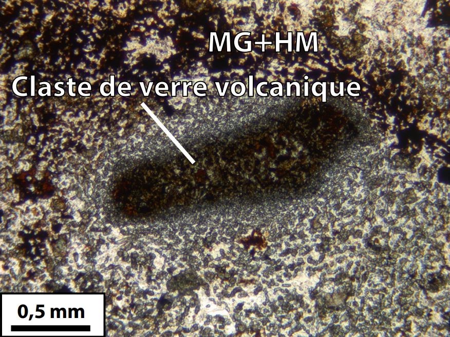 Le verre d’impact au sein du Cratère d’impact de Manicouagan est aphanitique, localement vésiculaire, de composition basaltique à clinopyroxène et à plagioclase avec une teinte caractéristique allant du brun au noir (Gobeil, 1997; Groulier et al., 2017). Le basalte affleure à la périphérie des roches de fusion liées à l’impact (Tcim4 et Tcim5; Gobeil, 1997). Le verre est communément en voie de dévitrification avec apparition de cristaux aciculaires et dendritiques de clinopyroxène séparés par des lattes de plagioclase (Groulier et al., 2017). Le verre présente par endroits une texture columnaire (visible en lame mince) typique d’un refroidissement de lave. On peut également observer des vacuoles gazeuses désormais remplies de quartz. Un autre faciès basaltique correspond à une roche à matrice cryptocristalline (pyroxènes et plagioclase essentiellement) dans laquelle on observe des xénocristaux de quartz montrant des golfes de corrosion et de plagioclase altéré. Certaines observations (veinules et poches à quartz-zéolite) suggèrent la circulation de fluides hydrothermaux tardifs. Ces basaltes se trouvent également sous la forme de petits dykes qui coupent la roche encaissante (Tcim6) (Gobeil, 1997).