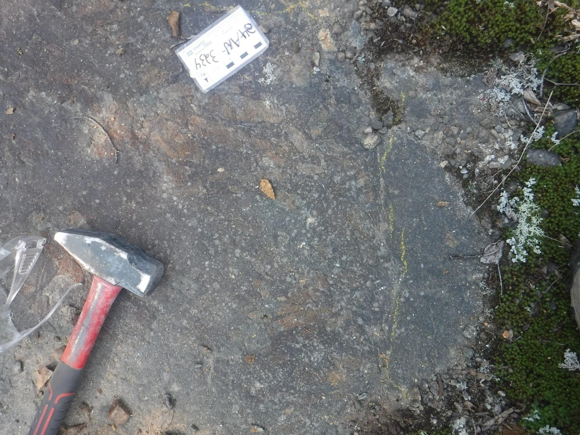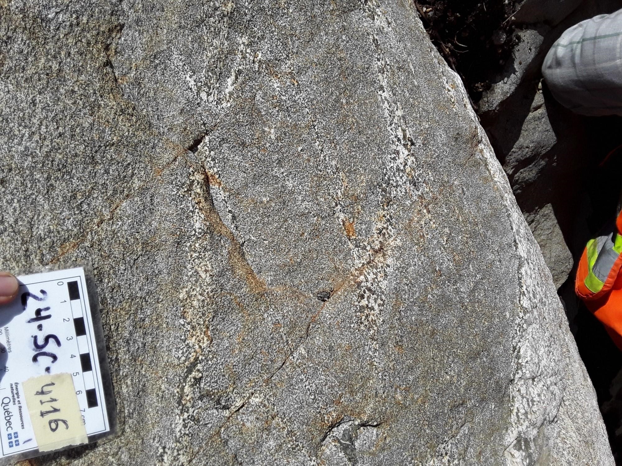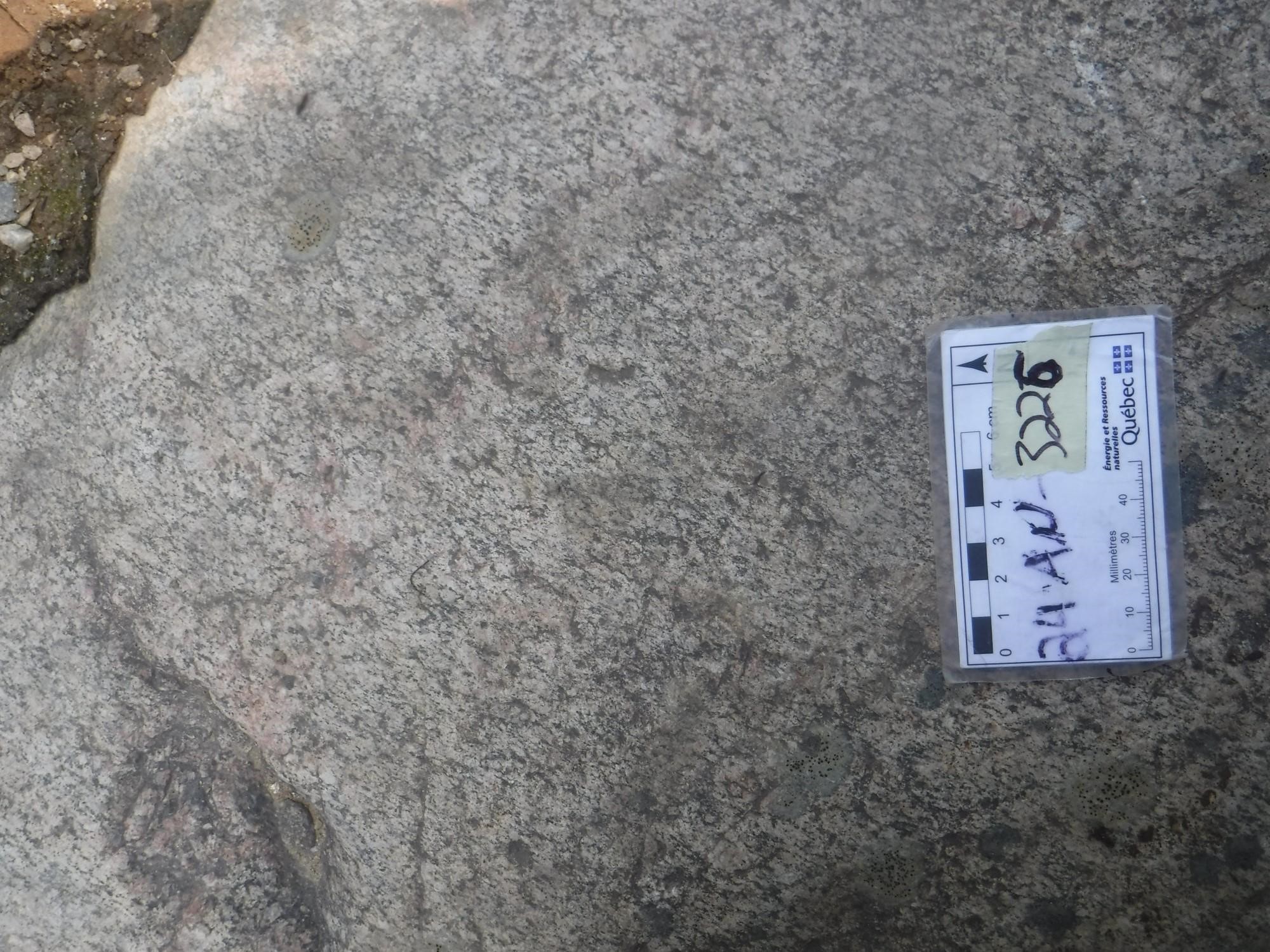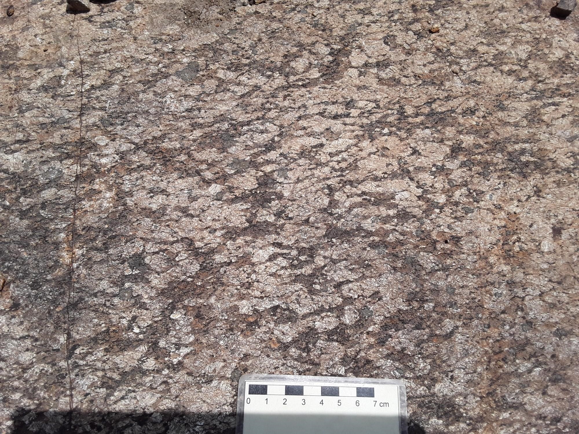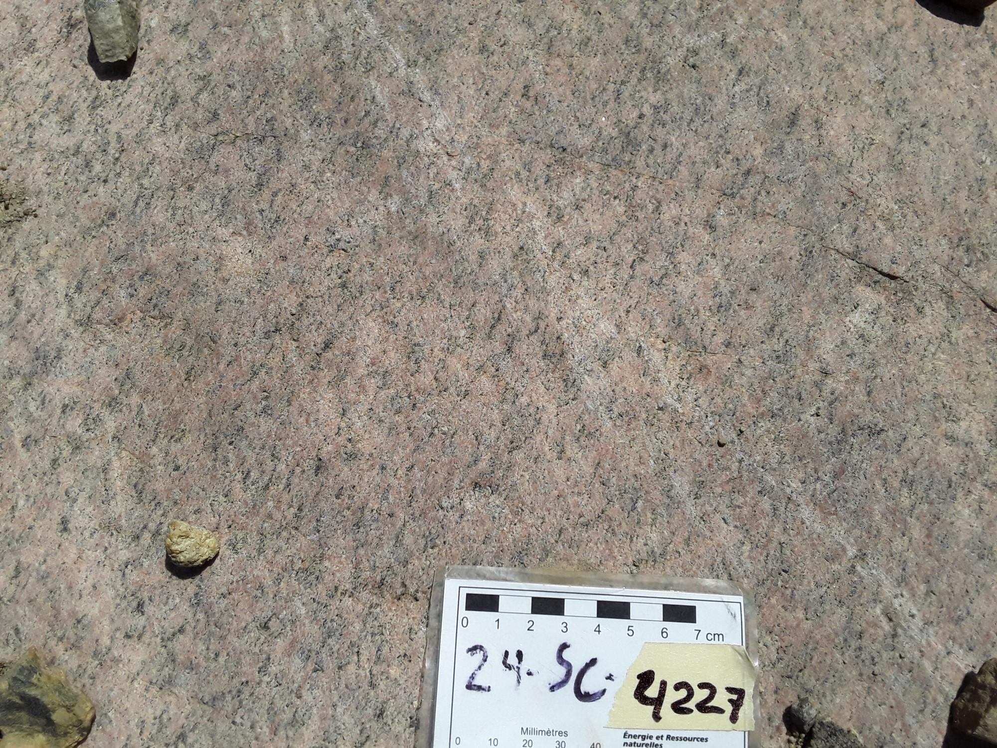 L’unité contient une proportion mineure de granite à feldspath alcalin porphyroïde (affleurement 2024-SC-4027), mais ce faciès est mieux représenté dans l’unité mPtri2.