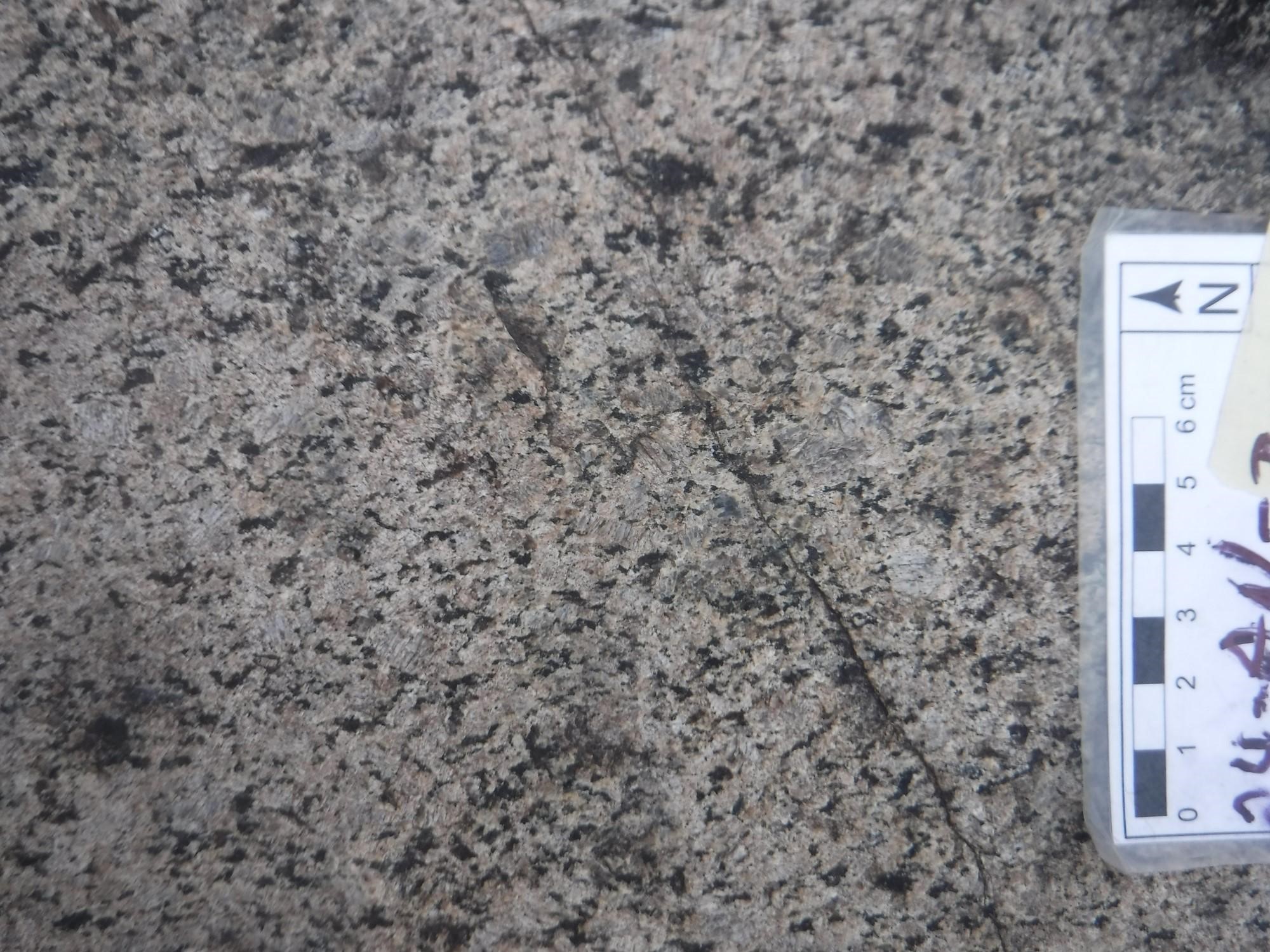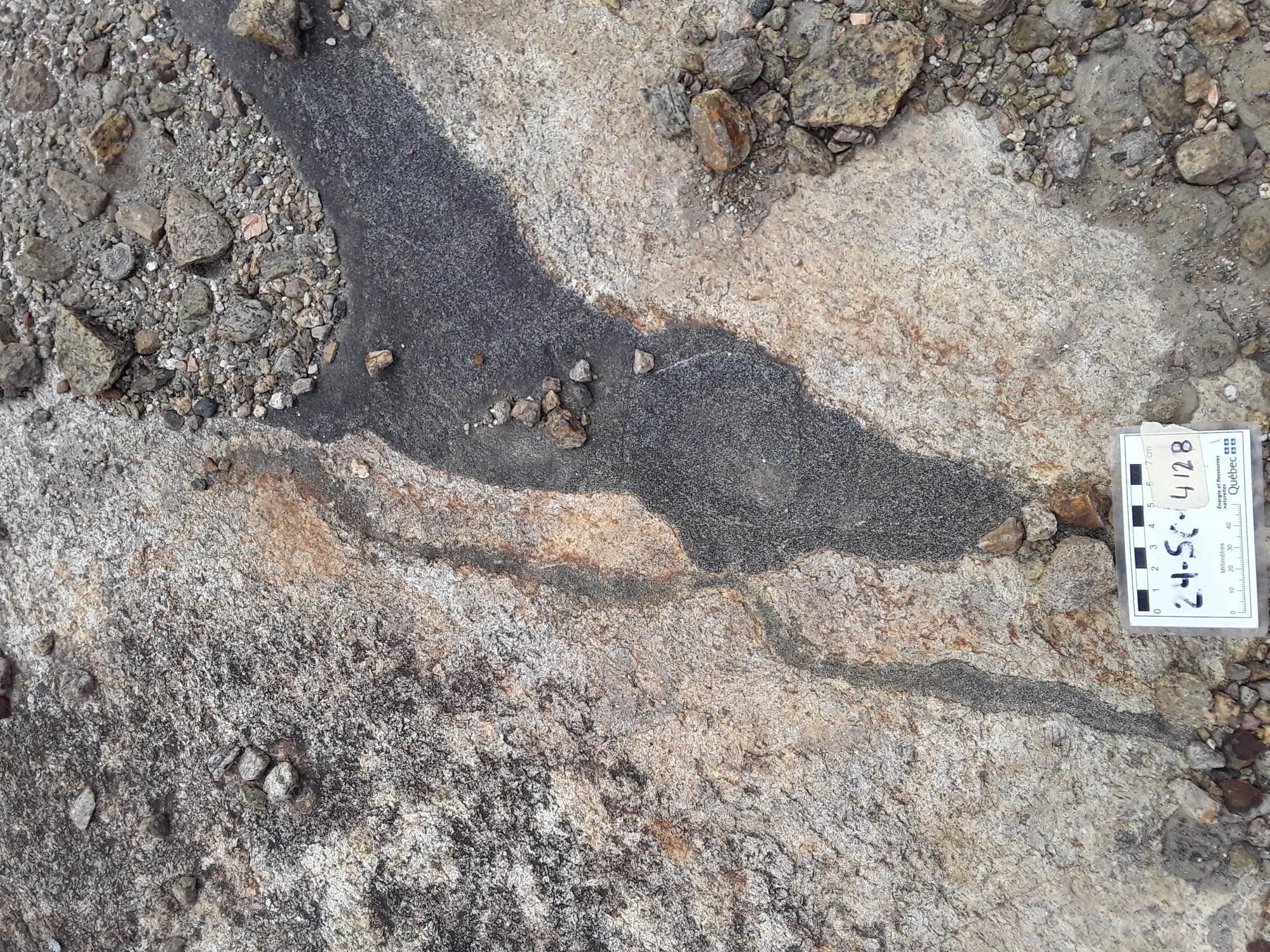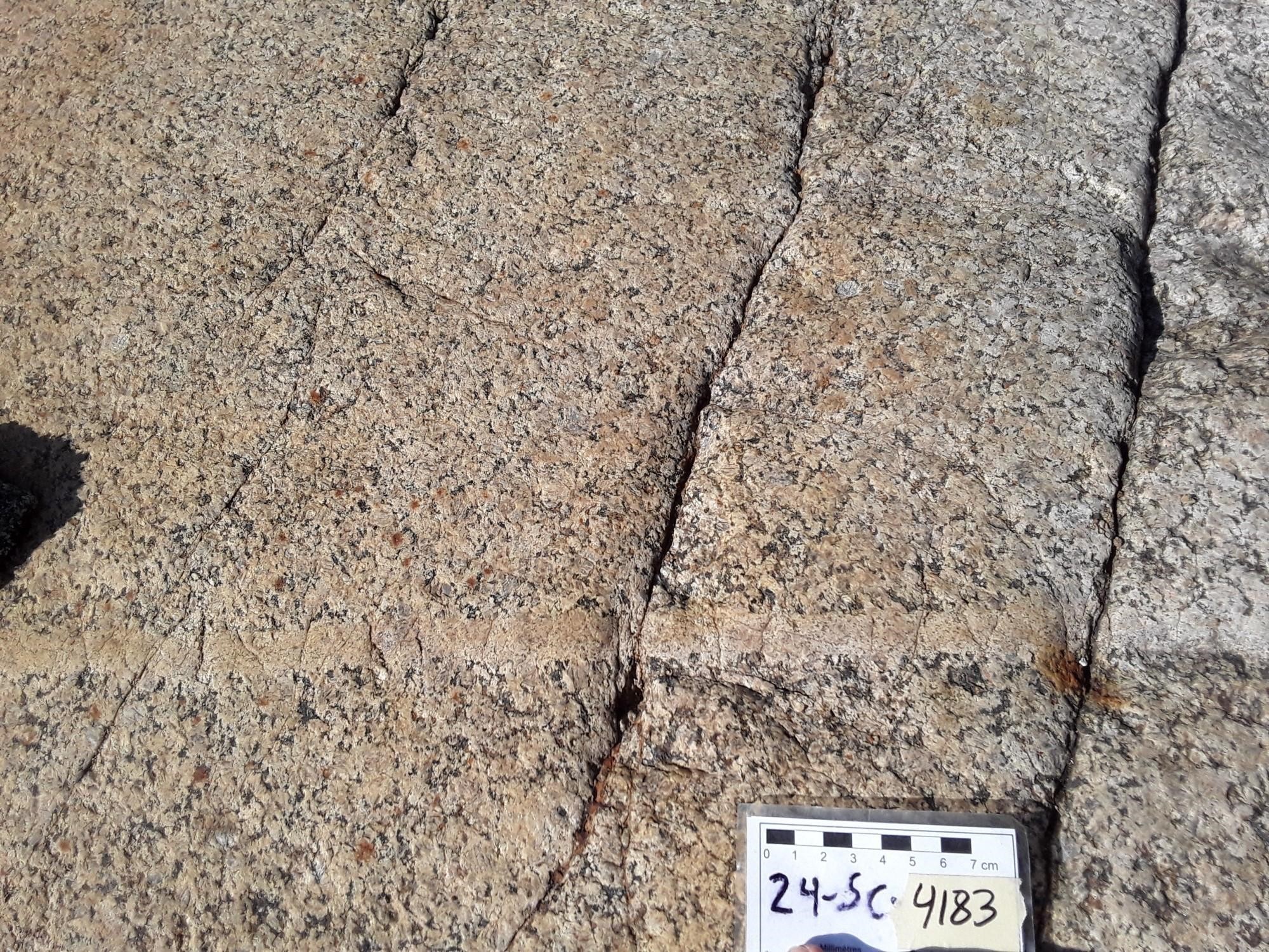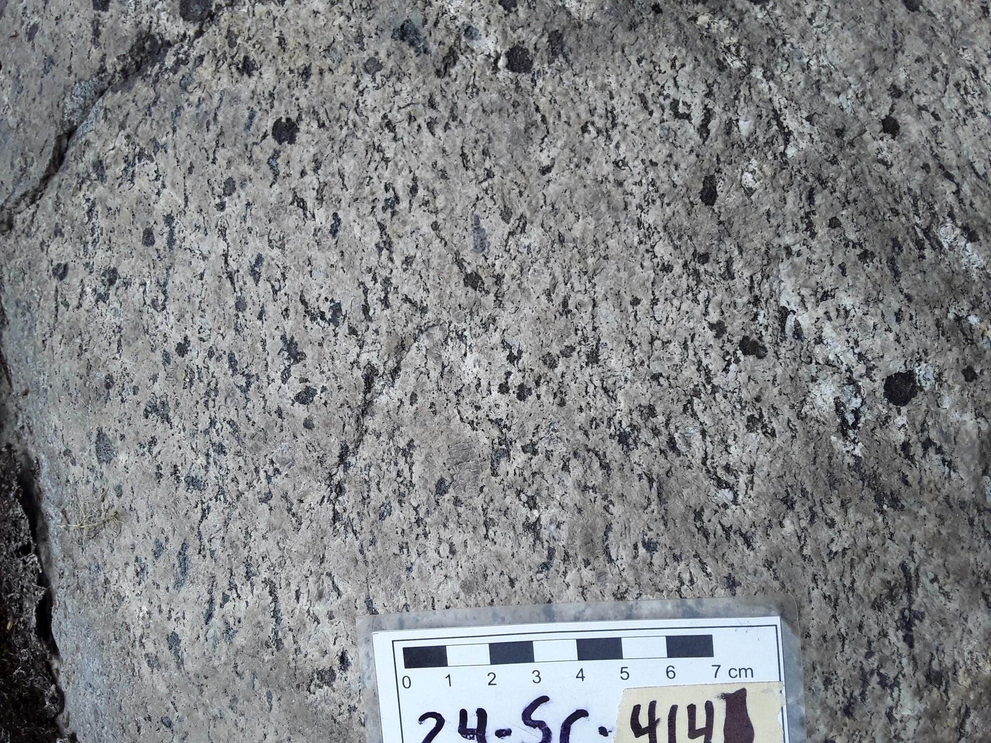 L’unité contient une proportion mineure de granite à feldspath alcalin porphyroïde (affleurement 2024-SC-4027), mais ce faciès est mieux représenté dans l’unité mPtri2.