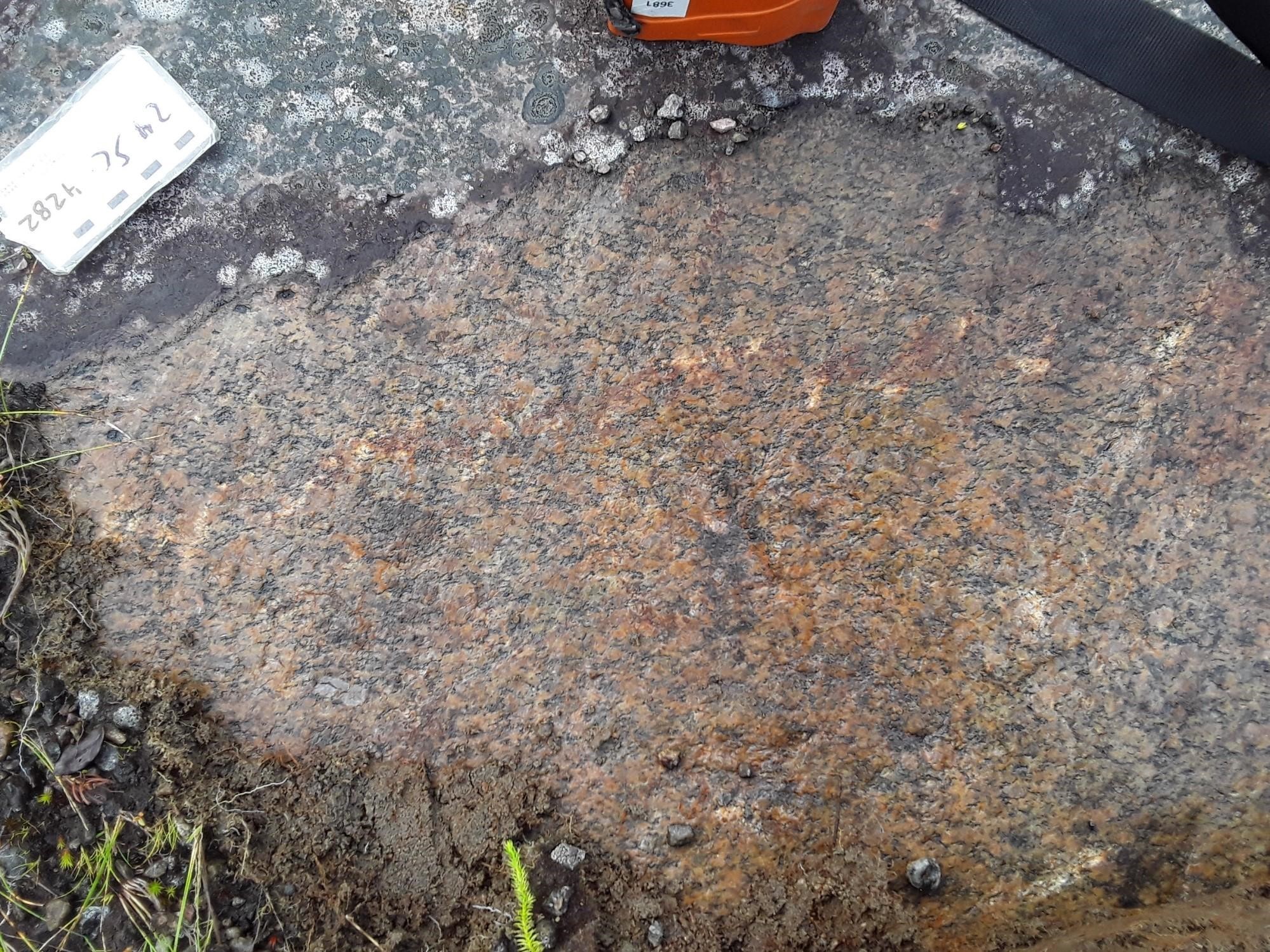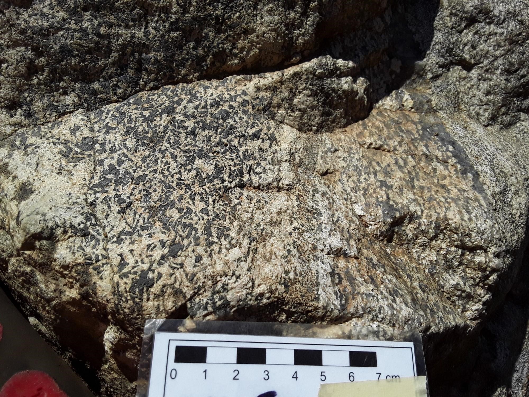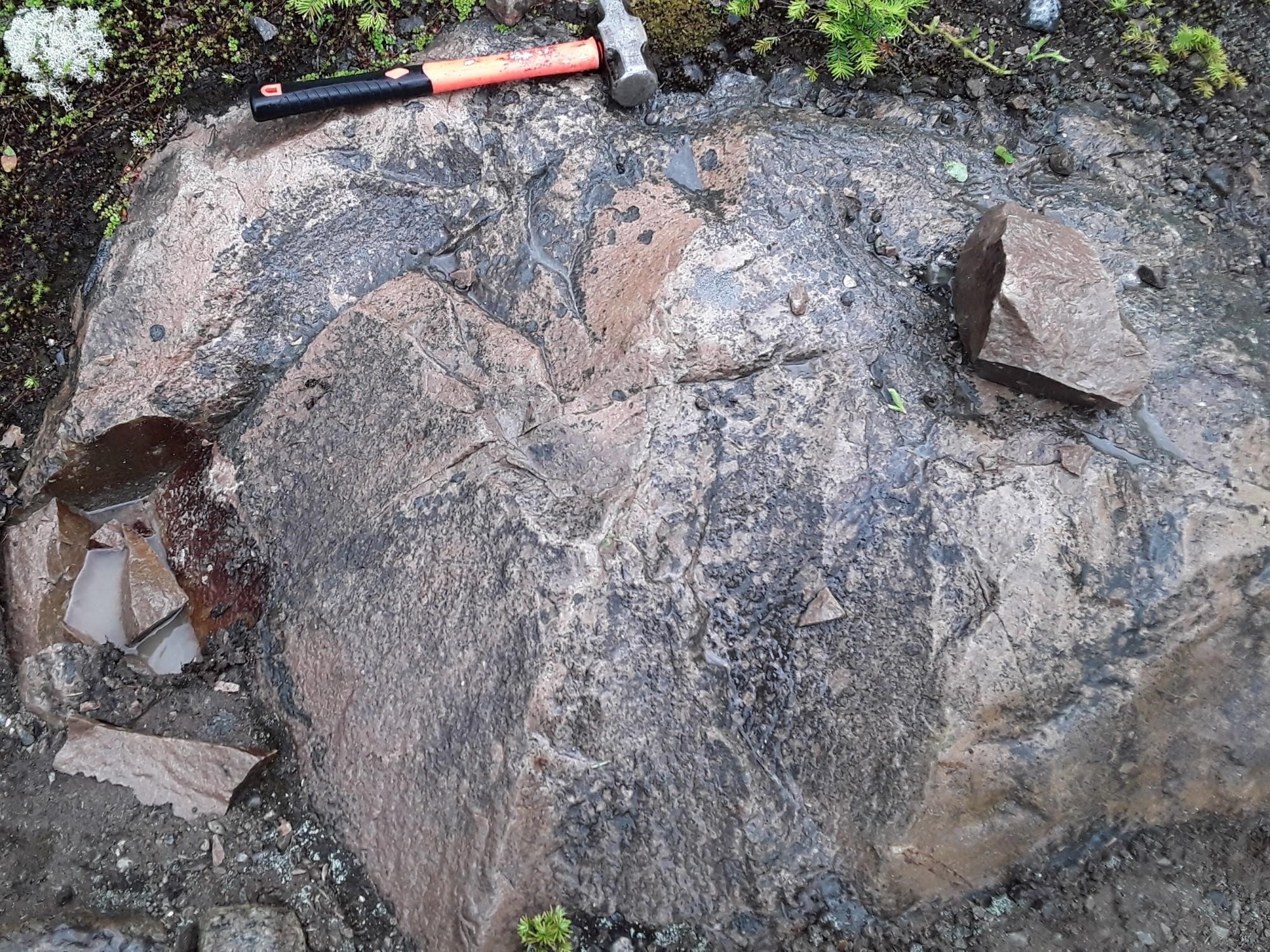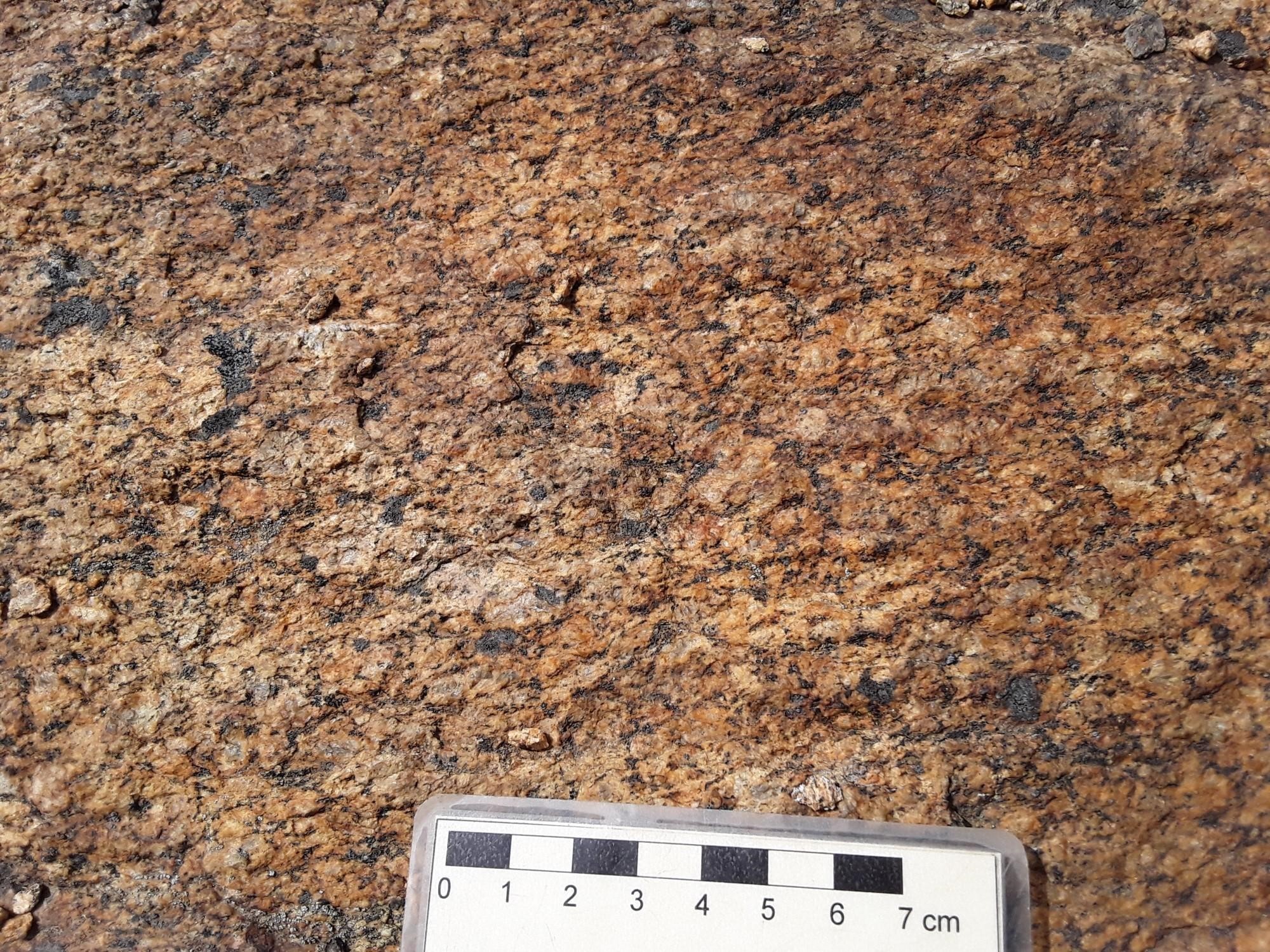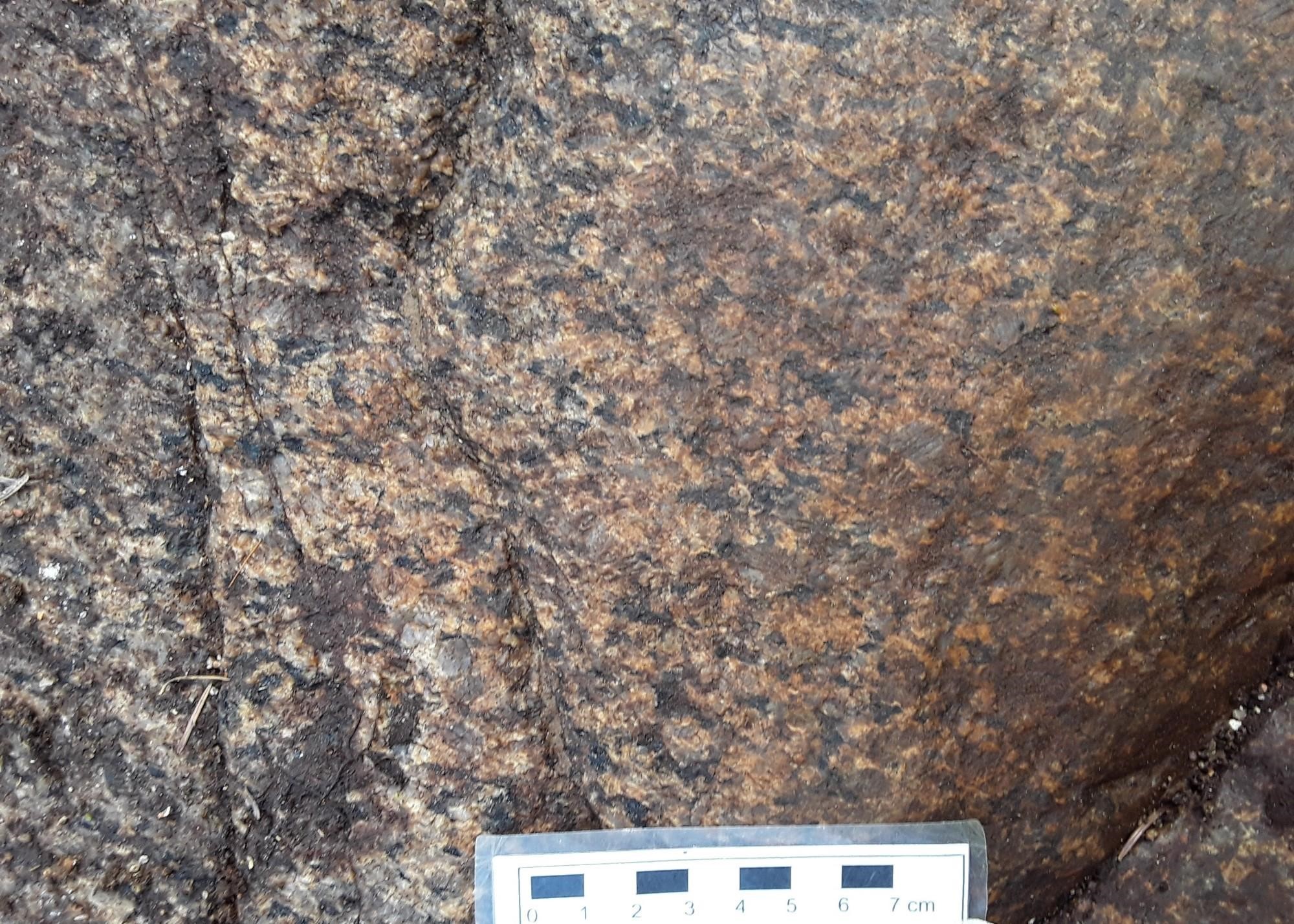 L’unité contient une proportion mineure de granite à feldspath alcalin porphyroïde (affleurement 2024-SC-4027), mais ce faciès est mieux représenté dans l’unité mPtri2.