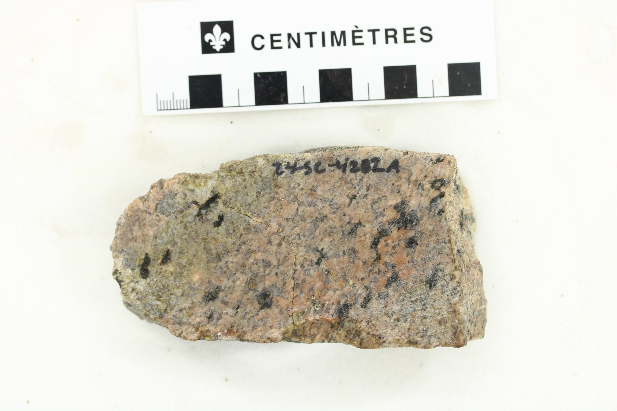 Le granite à feldspath alcalin est rosé à grisâtre en patine d’altération et en cassure fraiche. La roche est à grain moyen et foliée, mais renferme localement jusqu’à 10 % de phénocristaux de feldspath potassique (affleurement 2024-AN-3130). Au microscope, la roche est principalement composée de ∼40 à 60 % feldspath potassique, 20 à 40 % de quartz, 10-15 % de plagioclase ainsi que de faibles proportions de biotite, d’orthopyroxène et de magnétite.