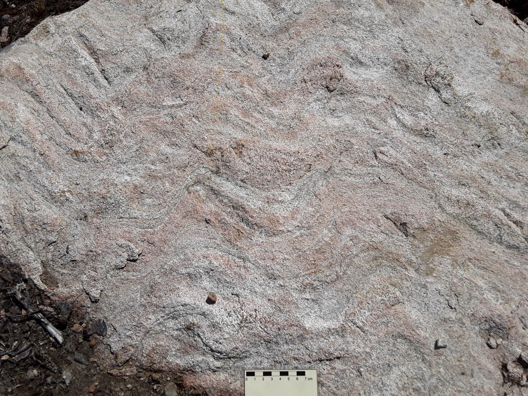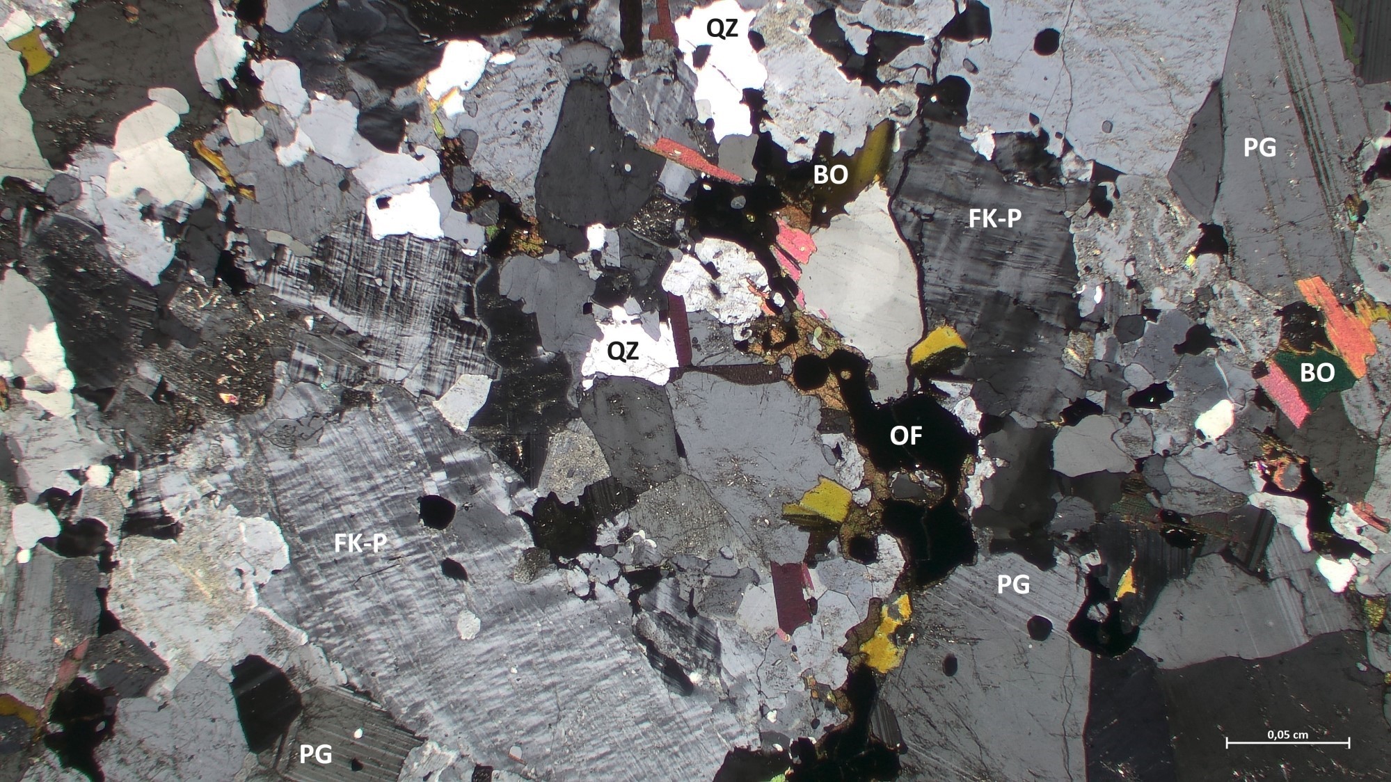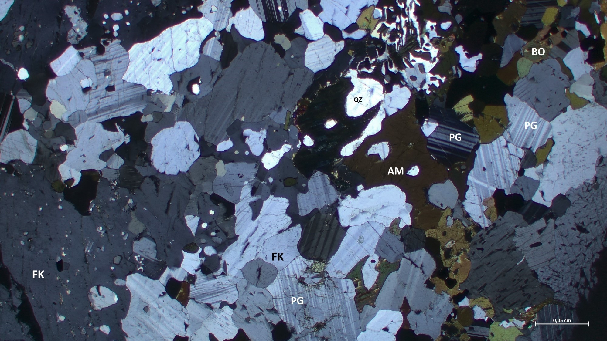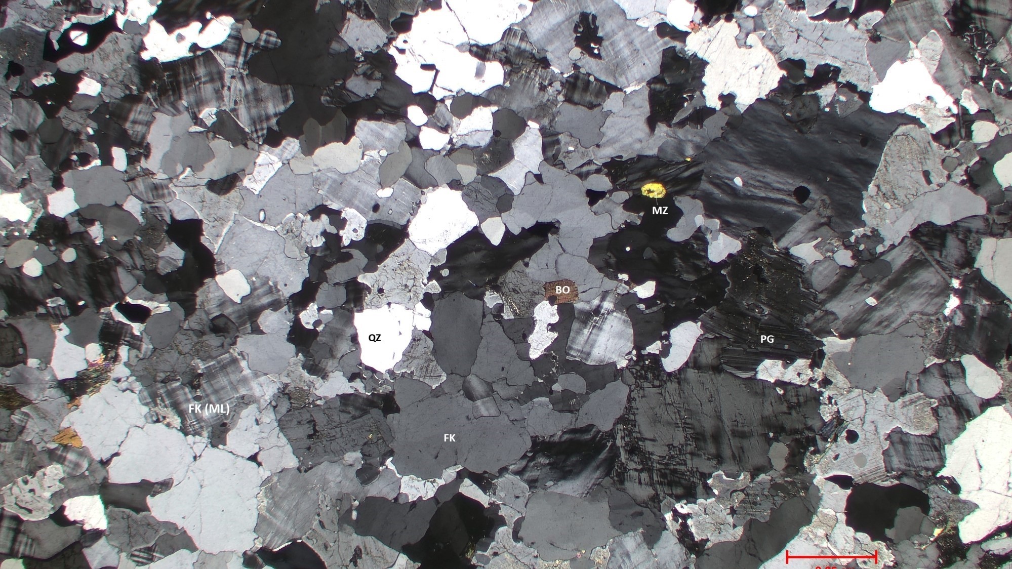 Le granite à feldspath alcalin est de couleur rose-gris en patine d’altération et rose-blanc en cassure fraiche. Il est de granulométrie moyenne à grossière et localement porphyroïde (p. ex. 20-AM-127 et 20-FT-3054). La roche est généralement peu déformée. Au microscope, elle contient du quartz avec une extinction roulante. Le feldspath potassique, de taille millimétrique, est plus abondant que le plagioclase et quasi systématiquement perthitique en affleurement. Le plagioclase est localement séricitisé. La biotite et la magnétite sont plus au moins rares dans ce faciès et elles constituent les phases accessoires avec l’apatite et le zircon.