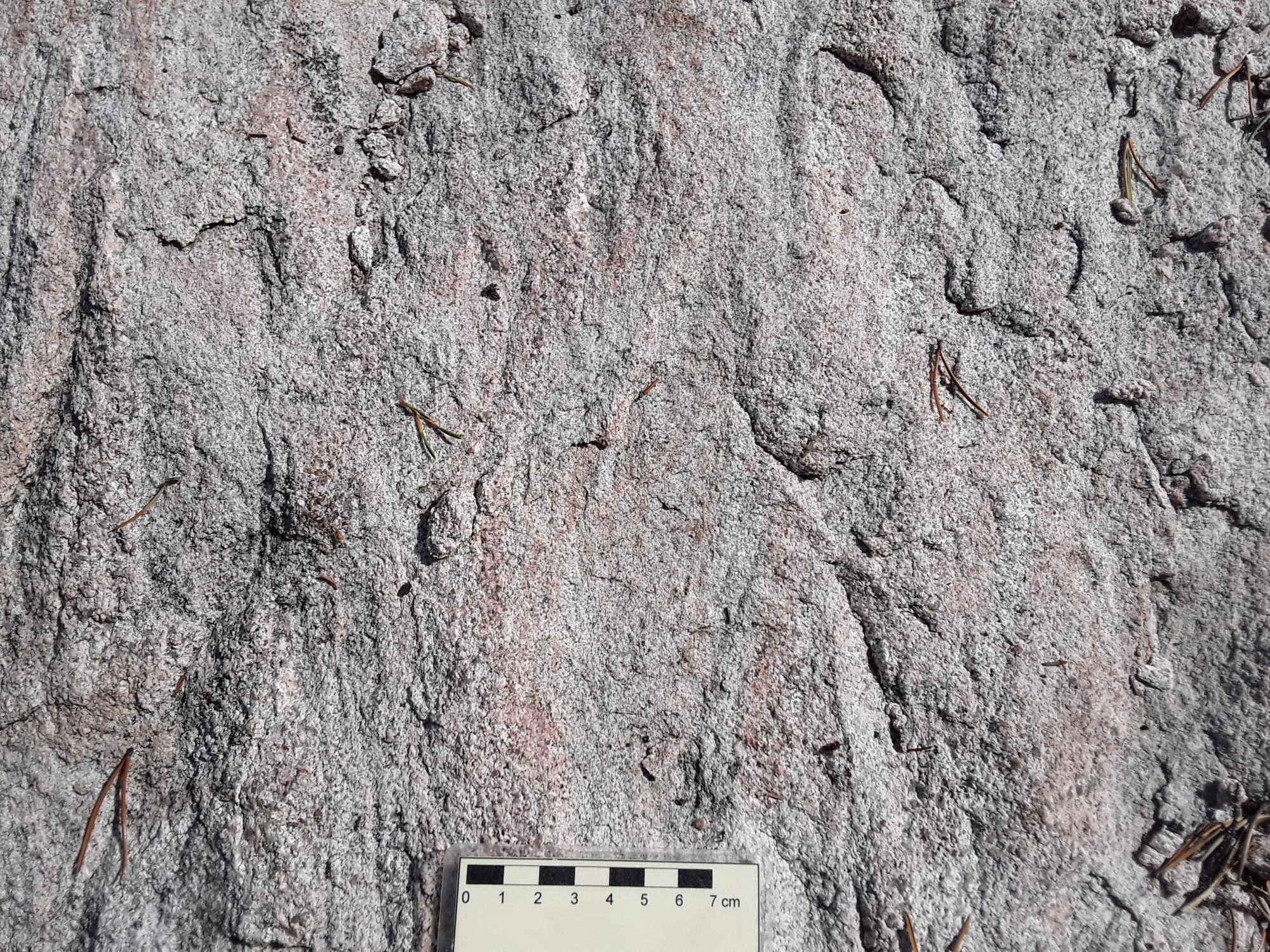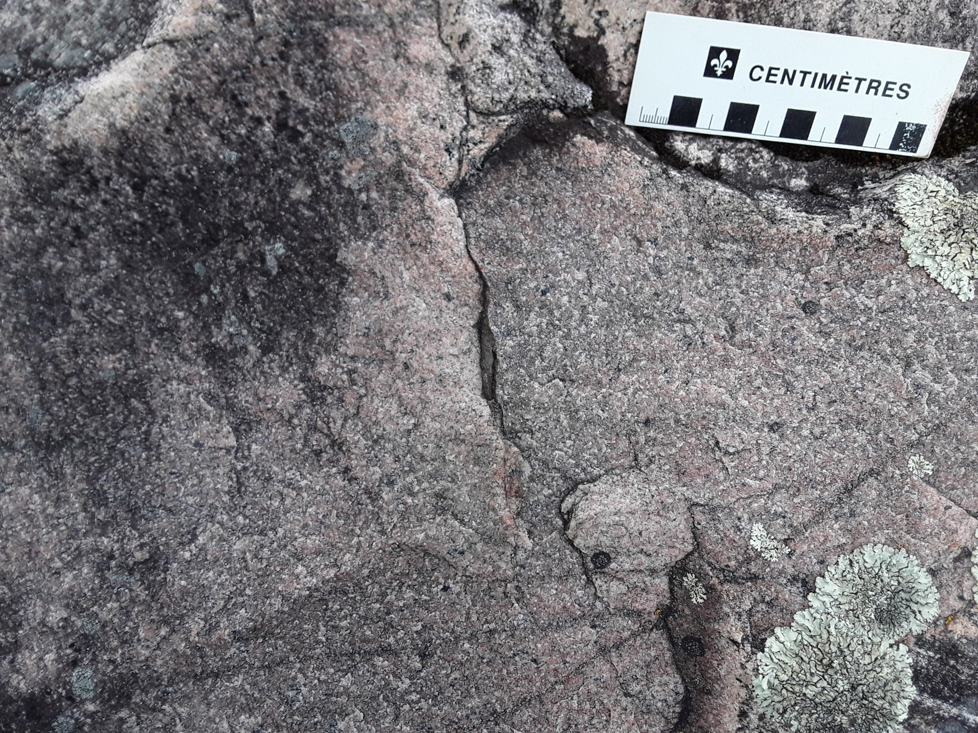 Le syénogranite est de teinte gris rosâtre en patine d’altération et rose-blanc en surface fraiche. Il est de texture grossière et porphyroïde à phénocristaux de feldspath potassique de taille centimétrique de 1 à 4 cm (p. ex. affleurements 20-AM-130, 20-AM-129 et 20-AM-128). La roche est composée essentiellement de quartz, de plagioclase, de feldspath potassique, d’amphibole, de magnétite et de biotite. Dans ce faciès, un dyke de carbonatite connu sous le nom de Carbonatite de Girardville, mesurant de 1 à 2 m d’épaisseur apparente et orienté 350°/48°, s’injecte dans le syénogranite dans la partie SW du pluton. La carbonatite est composée de calcite, de gros cristaux d’ilménite, ainsi que de microcline, de phlogopite, d’ægyrine, d’apatite (concentrée dans un niveau millimétrique) et de fluorine (Moukhsil et El Bourki, 2021). Cette carbonatite a été étudiée en détail par Saint-Laurent (2024) et Saint-Laurent et al. (2022, 2023).