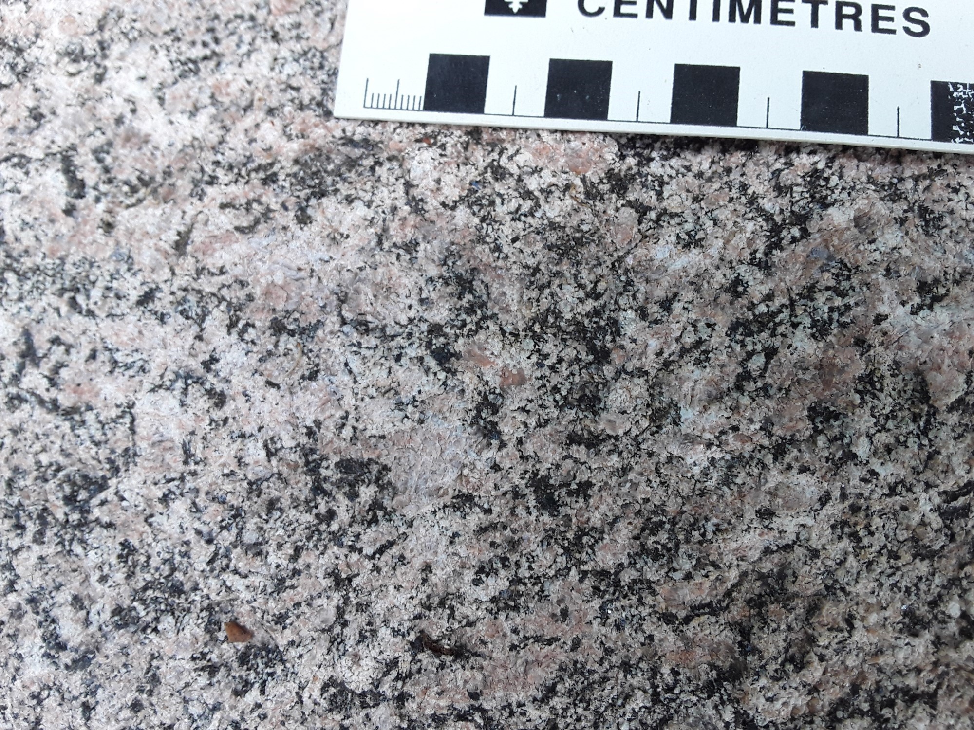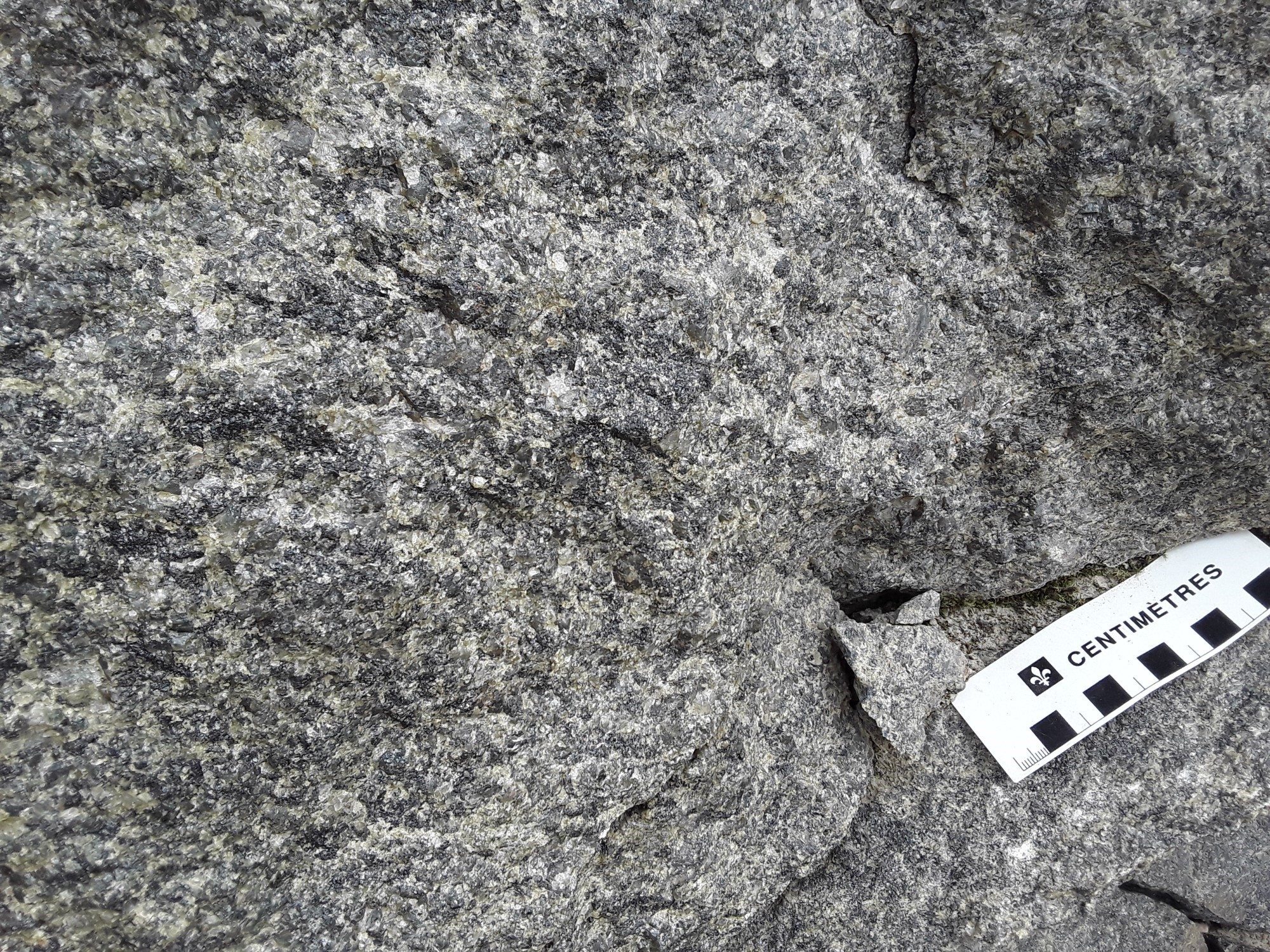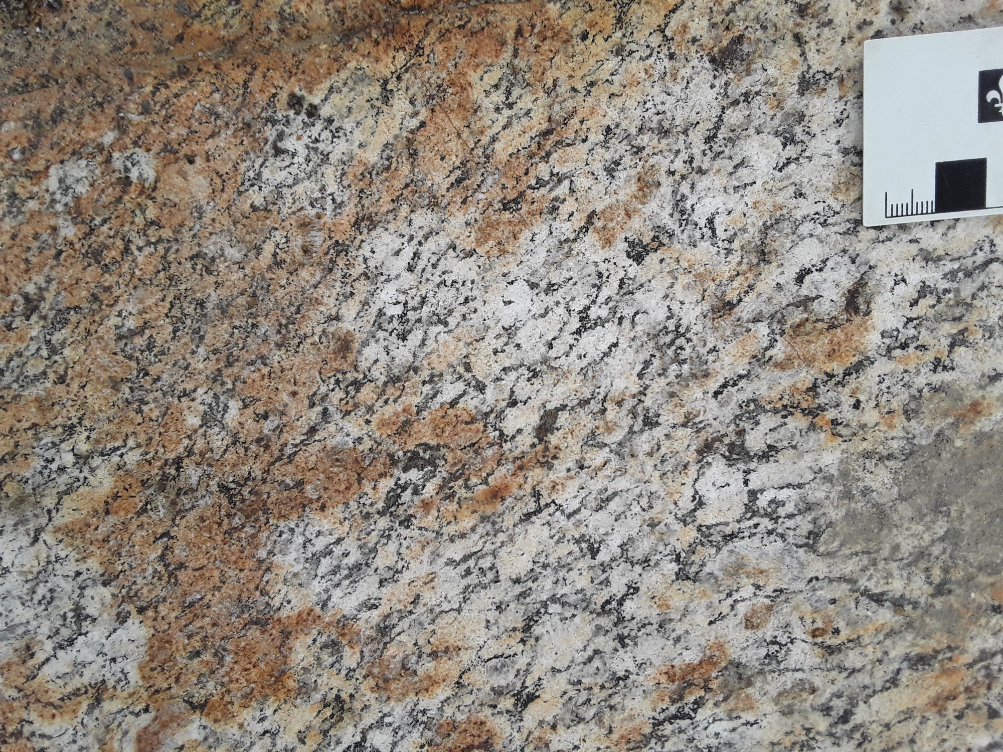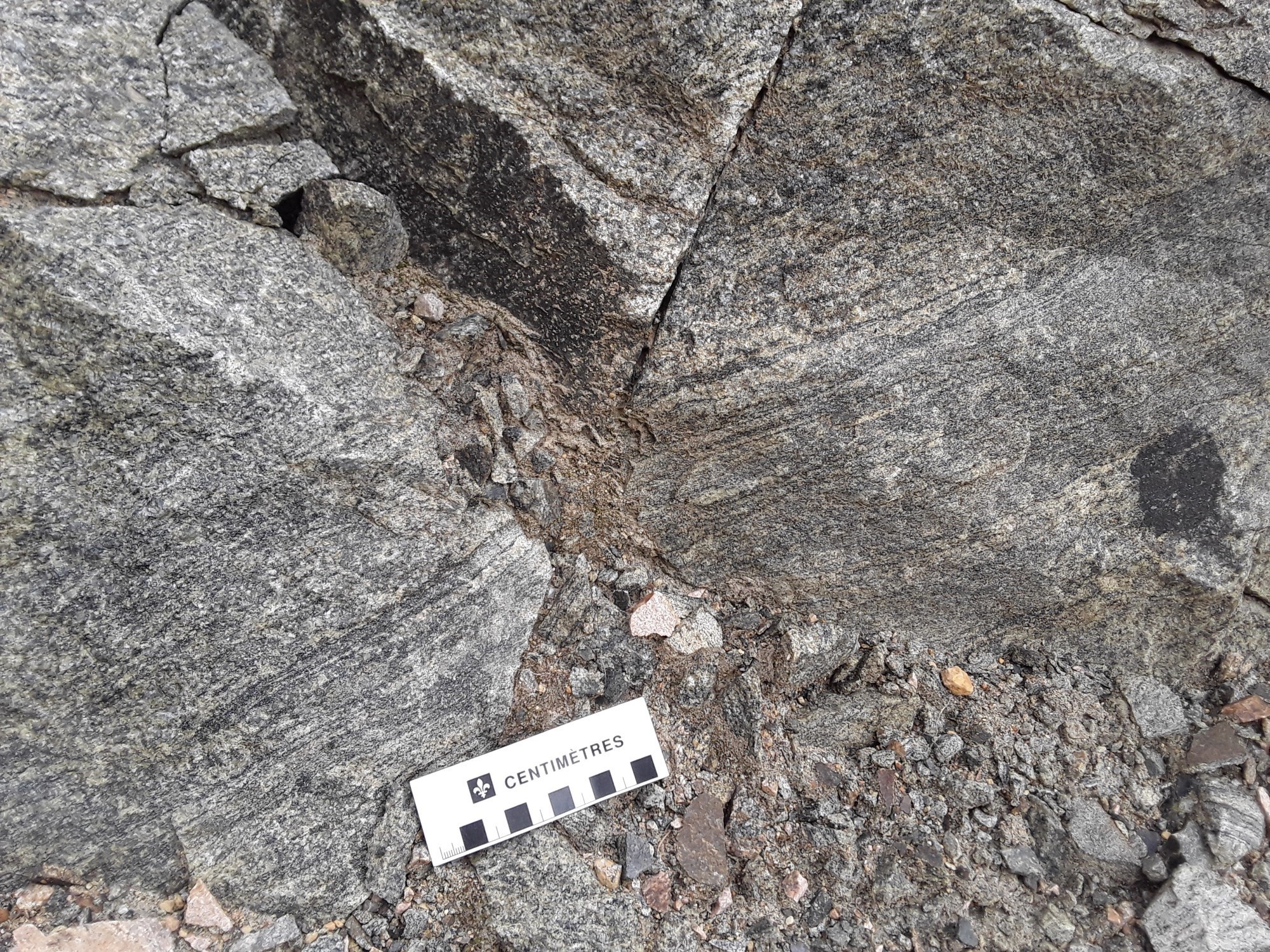 Le Pluton de Johnny est caractérisé également par la présence de proportions moindres de granodiorite (p. ex. affleurement 22-CS-04) et de gabbronorite migmatitisée à mobilisat tonalitique (p. ex. affleurement 20-FM-2052). Cette dernière est à grain fin, foliée et de couleur beige brunâtre en cassure fraiche et brun grisâtre en surface d’altération. Localement, elle est granoblastique à phénocristaux de plagioclase et à texture subophitique, en plus d’être coupée par des injections millimétriques à centimétrique de granite et des veinules de magnétite.