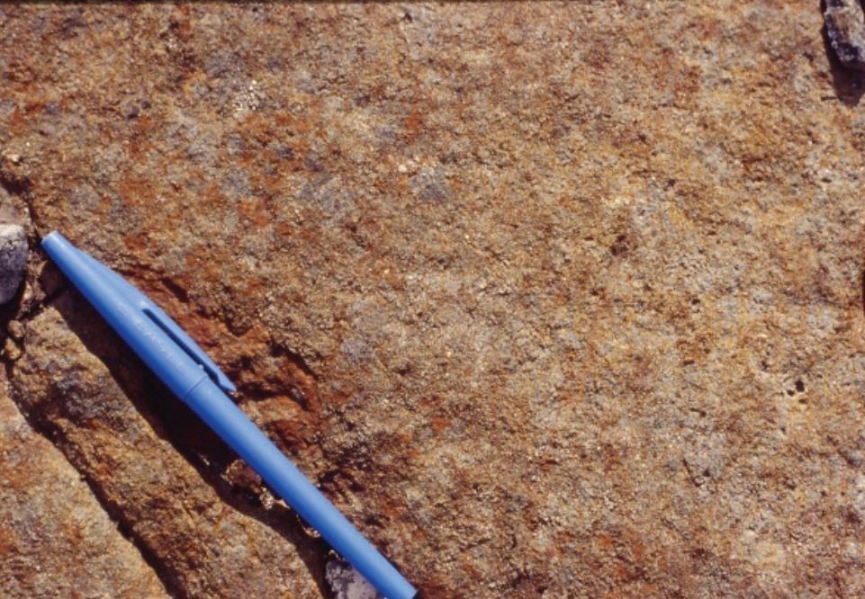 La péridotite à plagioclase contient communément des sulfures (pyrrhotite, chalcopyrite, pentlandite) finement disséminés, semi-massifs à massifs qui ont donné des valeurs intéressantes en Ni-Cu ± Pd ± Co (zones minéralisées d’Amiral et d’Amiral TR-4; Moukhsil et al., 2012). Une des caractéristiques de l’unité mPtou3 est qu’elle présente un faciès très altéré où la roche est très friable et riche en biotite et phlogopite (30 à 50 %), accompagnée de magnétite et d’hydroxydes de fer (limonite). Ces caractéristiques sont typiques des roches ayant subi une altération hydrothermale. L’étude en lame mince des roches altérées indique qu’il peut s’agir de websterite à olivine ou de lherzolite contenant de l’orthopyroxène primaire préservé, de la magnétite et des traces de carbonates.