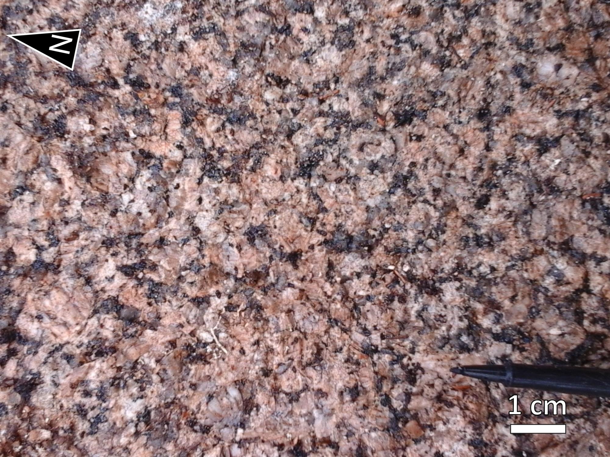 Pluton d’Artigny 1 (nAart1): Granite et monzodiorite quartzifère, localement granodiorite, massives, porphyroïdes à phénocristaux de feldspath potassique; enclaves de paragneiss