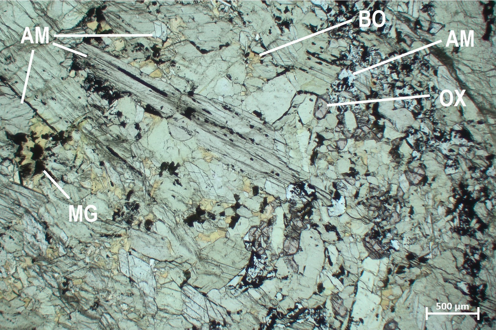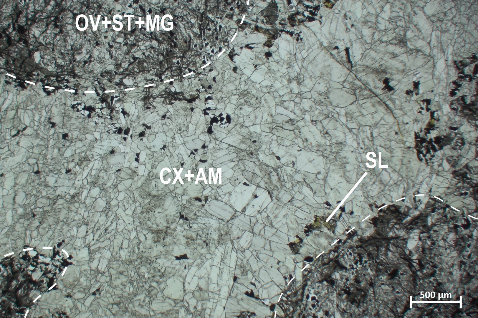 In these rocks, pyroxene was replaced by an actinolite-tremolite assemblage is thought to have occurred during the retrogressive metamorphic event. Tremolite is a syntectonic to post-tectonic mineral and is oriented at a certain angle relative to the Sn foliation. The outcrops’ brownish surface is covered by negative relief fractures containing serpentine, talc, tremolite and magnetite. These fractures are arranged in diamond patterns. Magnetite and serpentine veinlets are also visible within the peridotite facies.