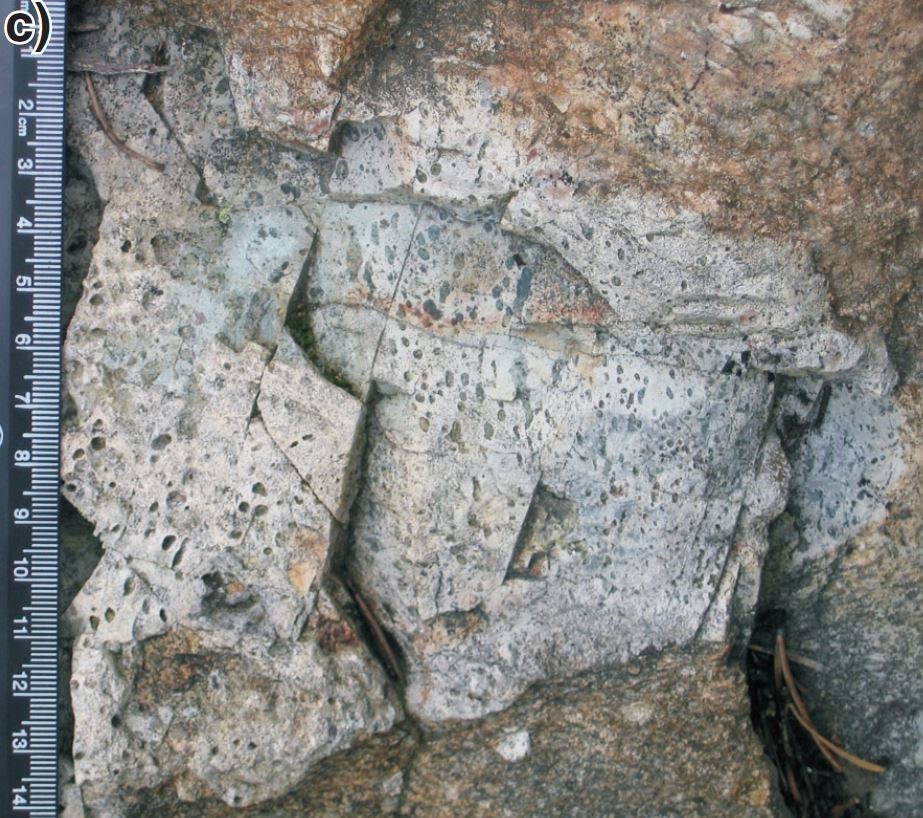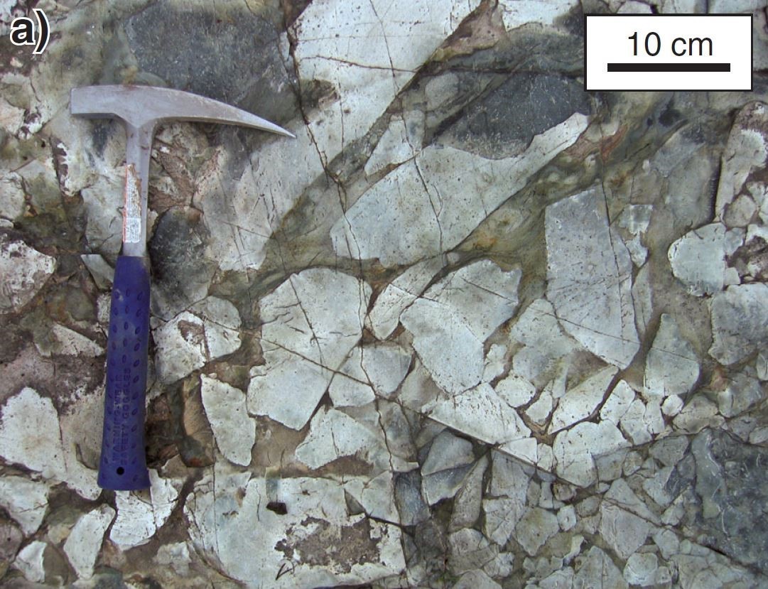 L’unité nAtd3 est essentiellement constituée de rhyolite et de brèche dacitique (Beausoleil et al., 2004; Ross et al., 2008b). Elle forme une lentille d’une longueur de 2,8 km et d’une largeur apparente de 400 m dans la partie occidentale de l’unité nAtd1 (Ross et al., 2008b). En affleurement, la roche est blanchâtre à rosée en surface altérée, grise à gris clair en surface fraiche, aphyrique, massive et bréchique. La rhyolite est décrite comme une brèche monogénique à fragments jointifs (clast-supported). Des structures en « casse-tête » sont localement observées, indiquant une bréchification in situ. Les fragments de rhyolite, d’une taille variant de 0,5 à ~30 cm, sont subarrondis, de granulométrie très fine, dépourvus de rubanement d’écoulement et contiennent des phénocristaux de quartz (<1 %) et de feldspath (3 à 5 %) atteignant une taille de 1 mm. La mésostase des fragments est principalement formée de matériel quartzo-feldspathique accompagné de proportions mineures d’épidote et de chlorite. Des minéraux opaques sont présents sous la forme de disséminations ou de veinules. La brèche rhyolitique est bien triée si l’on ne tient compte que des fragments dont le diamètre est >0,5 cm. La matrice de la brèche est constituée de fragments de rhyolite beaucoup plus petits (~0,05 à 0,5 mm) et de cristaux de feldspath désagrégés, dans un ciment de chlorite, d’épidote et de minéraux opaques. La brèche rhyolitique est interprétée comme un dôme extrusif ou une épaisse coulée de lave fragmentaire (Ross et al. 2008b, 2011b). Les analyses géochimiques indiquent que la rhyolite est d’affinité tholéiitique à transitionnelle (Ross et al. 2008b).