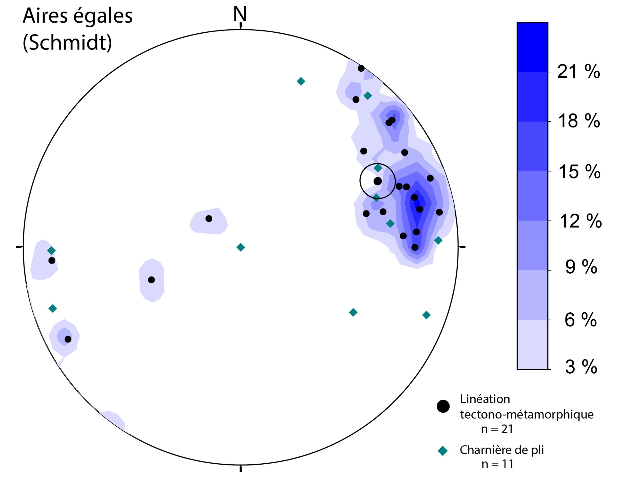 | Linéation Ln | Linéation minérale tectono-métamorphique et d’étirement | 64 | 31 | 21 | Les linéations concordent très bien avec les charnières de plis |