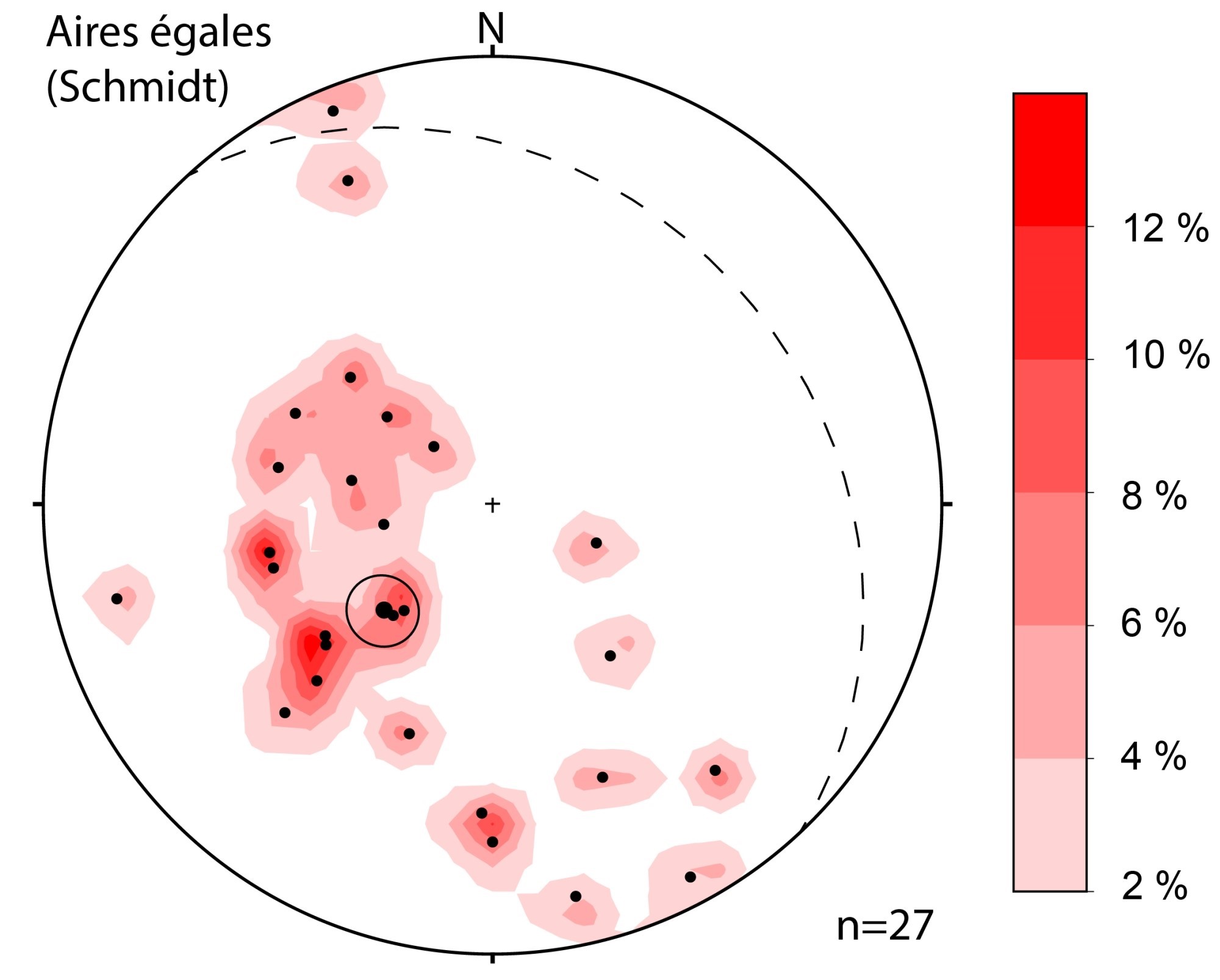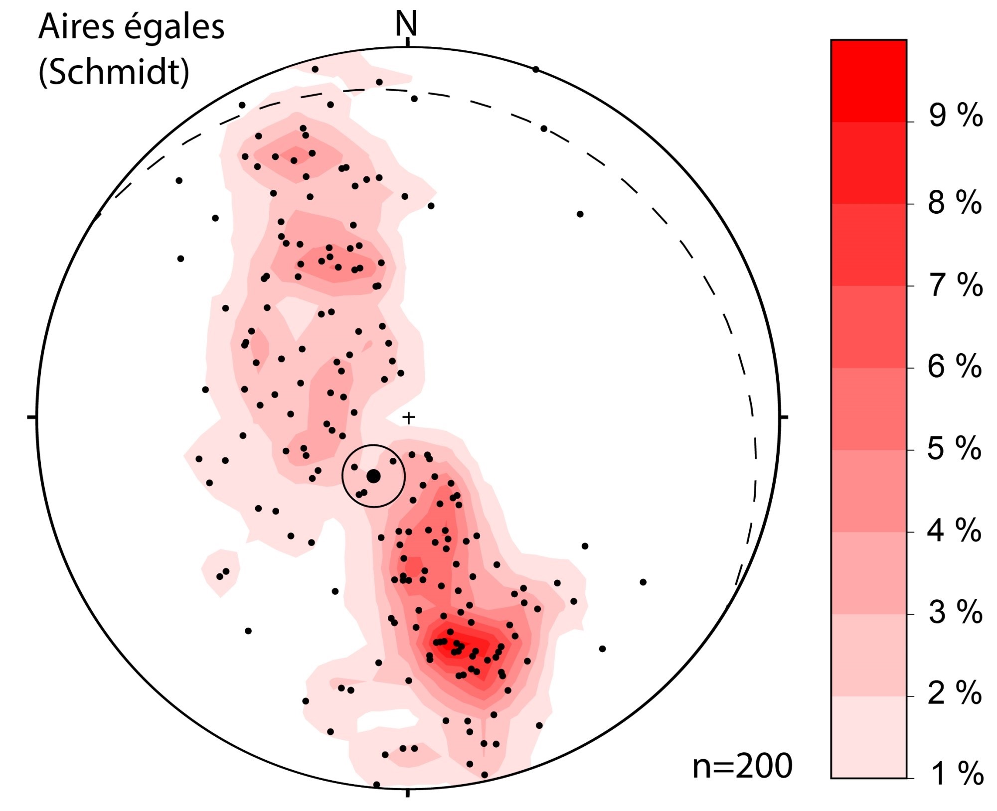 | Foliation Sn | Foliation tectono-métamorphique | 302 | 15 | 200 | Les données sont dispersées uniformément le long d’un axe. Le domaine serait ainsi plissé selon un plan axial ENE-WSW. La direction moyenne est faussée par de nombreuses données très hétéroclites, probablement le résultat de structures mineures comme le bassin au nord du domaine ou encore une mauvaise identification de la Sn+1. Le pendage faible à modéré est davantage le résultat de la grande variété de mesures de pendage, tant vers le NNW que le SSE, que d’un pendage moyen représentatif |