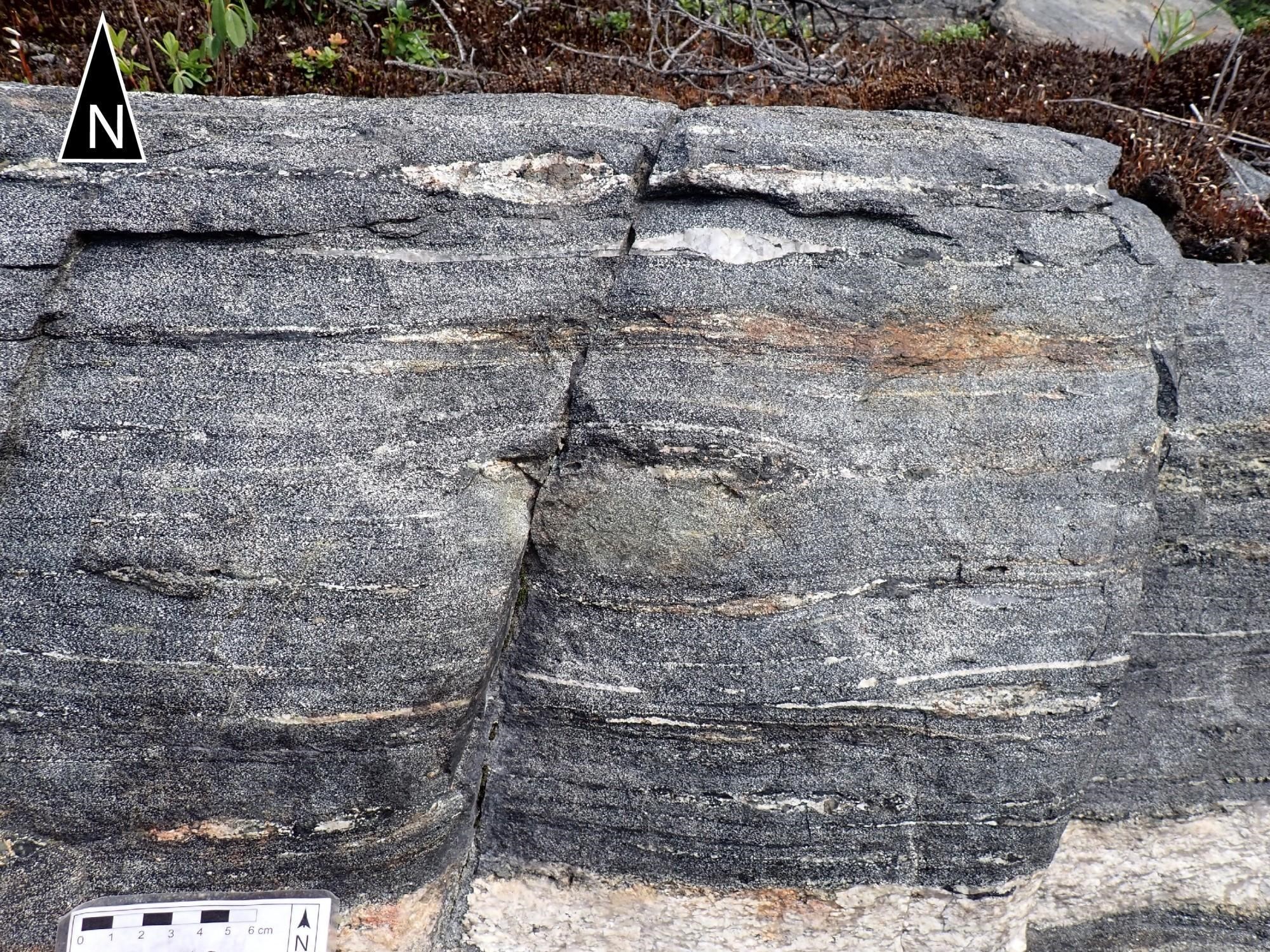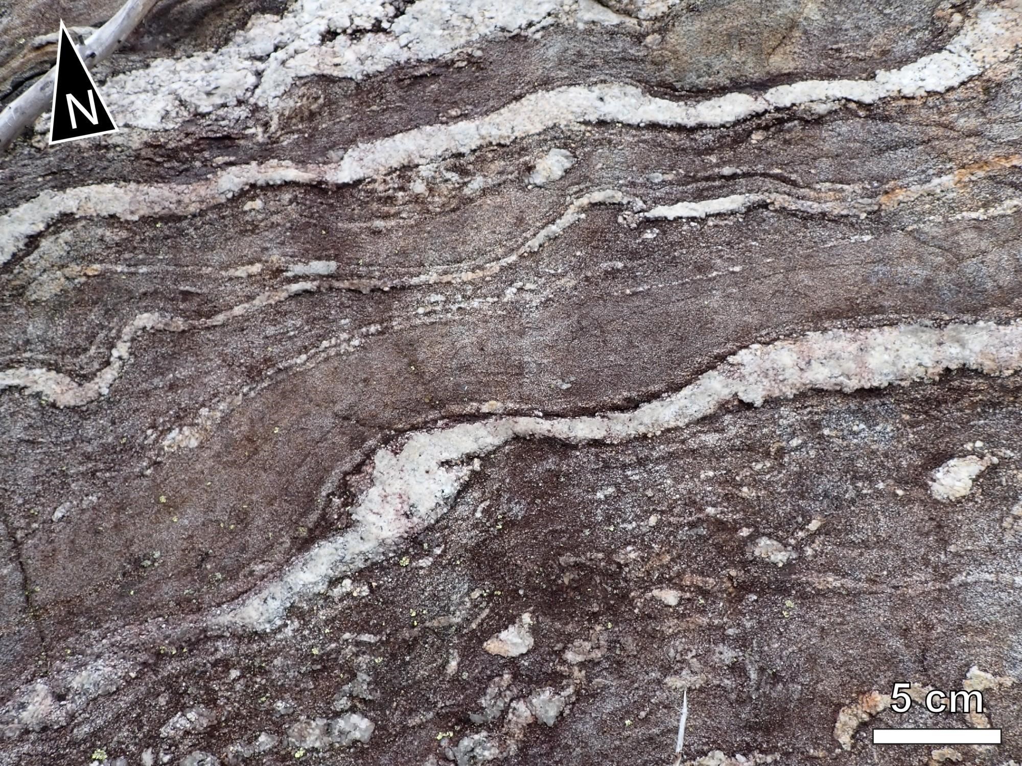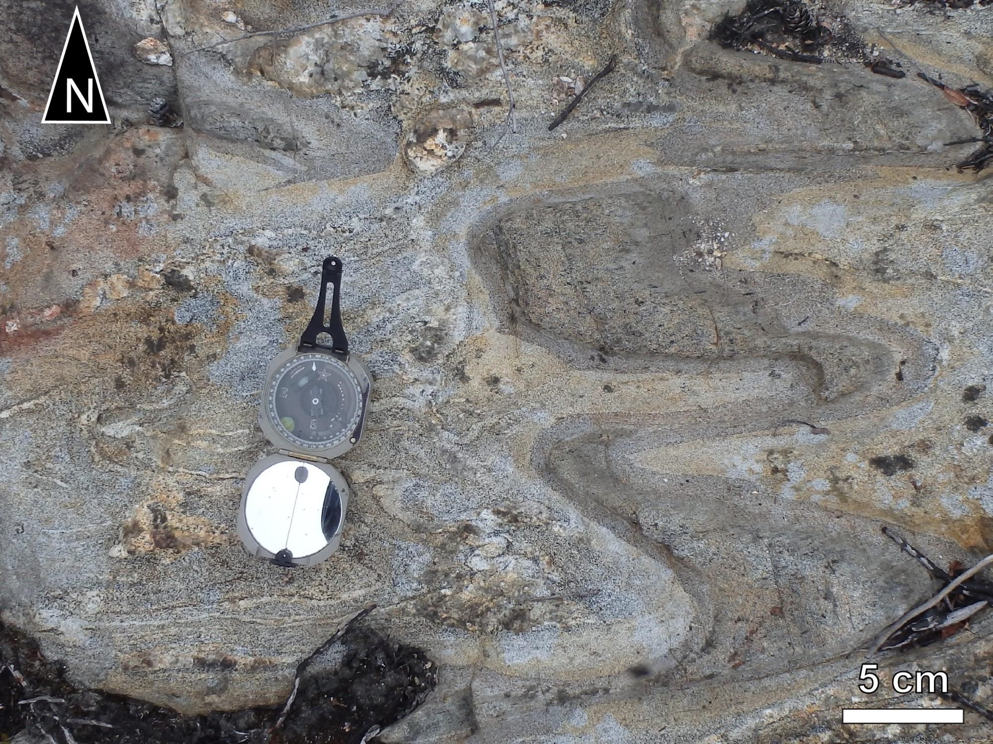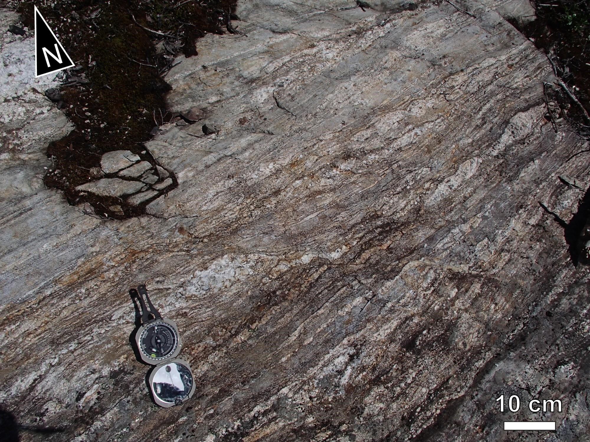 Le litage compositionnel S0, bien que couramment oblitéré par le métamorphisme, est visible par endroits dans le paragneiss de la Formation de Prosper. Il est alors transposé le long de la fabrique principale.