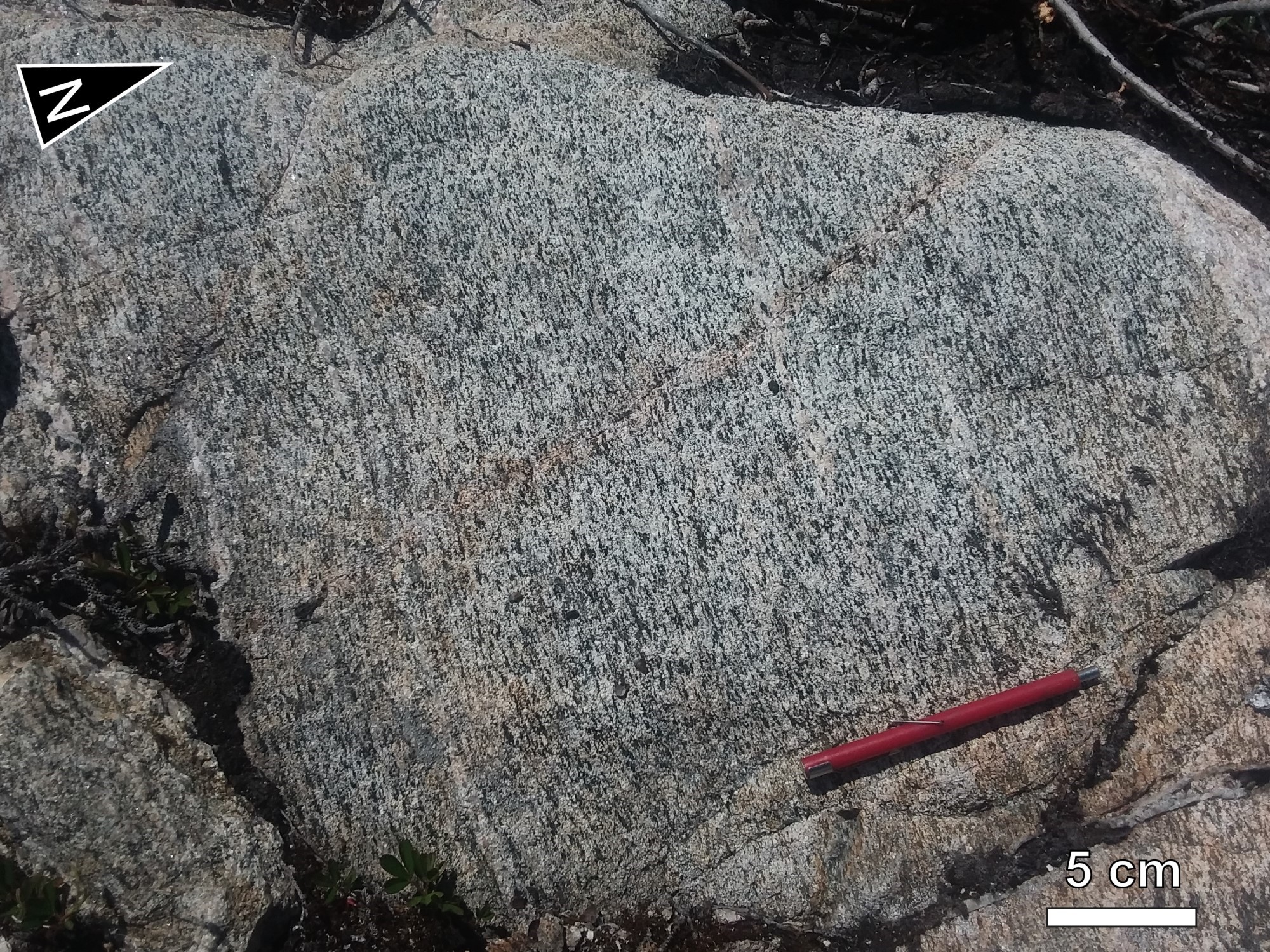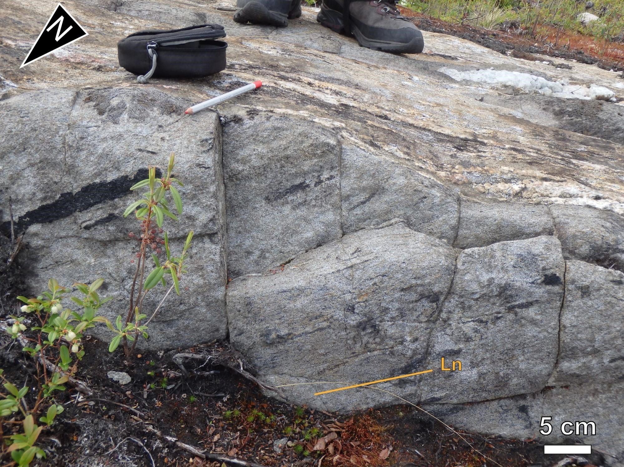 La linéation principale est essentiellement vers l’est avec des plongées faibles à modérées. Elle est marquée par des linéations tectono-métamorphiques ainsi que par l’allongement des cristaux de quartz dans le granite par endroits. Les linéations concordent fortement avec les charnières de plis, indiquant qu’elles se sont probablement formées lors de l’épisode de plissement.