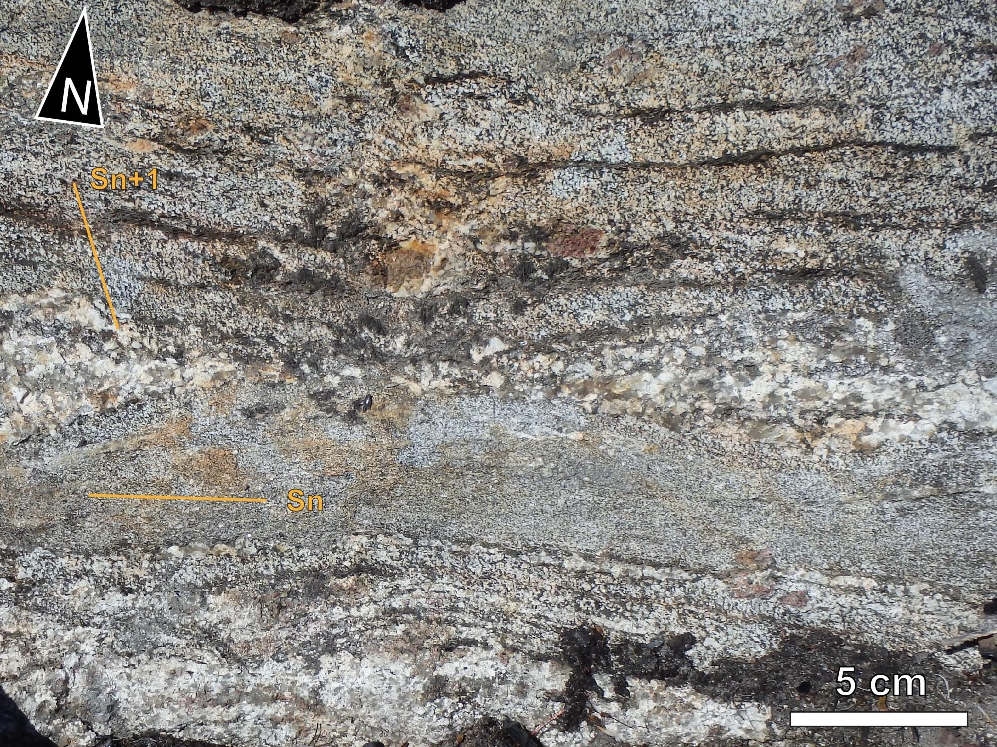 Une fabrique Sn+1, d’orientation principale NW-SE, affecte la région. Celle-ci est visible localement par un deuxième alignement de la biotite.