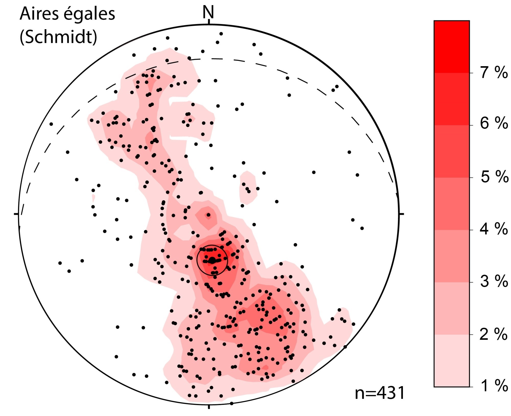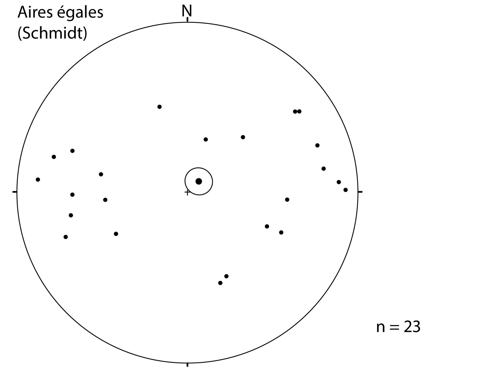 | Foliation Sn | Foliation tectonométamorphique | 265 | 19 | 431 | Les données sont dispersées le long d’un pli orienté à 265° |