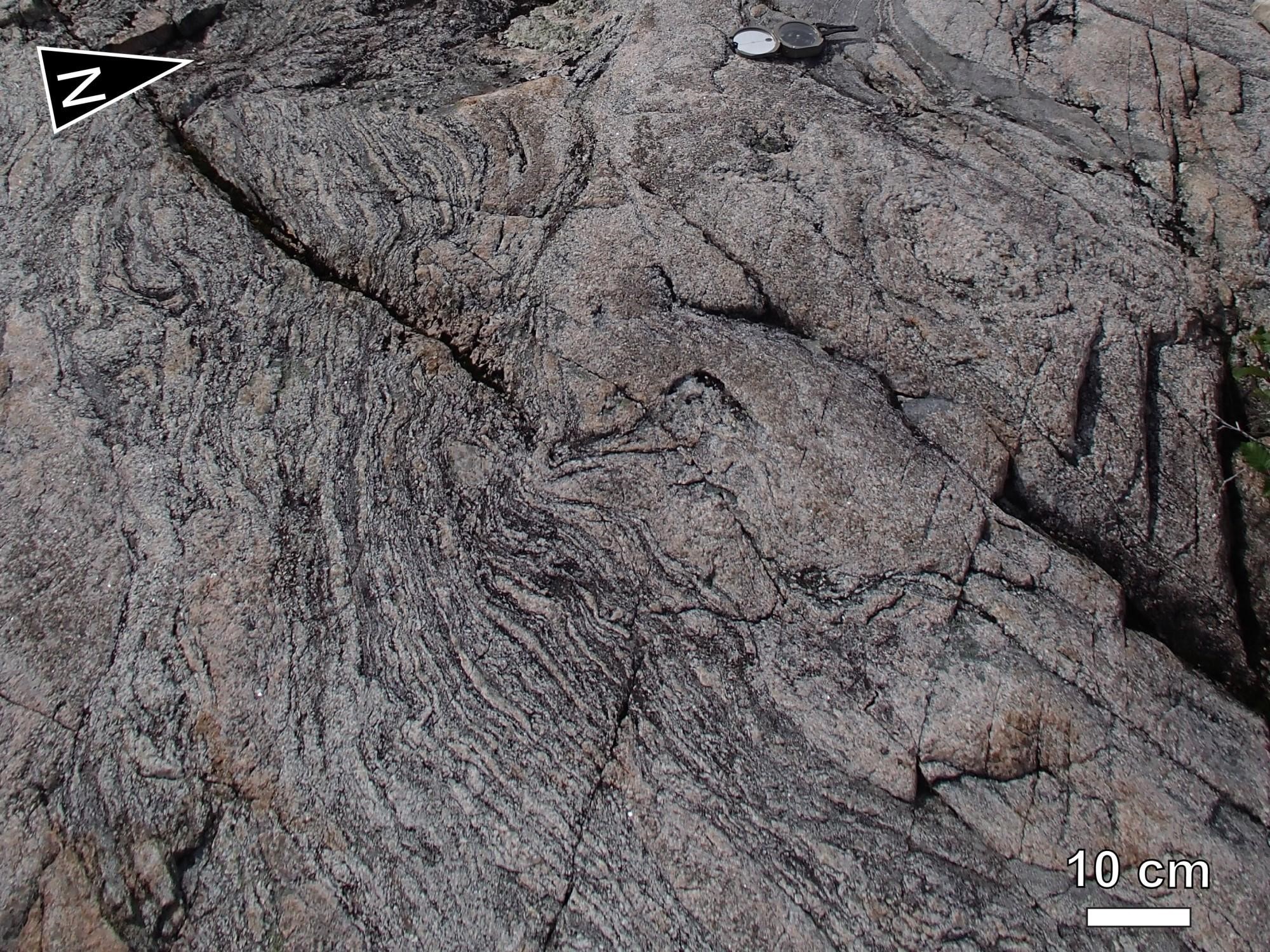 À l’échelle de l’affleurement, des plis mineurs dans le paragneiss sont mis en évidence par les injections granitiques. Ces plis sont typiquement transposés dans la fabrique principale.