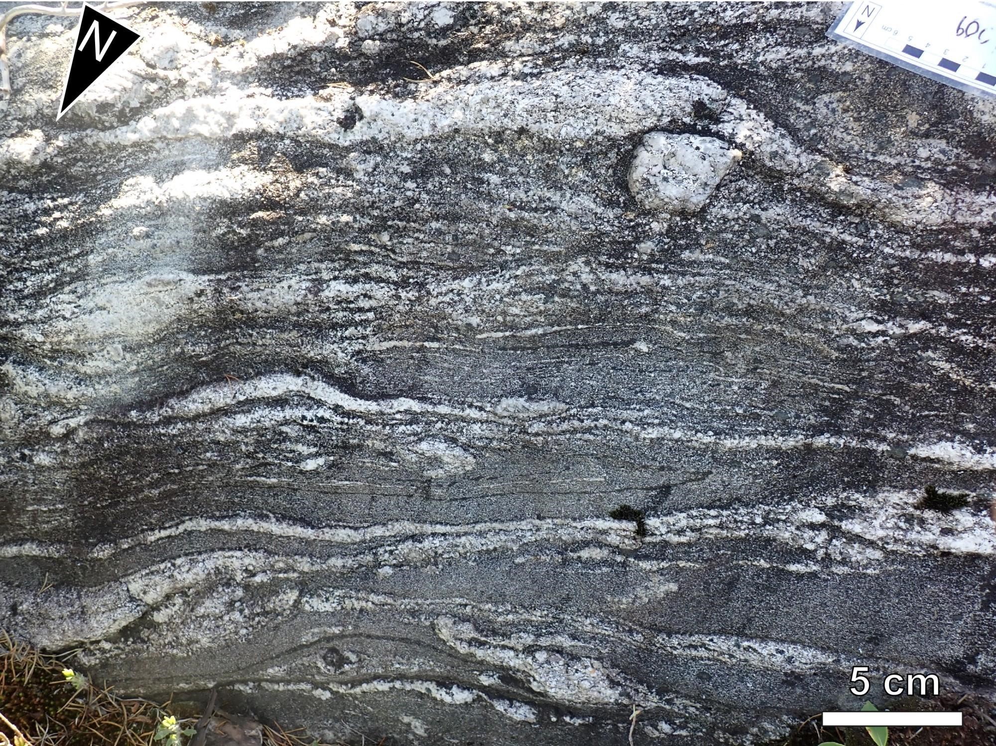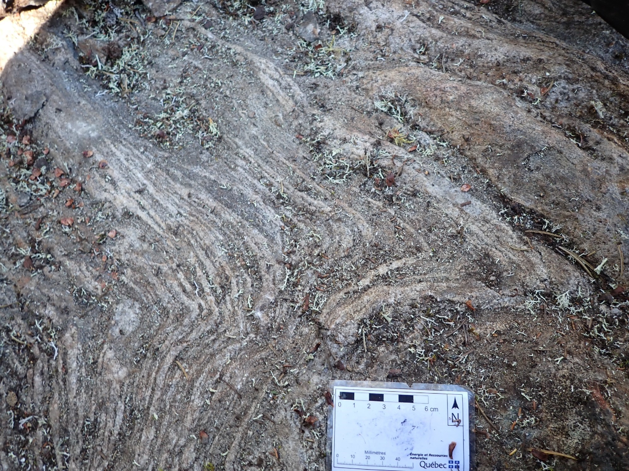 Le litage compositionnel S0, bien que couramment oblitéré par le métamorphisme, est visible par endroits dans les paragneiss de la Formation de Prosper. Il est alors transposé le long de la fabrique principale Sn.
