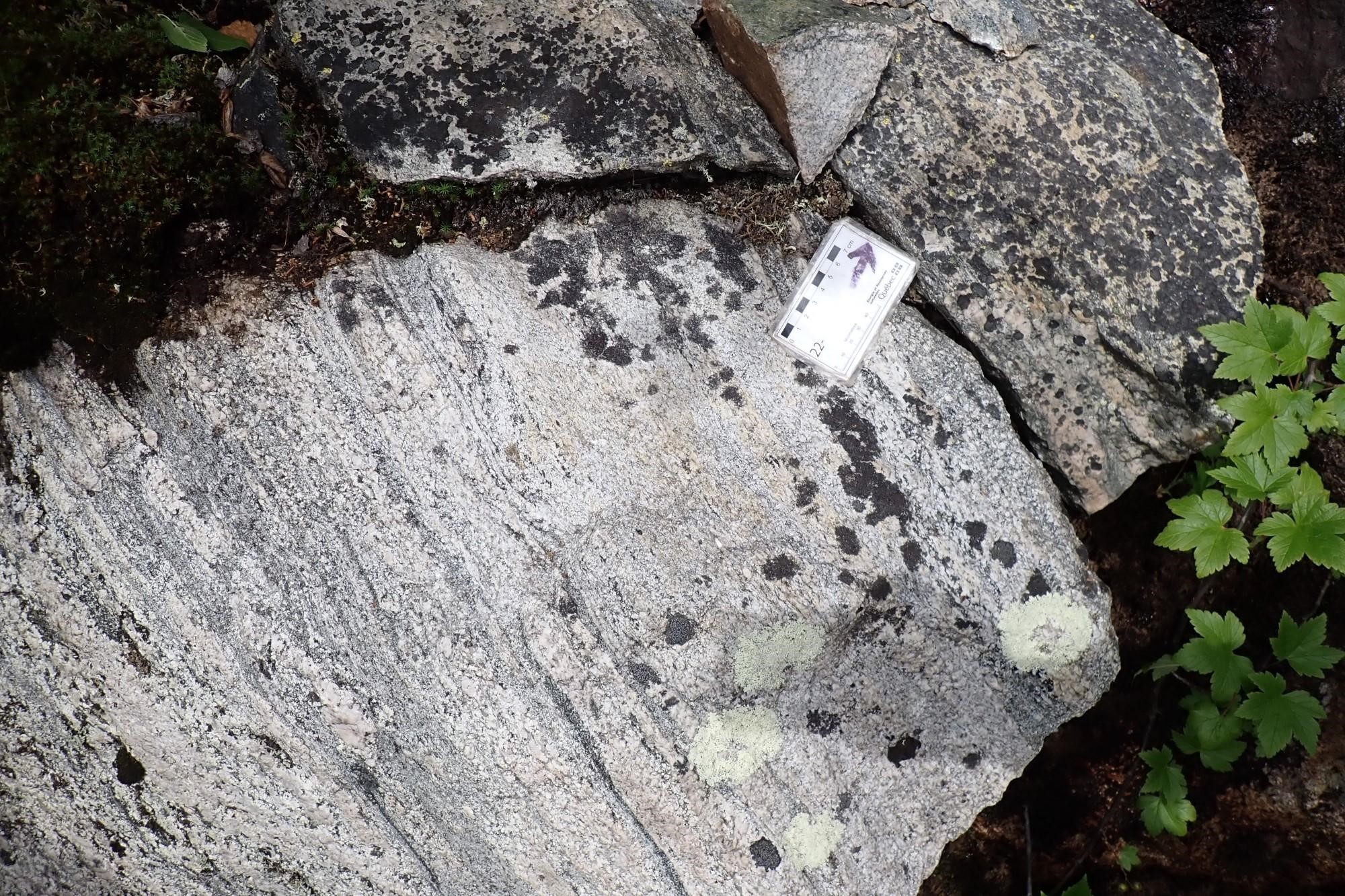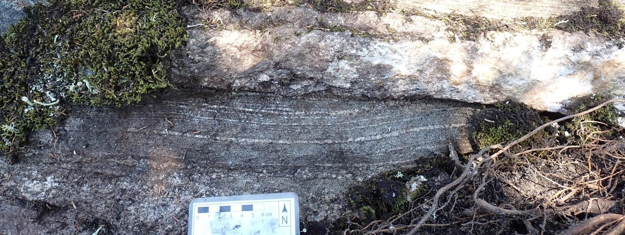 La fabrique principale Sn du Domaine structural de Merlin est essentiellement associée à une foliation tectonométamorphique modérément développée, celle-ci étant observée dans le paragneiss du Complexe de Laguiche et dans les roches intrusives de la Suite de Féron. Elle présente une orientation principale ESE-WNW à E-W. Dans le paragneiss, cette foliation est marquée par l’orientation préférentielle de feuillets de biotite idiomorphes à hypidiomorphes, par la présence locale de mobilisat affichant dans certains cas des textures stromatiques, et plus rarement par un rubanement migmatitique. Dans les roches intrusives de la Suite de Féron, la foliation est marquée par l’orientation préférentielle d’amas de minéraux ferromagnésiens (hornblende-orthopyroxène-biotite) et localement par des textures gneissiques. Sur plusieurs affleurements, il est aussi possible d’observer cette déformation dans les injections de granite concordantes de la Suite de Des Antons, qui présentent par endroits un étirement de certains minéraux (quartz, biotite).