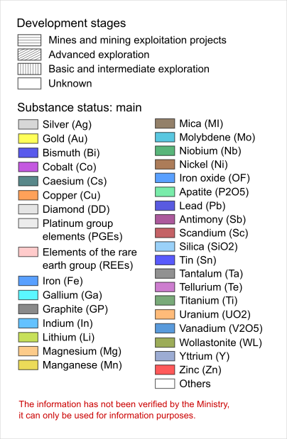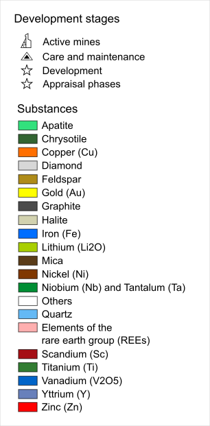 Locate mines and ongoing projects using this map. You can also see exploration properties, active mining titles, and restrictions on mining activity.